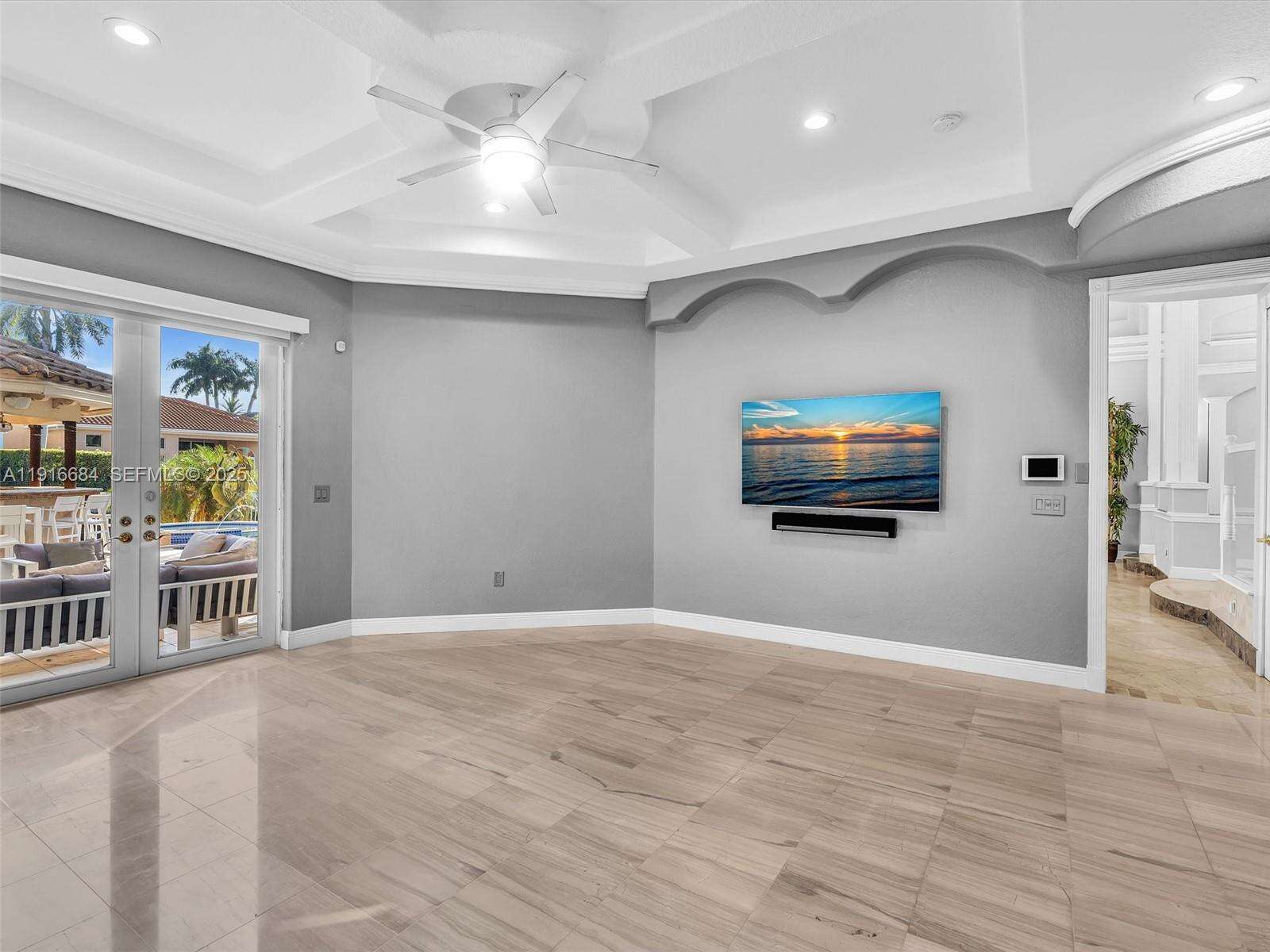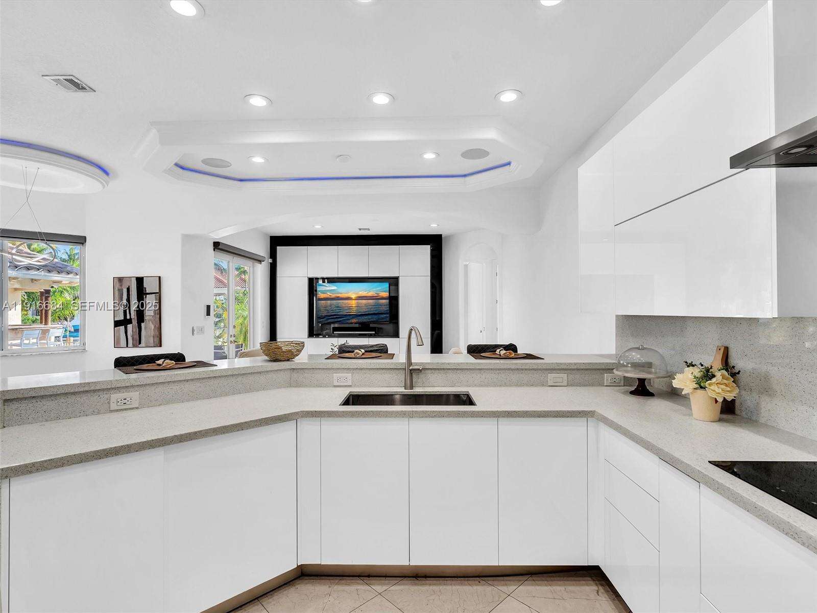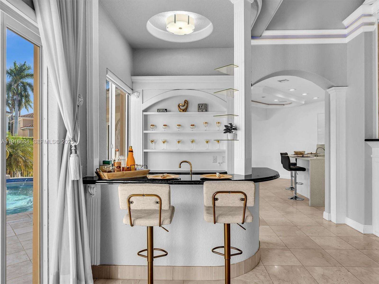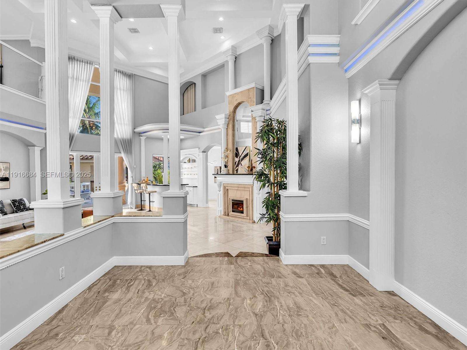 Elegant 5 BD /4.5 BA Mediterranean Villa, featuring a sophisticated triple-split floor plan, soaring ceilings, and marble floors through out. The refined Italian Kitchen includes premium high-end appliances. All bedrooms are on the main level, complemented by entire- home surround sound and automatic Somfy shades. A fireplace with a custom mantle enhances the naturally lit living space, with an upstairs loft overlooking the great room ideal for a media lounge, gym or game room. Outdoors, enjoy a resort-style pool, a Covered outdoor bar complete with a spacious countertop - stool seating, an additional cabana bath and outdoor shower - an entertainer's dream for hosting, offering resort living at it's finest. Enjoying 86 ft of tranquil waterfront, and a private dock. This home is waiting for you- and your boat and jet skis - for true South Florida living. Exceptionally located close to pristine beaches, acclaimed dining, and major highways-this residence delivers timeless luxury and unmatched convenience.