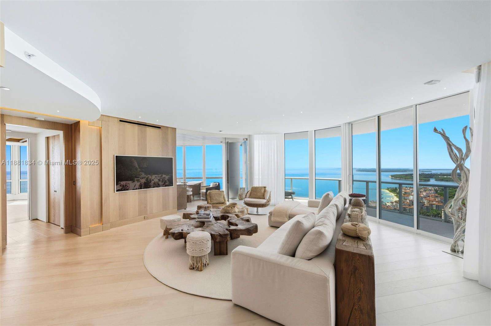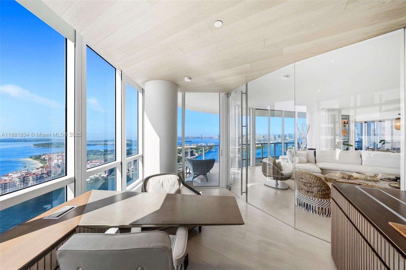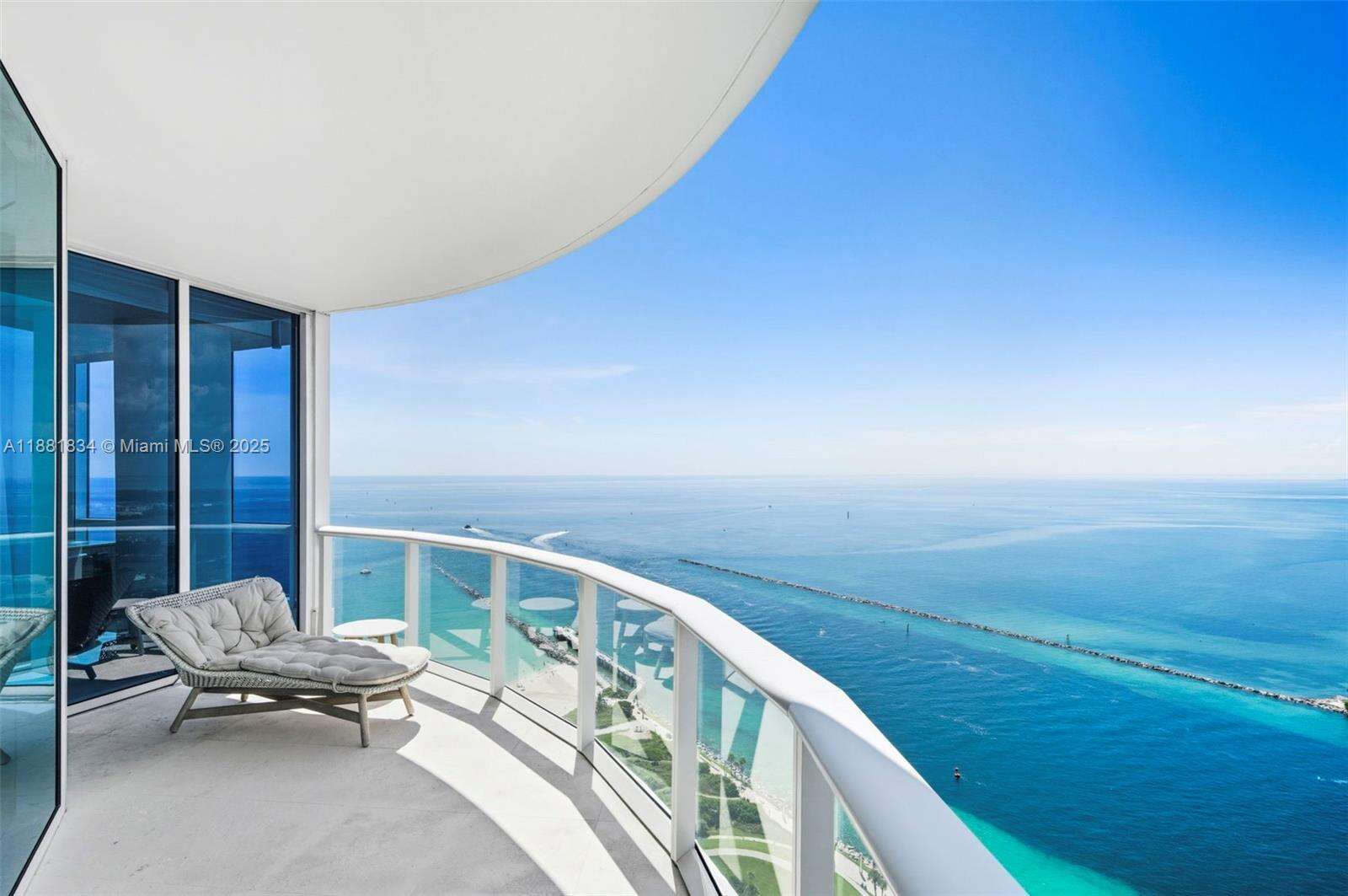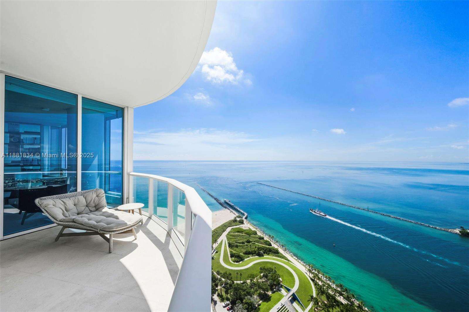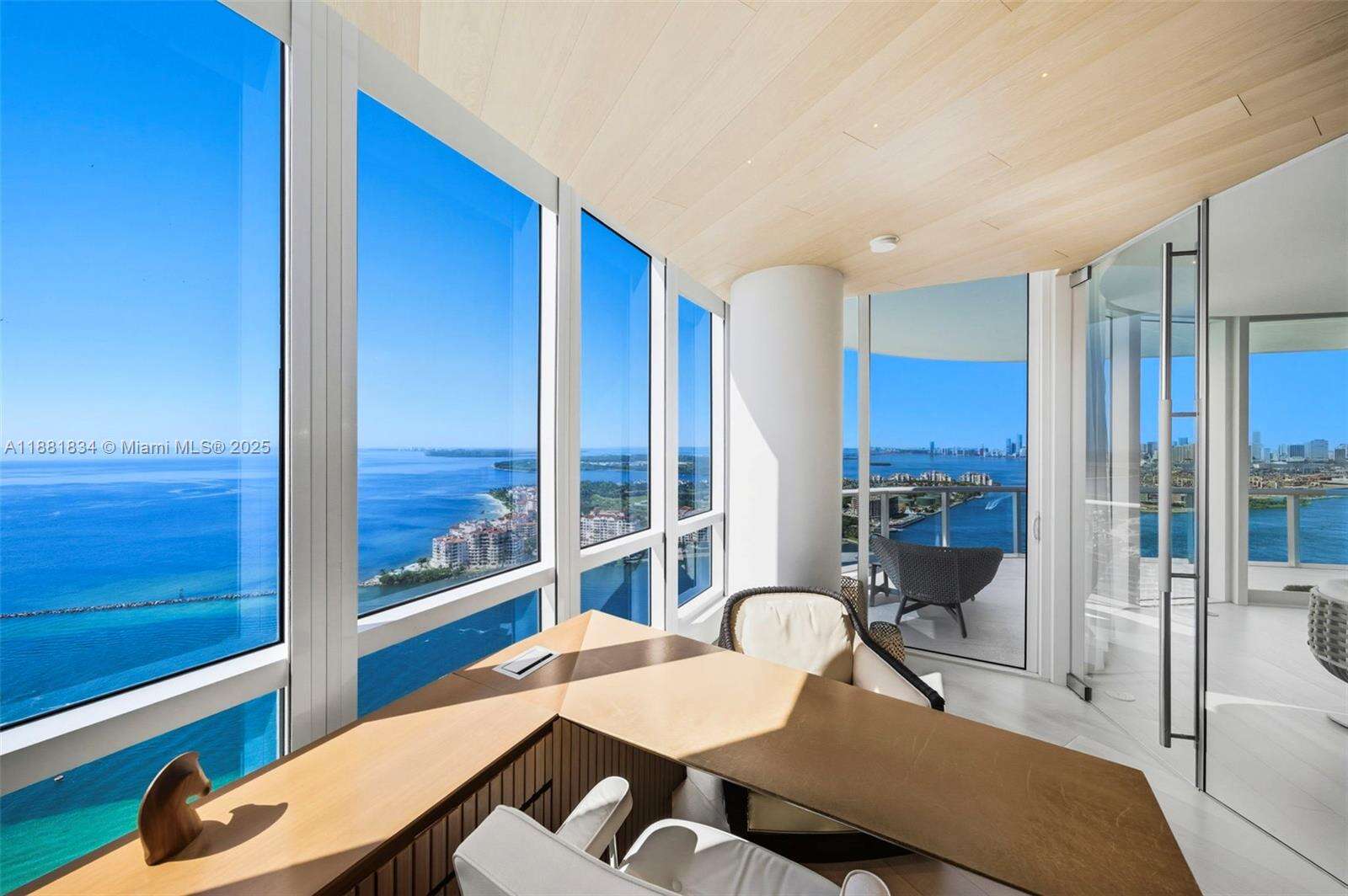 Have it all at CONTINUUM 3803, a turnkey 5,049 SF sky residence beyond compare. From Atlantic sunrise to skyline sunset, this architectural marvel by Kobi Karp boasts coveted SE-to-SW exposures. Arrive via private elevator into a grand foyer clad in fluted white oak, unveiling jaw-dropping panoramas. The grand salon stuns with a curved glass wall and retractable doors, seamlessly blending indoor/outdoor living. Curved ceilings, architectural lighting, and custom drapery enhance the refined atmosphere. Zen-inspired principal suite offers a private sunrise terrace, bath w/Dornbach fixtures, dressing rm & rich millwork. Hans Krug kitchen showcases a wood + stone island, breakfast nook, and Miele appl. Dual oceanfront offices, media room & oversized laundry rm complete this seaside sanctuary.