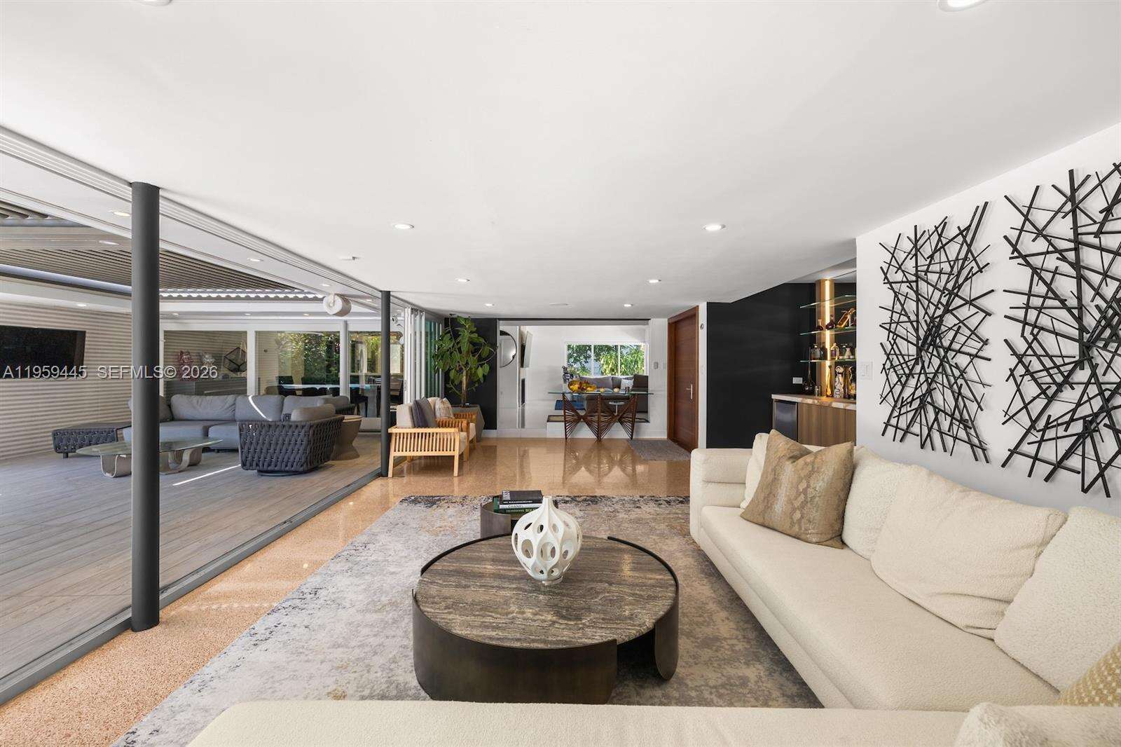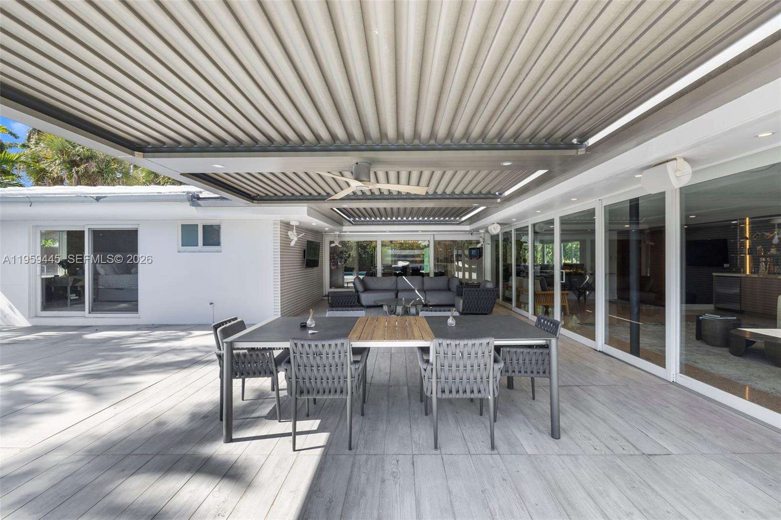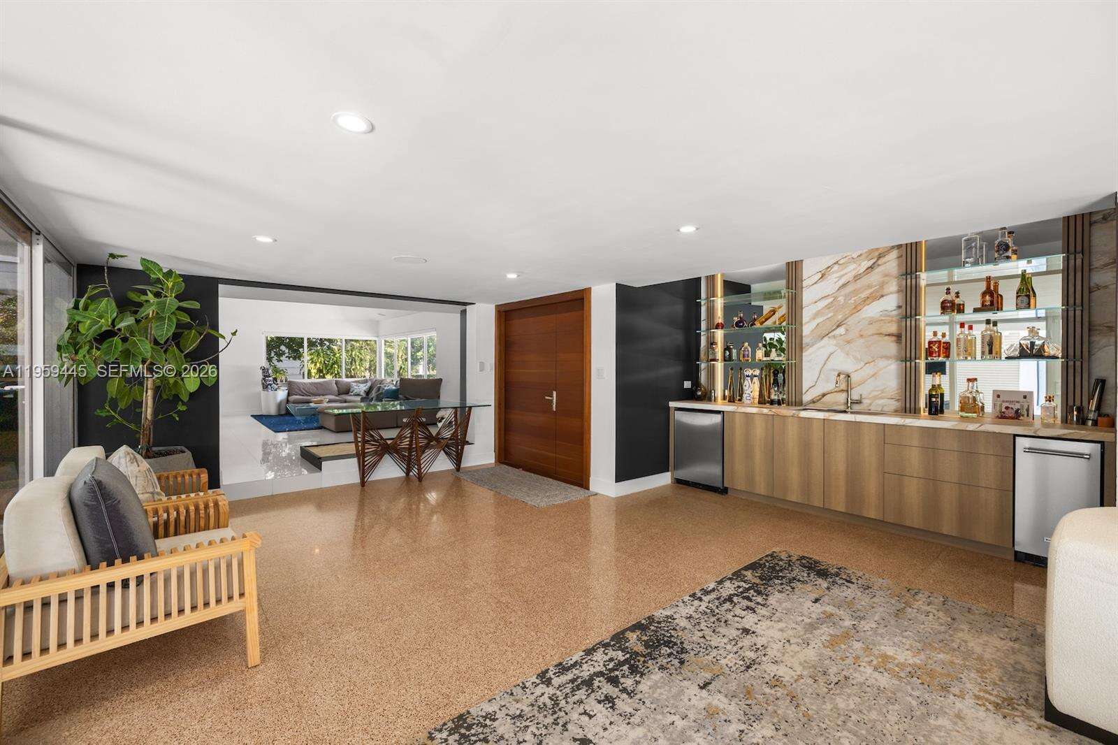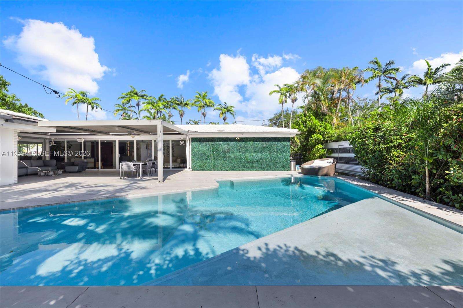 Designed with entertaining in mind, this beautifully upgraded home offers the ultimate South Florida lifestyle. Located at 1040 NE 86th St, this extensively renovated residence offers 2,988 SF of thoughtfully designed living space, featuring 2 bedrooms and 3 bathrooms. Blending timeless design with modern upgrades, the home showcases terrazzo and white tile flooring throughout. The spacious and functional layout is ideal for both comfortable daily living and hosting guests. A dedicated entertainment room serves as a standout feature, complete with a fully customized wet bar, creating the perfect space for gatherings and celebrations. The spacious primary suite is thoughtfully designed with two custom walk-in closets, a fingerprint-access automatic door lock for added security, and sliding glass doors offering direct access to the backyard retreat. Designed to embrace South Florida’s indoor-outdoor lifestyle, the outdoor space features a saltwater pool, covered lounge areas, new patio stonework, astroturf landscaping, and updated fencing. Integrated surround sound speakers extend throughout both the interior and exterior of the home, creating a seamless entertainment experience. Additional highlights include a two-car covered garage, a laundry room conveniently located just off the kitchen, a full security camera system, and high-impact windows for enhanced safety and peace of mind.