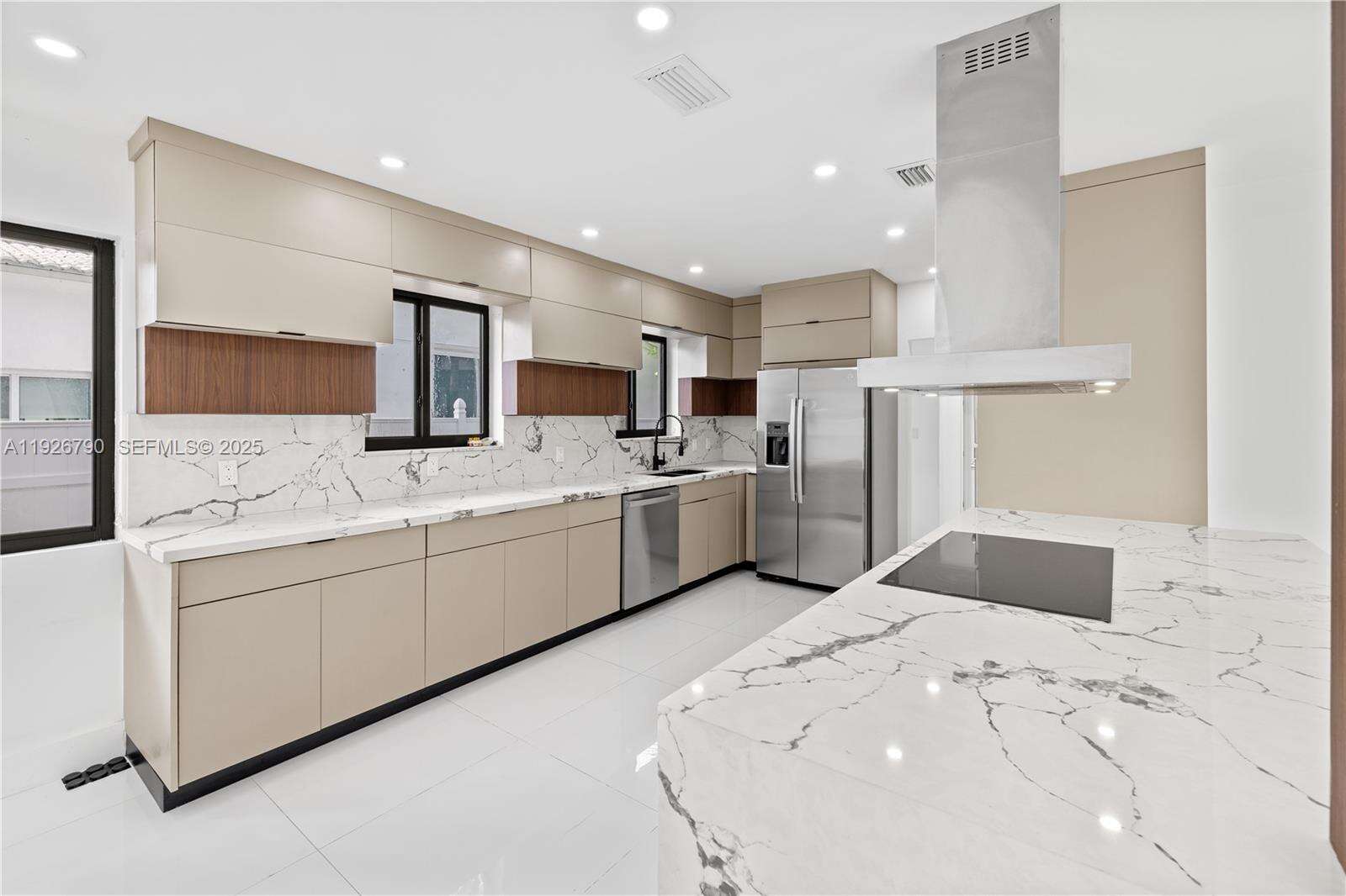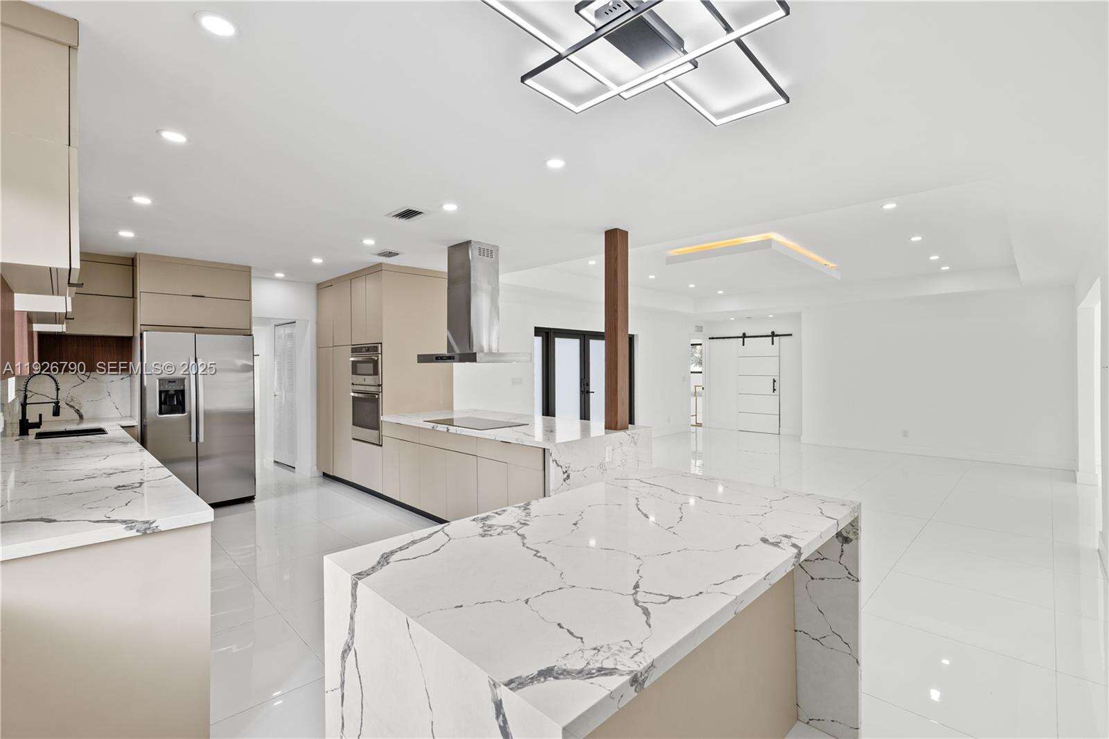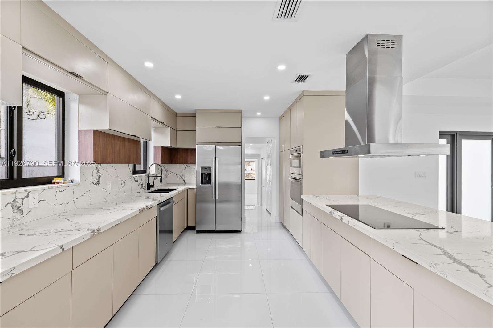 Stunning 4BD/3BA waterfront residence in the exclusive, guard-gated community of Biscayne point. This renovated home features expansive modern flooring, a brand new kitchen with premium finishes, and an open layout that seamlessly blends indoor and outdoor living. The private backyard is an oasis with a sparkling pool, lush landscaping and serene canal views. Enjoy direct water access from your dock. Please note fixed-bridge clearance for boating. Move-in-ready property. Easy to show.