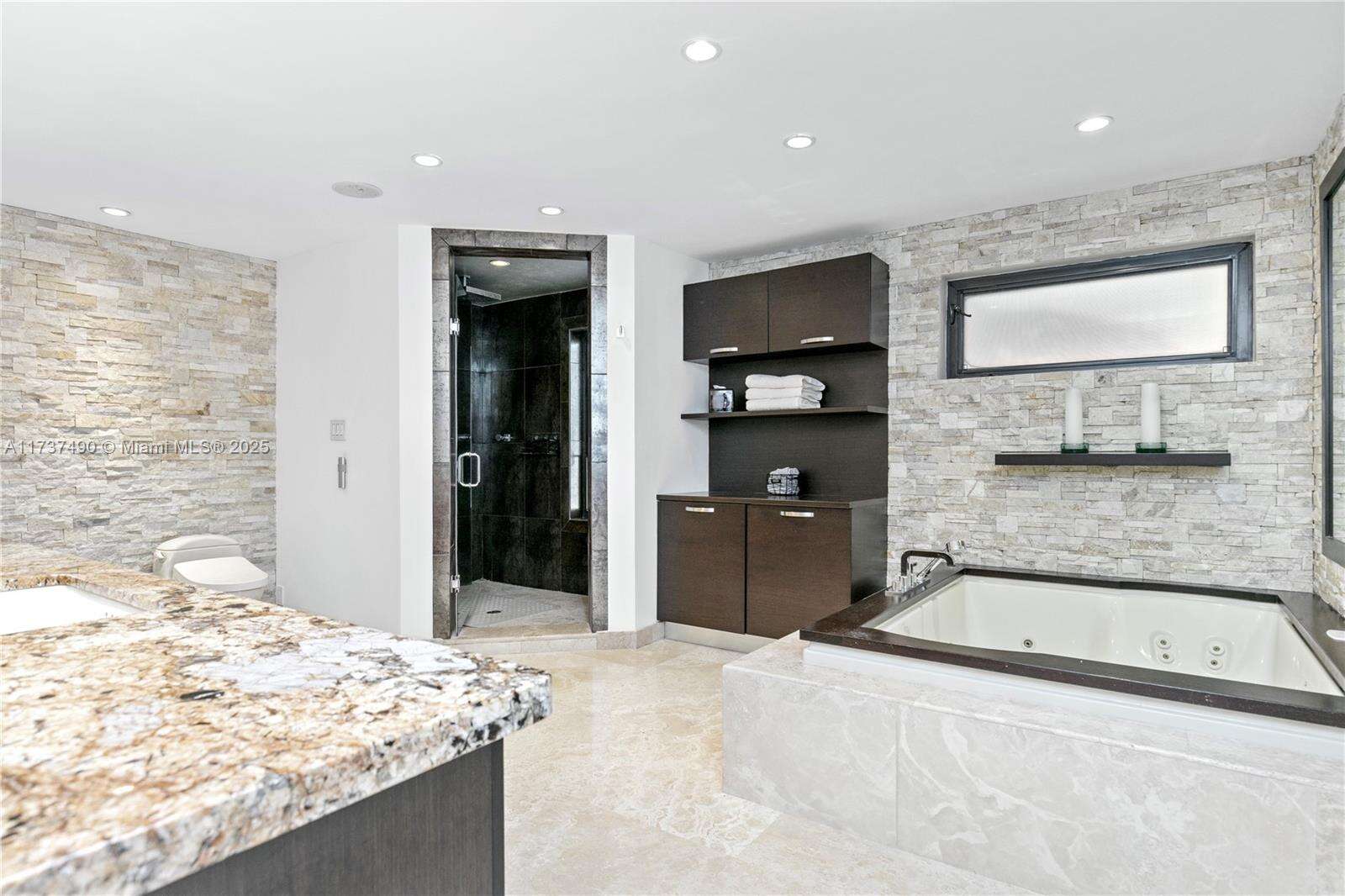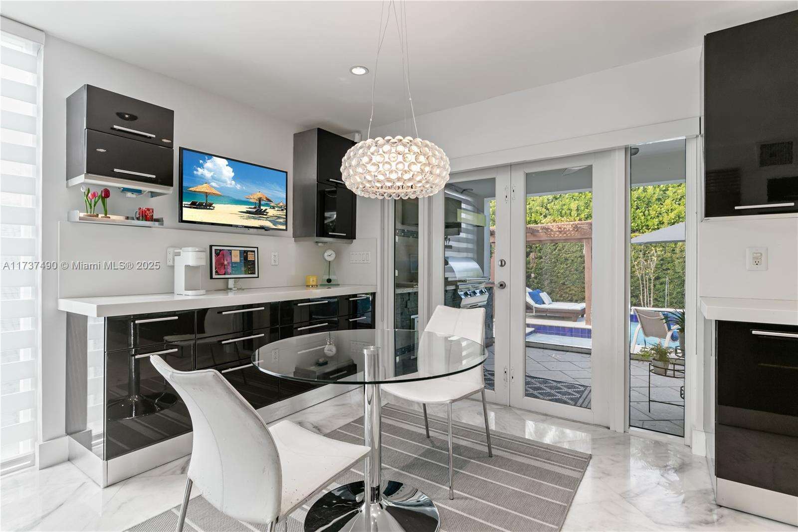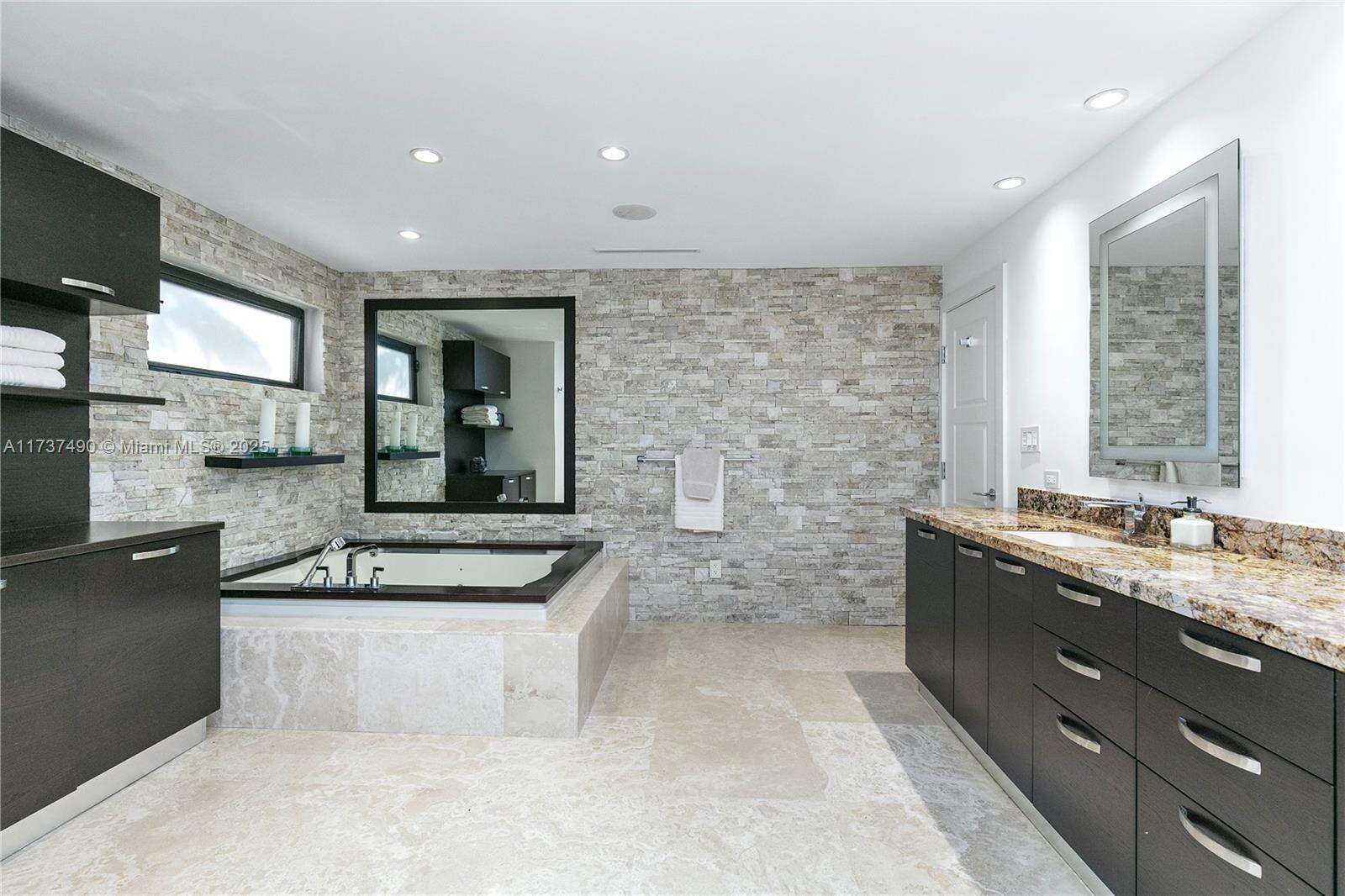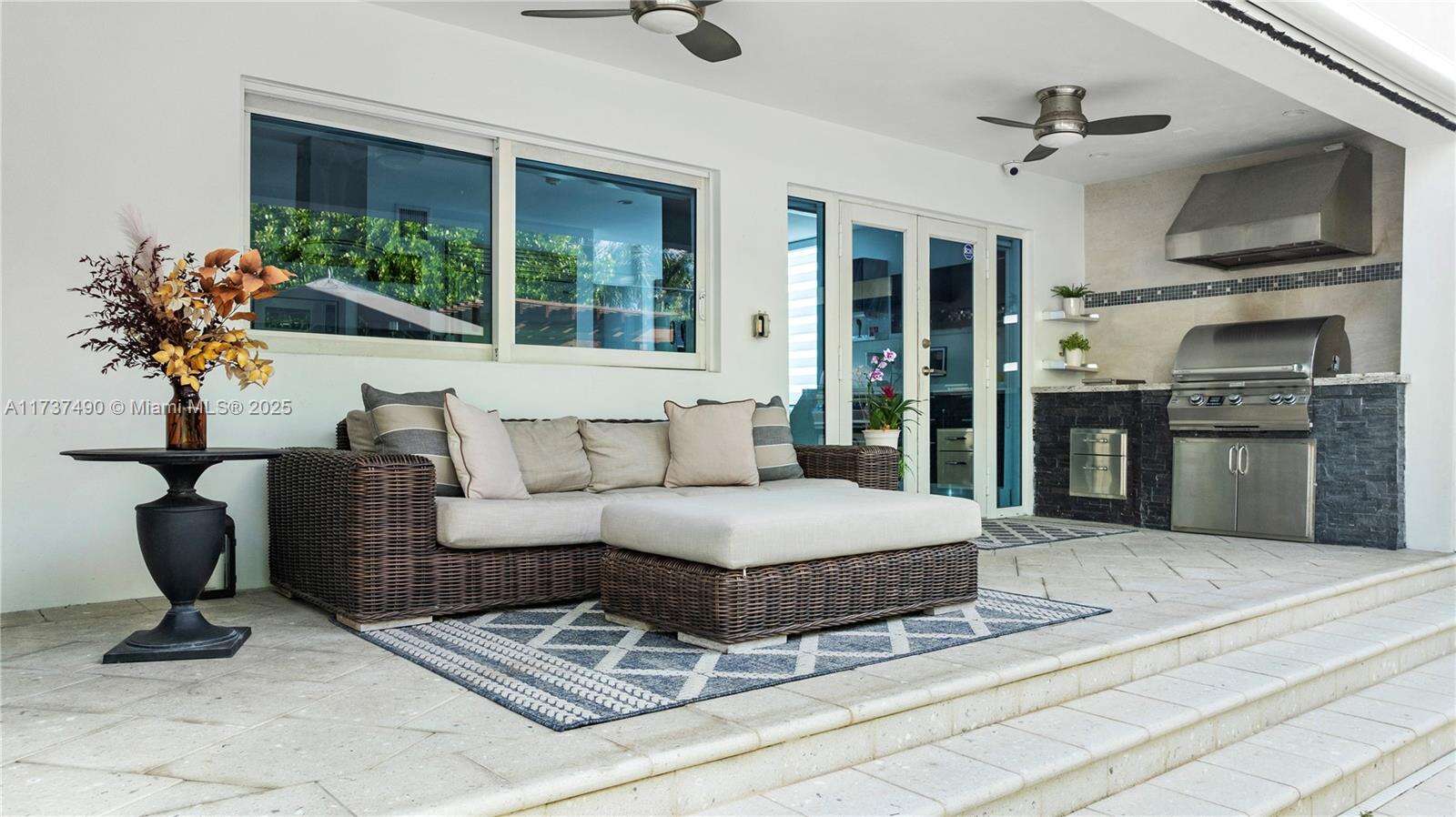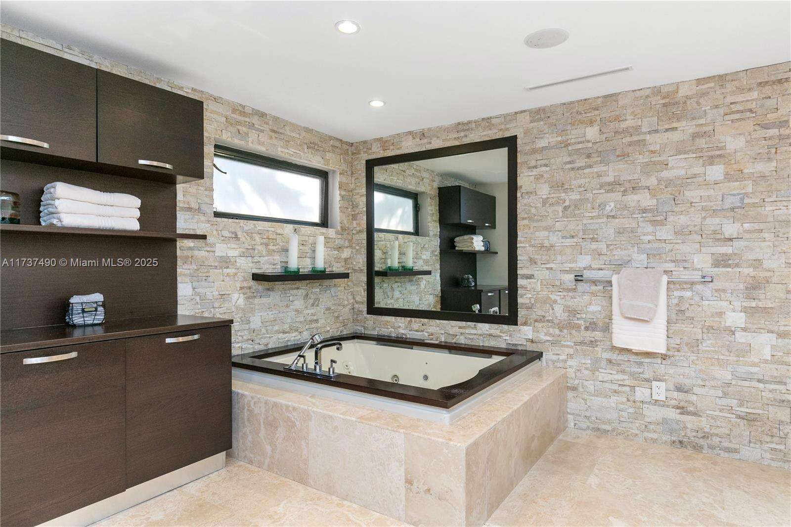 Located in Bay Harbor Islands, one of the most coveted neighborhoods in Miami, is this 5090sqft mid-century modern home rebuilt in 2009! This exquisite property has 4 large ensuite bedrooms, an expansive office and a spacious den. Other features include high ceilings, impact windows, natural woods, stone accents, smart home technology, surround sound, electric blinds, and redone electric & plumbing. The chef's kitchen has top-of-the-line Miele and Subzero appliances. The primary suite includes 3 closets, a spa-like bath with a multi jetted shower and a balcony. Paradise is in the backyard with a custom pool, jacuzzi, sun shelf, summer kitchen, pergola, pool bath, lush landscaping & a butterfly garden. Amazing location: walk to the beach, cafes, shopping, A+ schools, tennis & parks. NO HOA