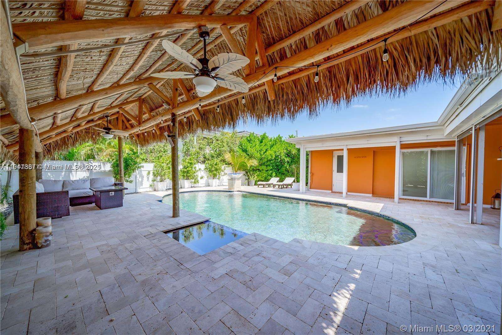 AVAILABLE 12/20/2025 Gorgeous Tropical Retreat!No detail was missed remodeling this exquisite home.Private backyard surrounded by lush, new landscaping is truly a hidden oasis. Have a fun day in the Sun under your luxurious massive Tiki Hut or relax by the majestic saltwater heated pool w/ spectacular gas fire torch waterfall, river rock & jacuzzi. Fabulous Travertine patio. Impact windows & doors. Plantation Shutters.Open beautiful kitchen w/ granite countertops & tile backsplash. Master suite is spacious w/ a large bathroom w/ glass shower door & direct access to the pool & patio.Highlights include new pool pump ¢ral AC,new sprinkler system w/well, 24" porcelain tiles throughout living area & kitchen.Close to the Beach restaurants &shopping. HOUSE IS RENTED FULLY FURNISHED!