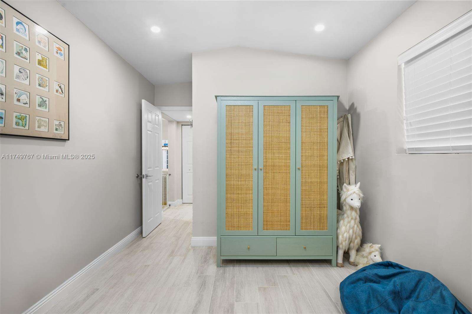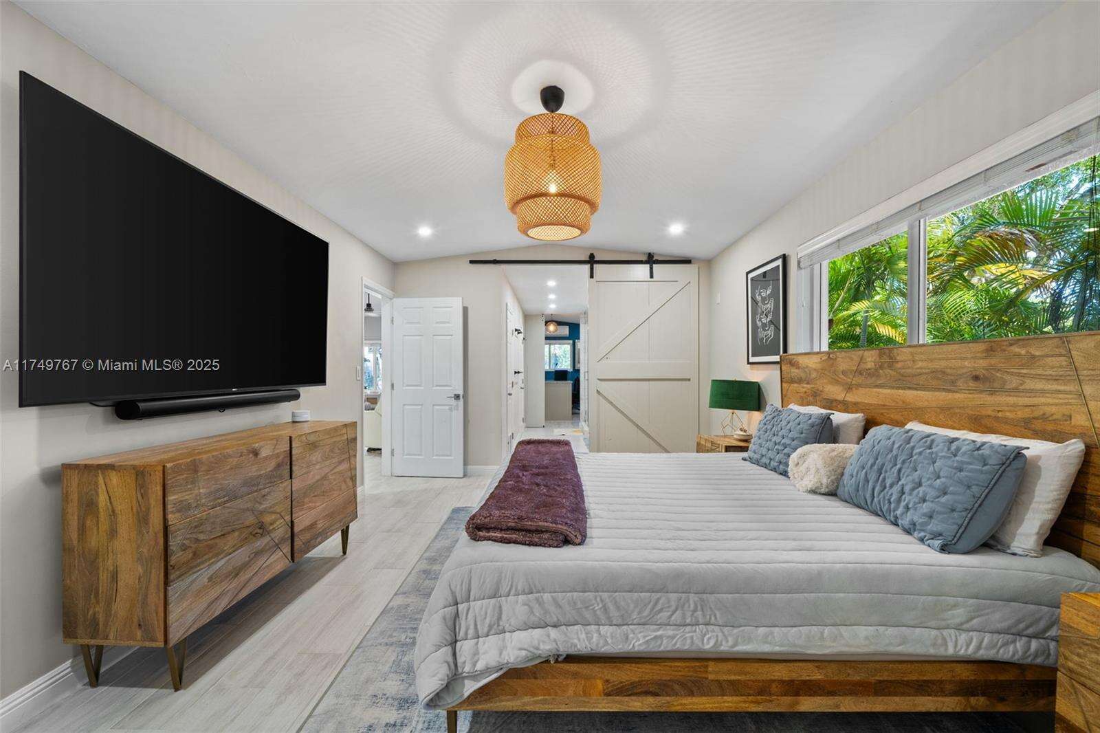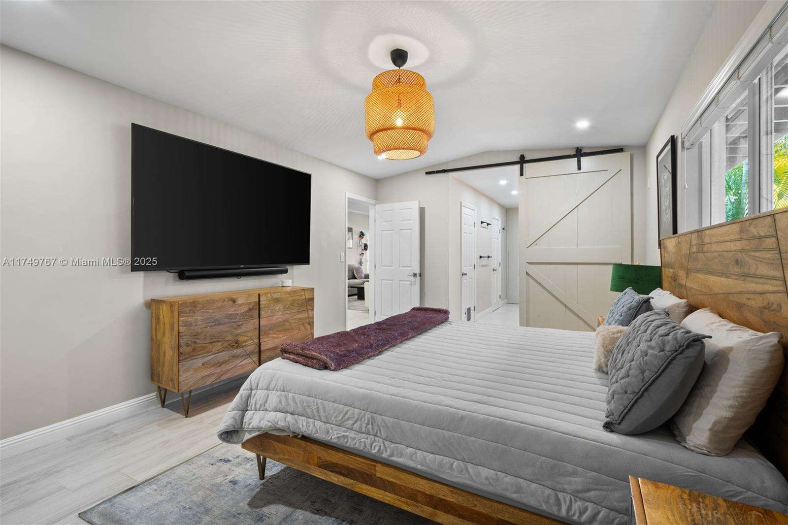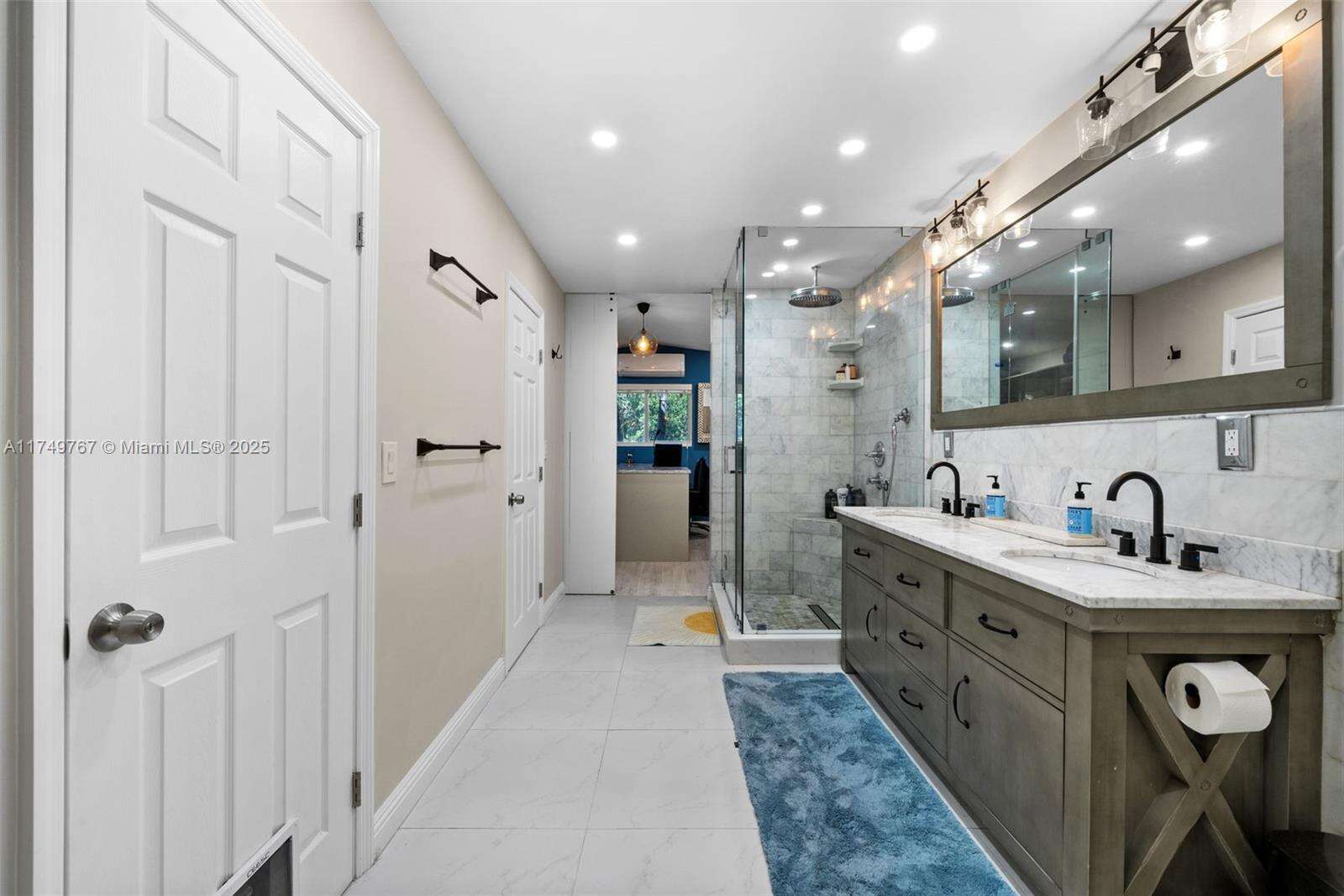 Stunningly renovated home in Hollywood Lakes! This gem combines modern elegance with timeless charm. The Primary Suite boasts a custom walk-in closet (easily converts back to a 5th bedroom), quartz island vanity, additional dual closets, double vanity, and a glass-enclosed shower. Spacious living areas include a grand family room, formal dining, and a versatile Florida room. Upstairs, a full kitchen, bath, and two large bedrooms provide a perfect guest or staff retreat. The private backyard oasis features a pristine pool and lush landscaping for the ultimate in privacy, relaxation, and entertainment. Full impact protection. Built-out garage with a laundry room. A Beautiful Home! Make It Rein!