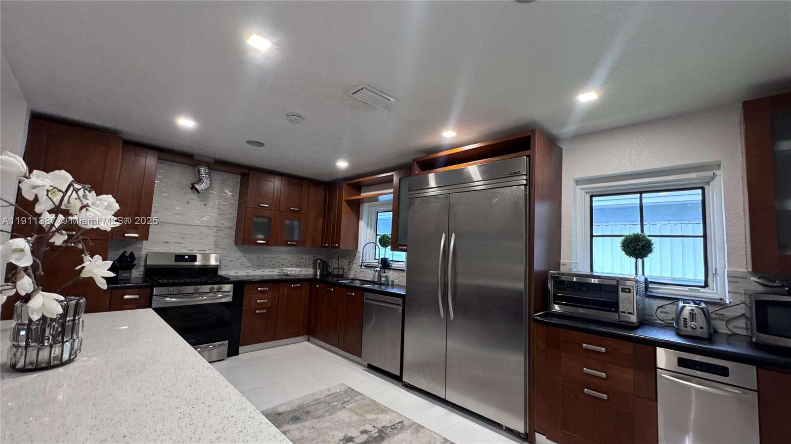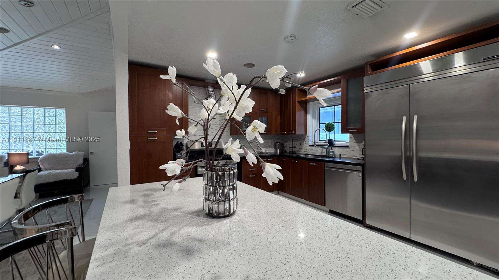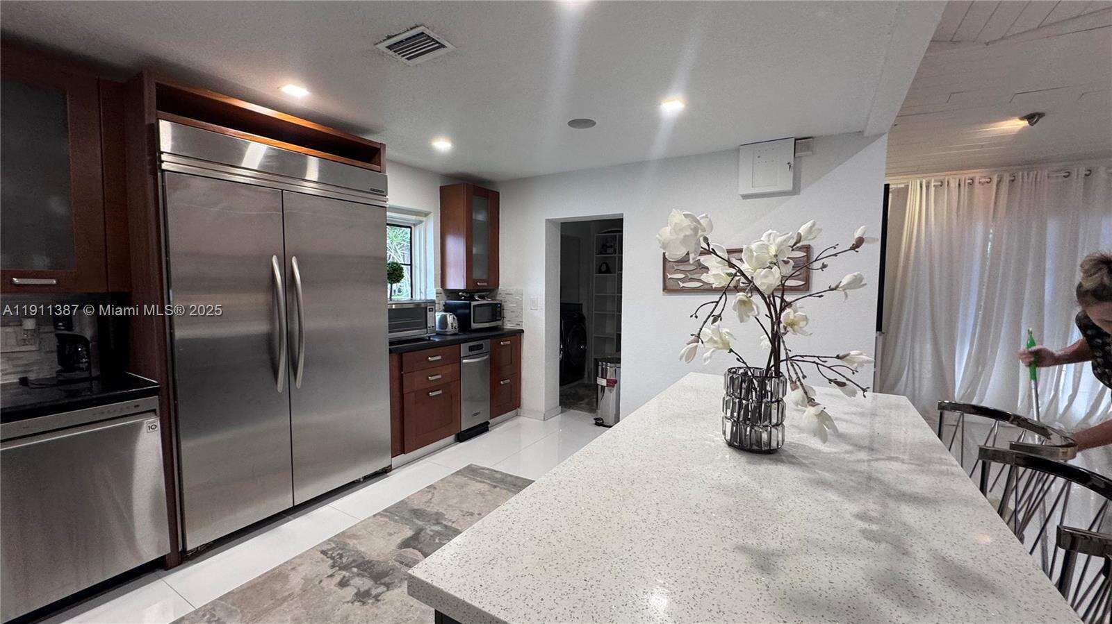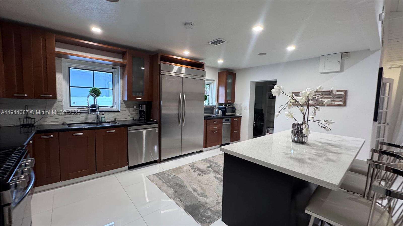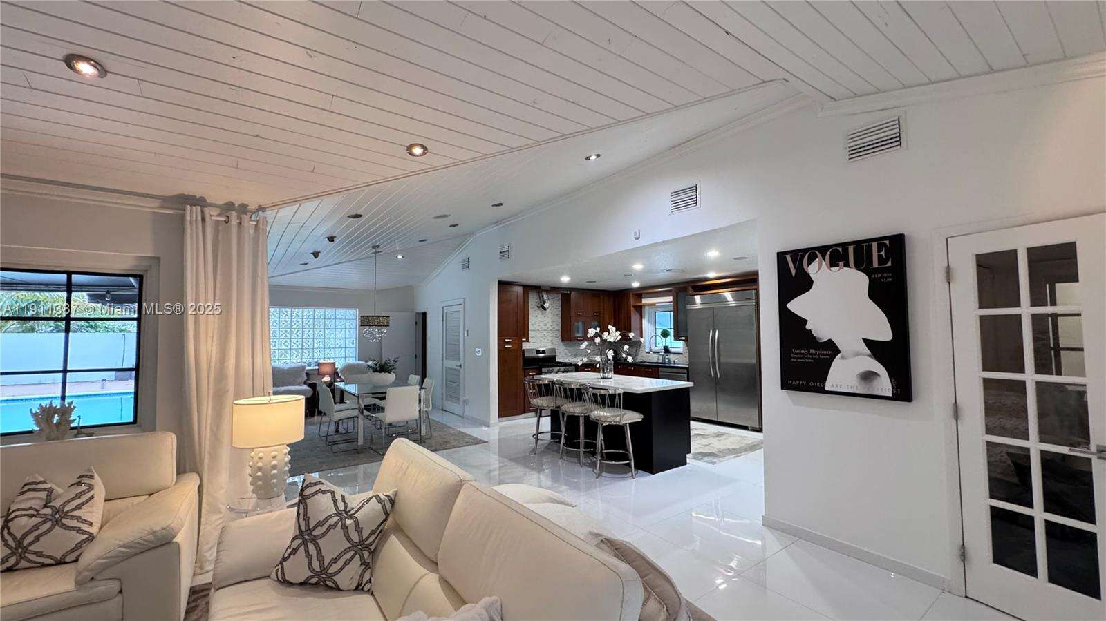 AVAILABLE 01/21/2026 -GORGEOUS fully furnished & ONLY FURNISHED gem in the heart of Hollywood Lakes, around the corner from Southlake and Hollywood downtown and 1/2 mile to the beach .This amazing 3BR+DEN /2BA with private pool, outdoor patio with sitting area,is fully furnished and totally remodeled. The great design makes this house a very unique one of kind for the the neighborhood. Very private and secluded with a fence and hedges amazing open kitchen/stainless steel appliances/huge living room with formal dining room overlooking the quiet backyard and pool is great for entertainment,l ots of light and great energy .Beautiful white glass floors throughout the house ,very easy to maintenance. Laundry room w.Commercial size washer dryer.2 king size beds full plus pull out sofas in media