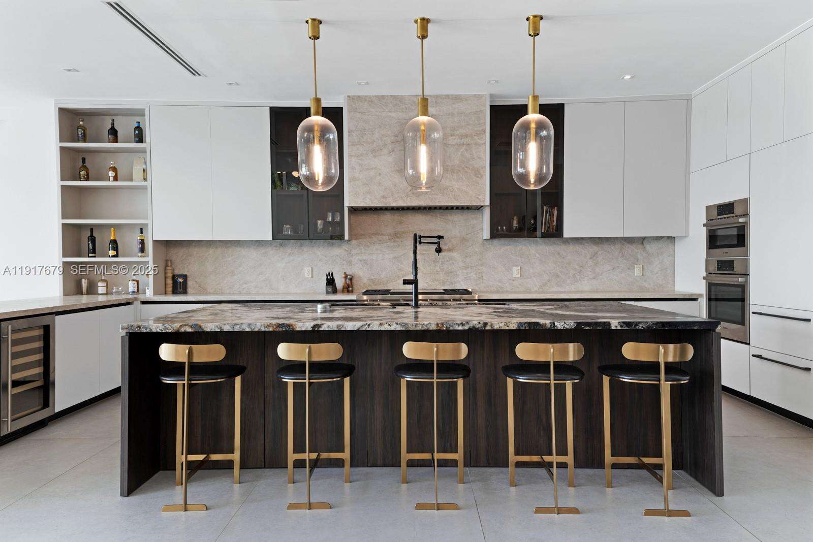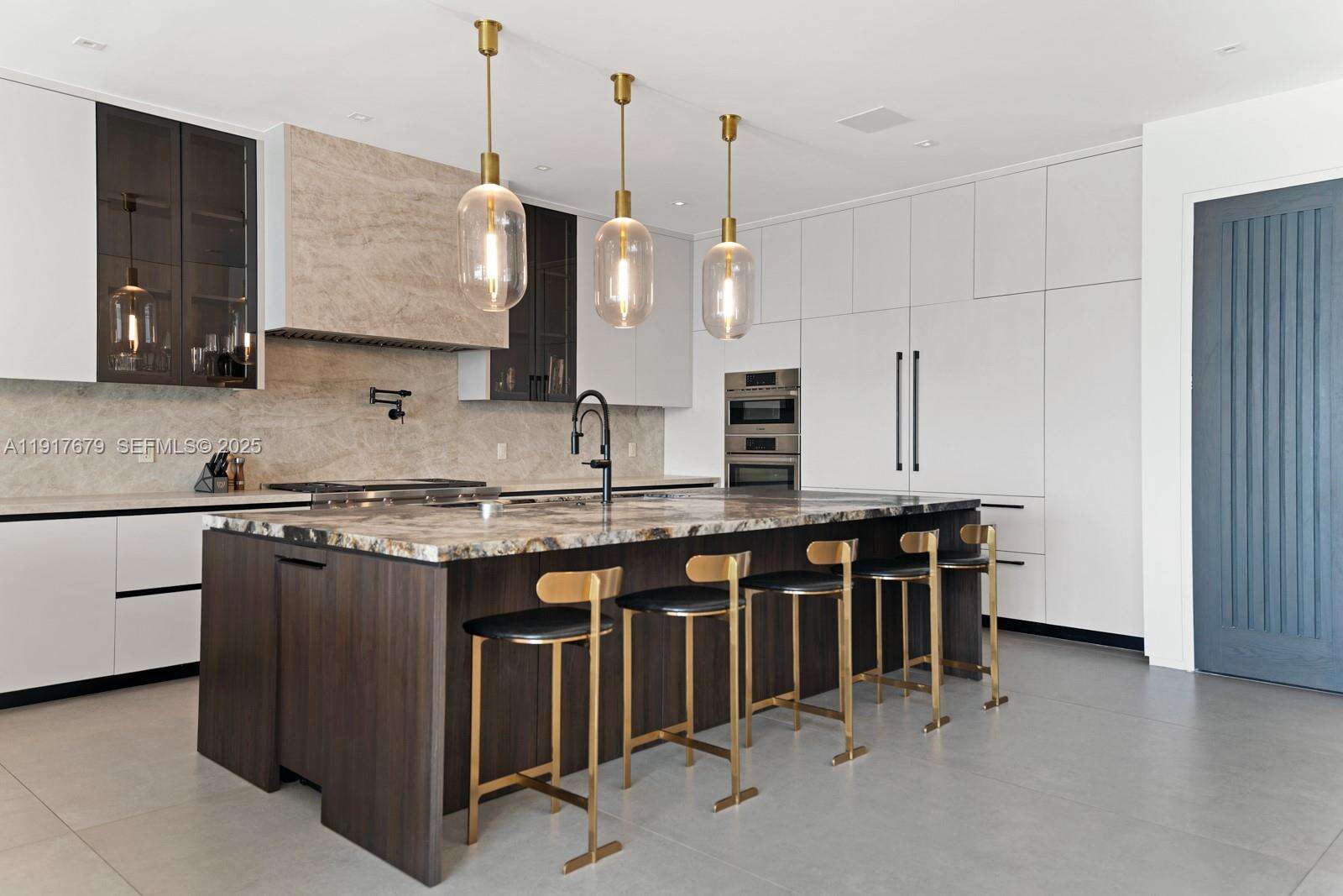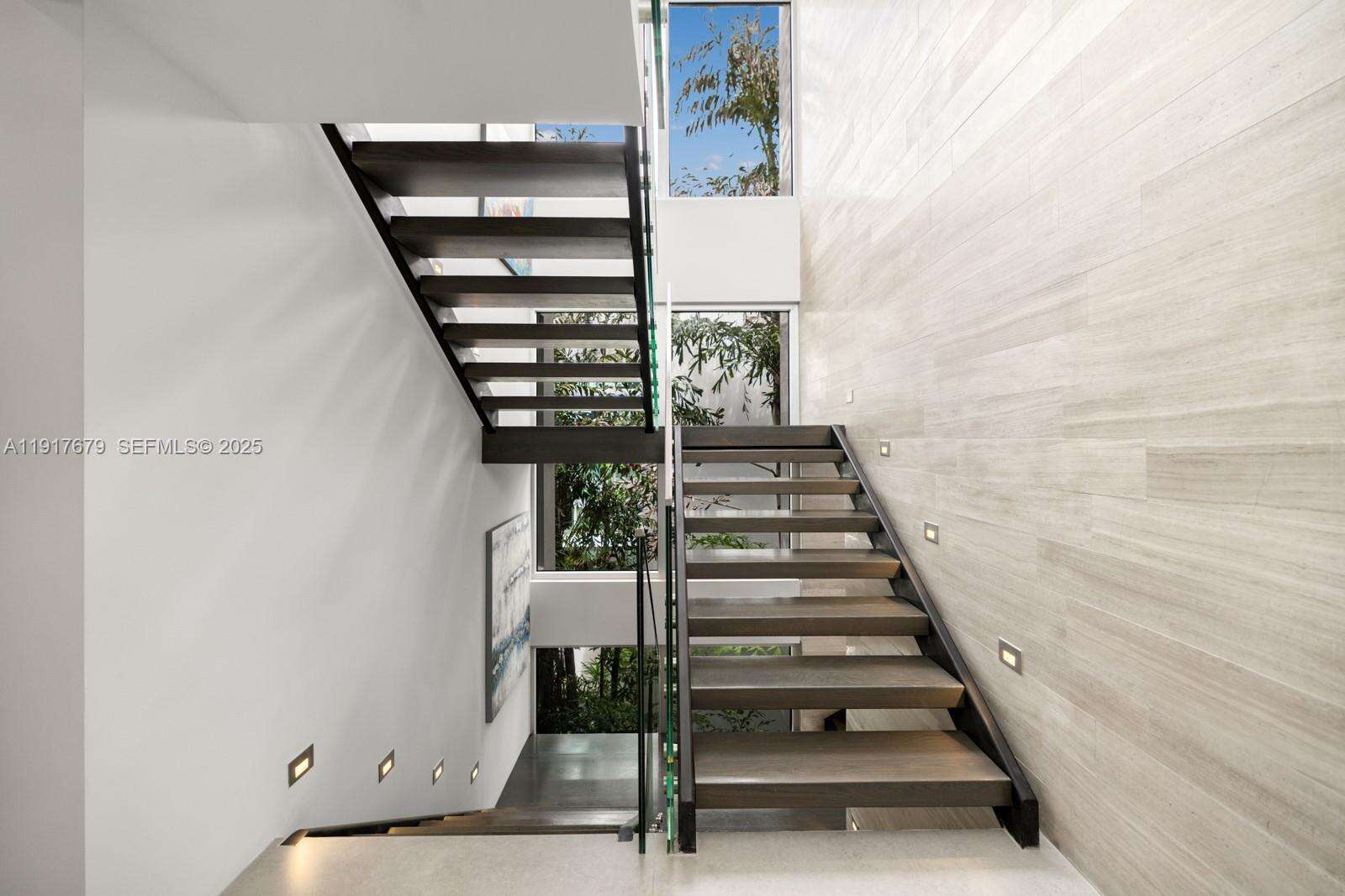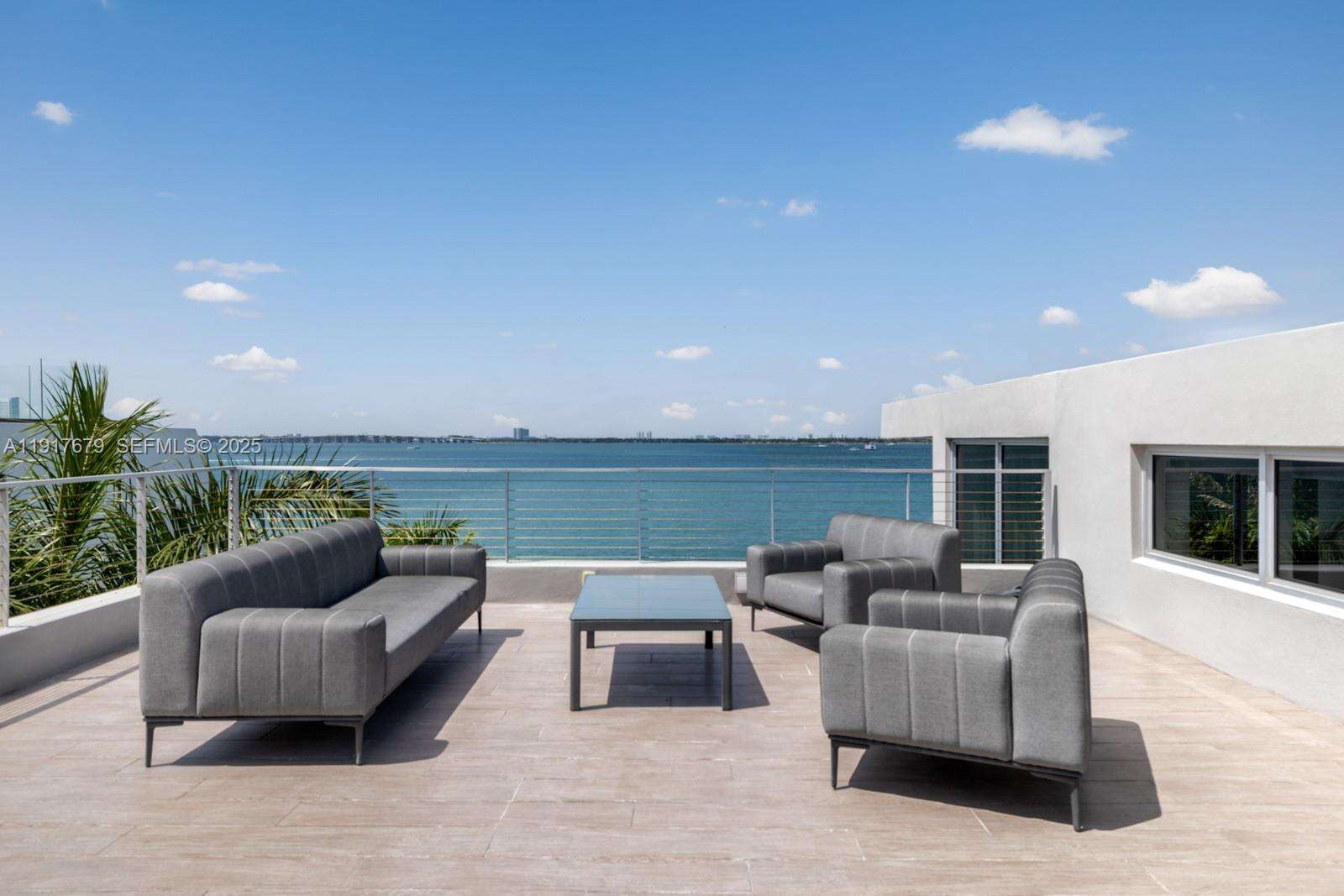 Experience the ultimate blend of waterfront serenity & modern luxury in this 5BD/5BA masterpiece, inspired by earthy sophistication. Enjoy 60' of open bay water frontage, a heated saltwater Infinity-edge pool & outdoor lounging areas. Grand open living spaces transition effortlessly to the outdoors, creating an ideal setting for entertaining. A sleek sunroom with floor-to-ceiling glass captures natural light & opens to an expansive rooftop terrace. Inside, the chef’s kitchen is outfitted with Taj Mahal quartzite, a custom island, bespoke cabinetry & Subzero/Wolf appliances. Travertine-clad walls & ambient-lit stairs frame the foyer. Primary suite features custom millwork, infinity leather-wrapped panel & steam shower. RH furnishings & curated finishes complete this one-of-a-kind residence.