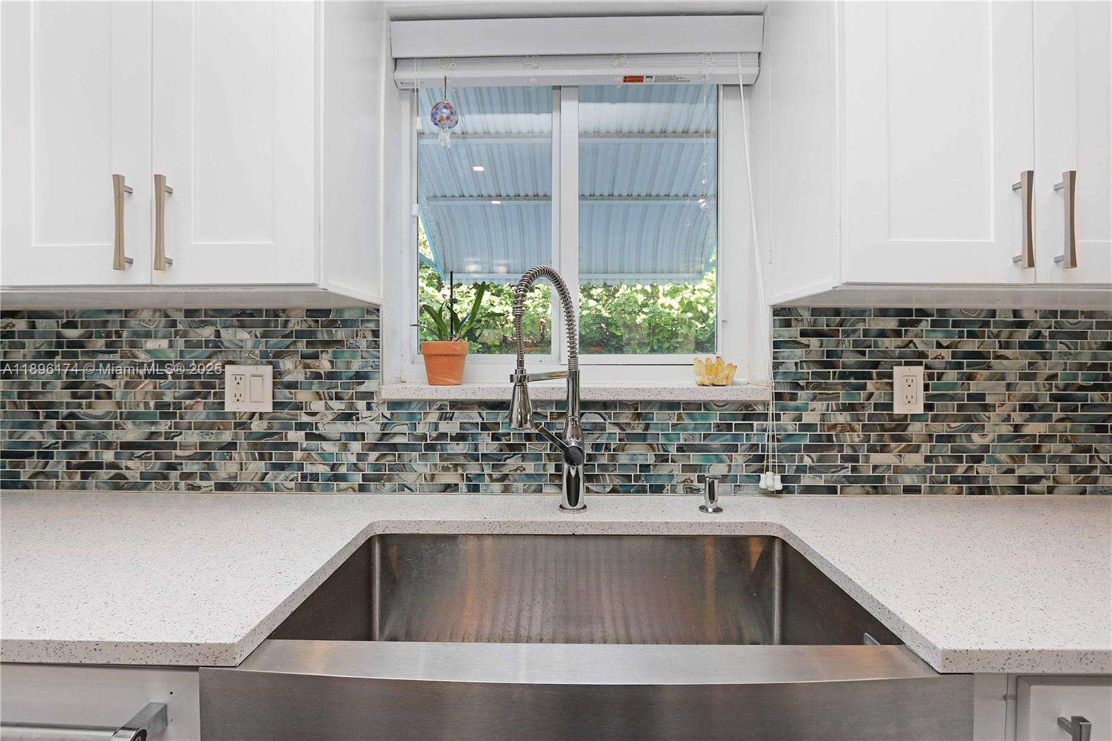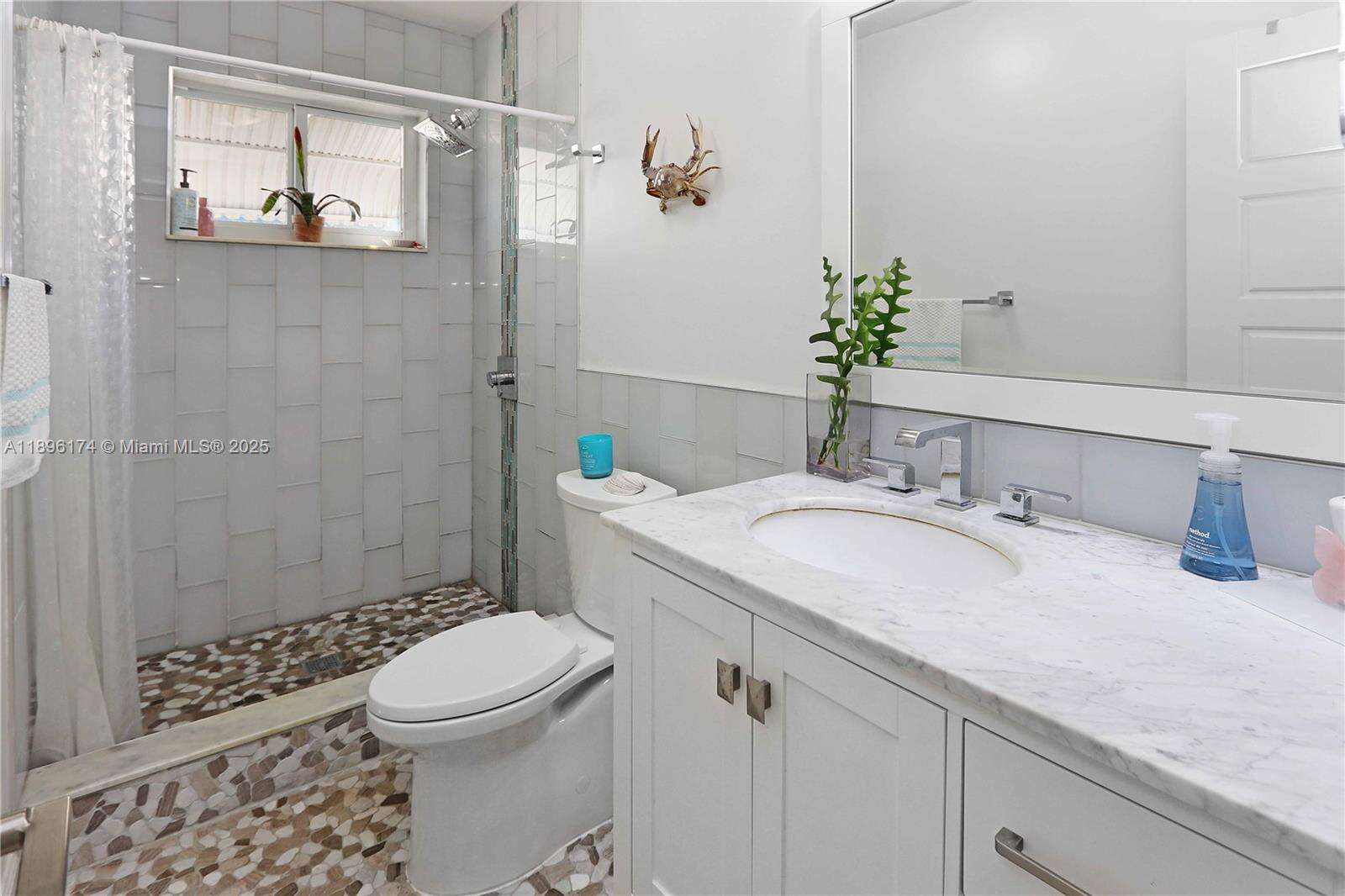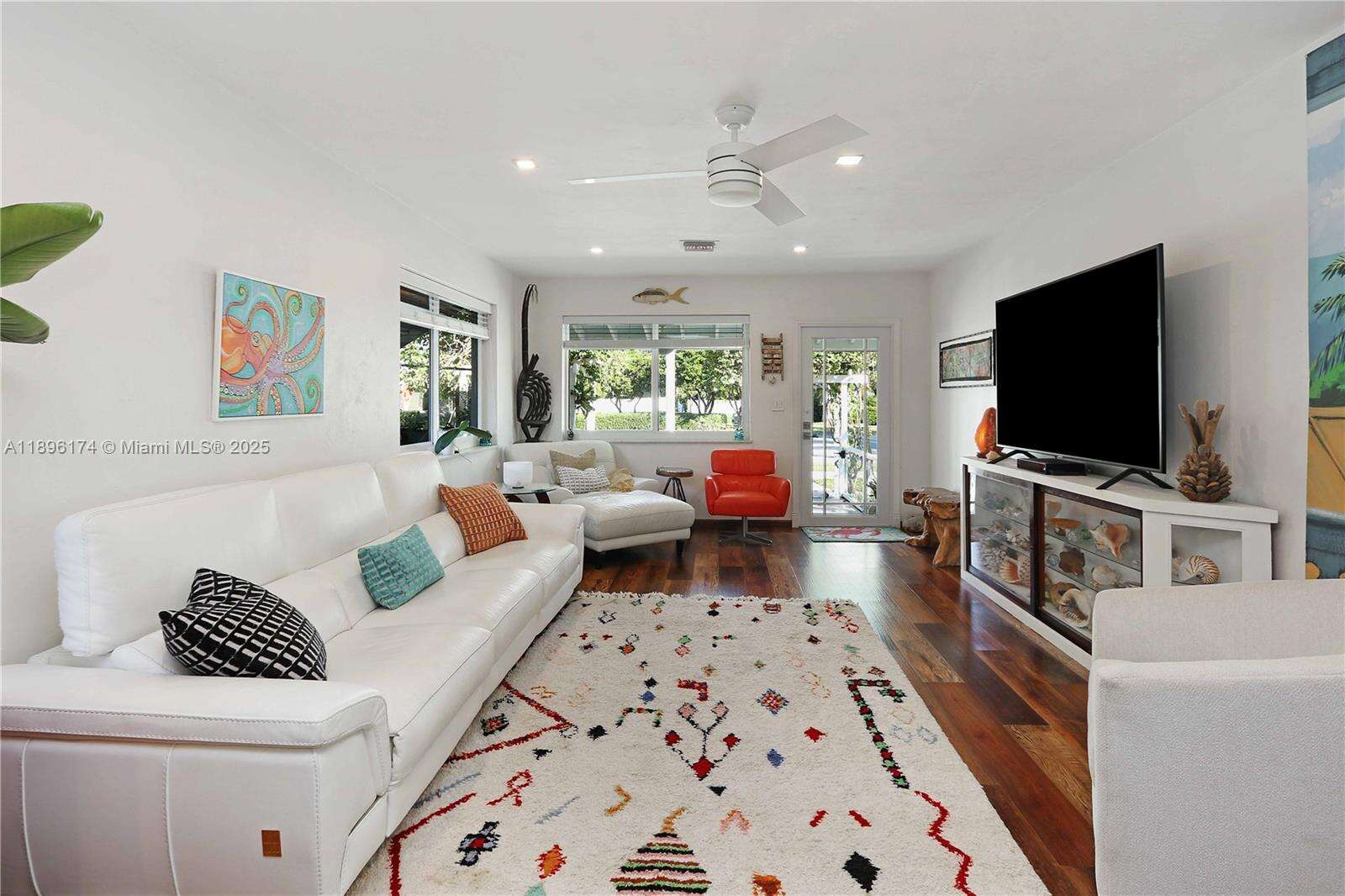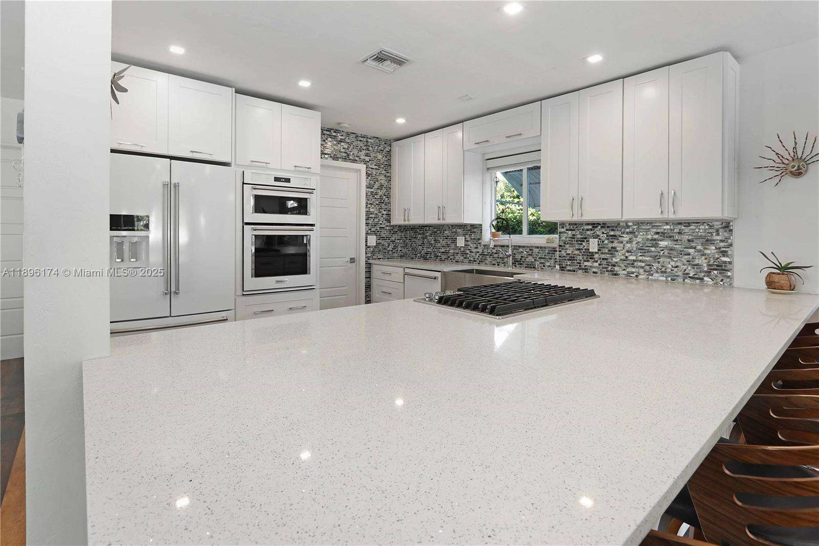 Beautifully updated 2-bed, 2-bath home with a 1-car garage! Inside features luxury vinyl plank flooring, modern lighting, and an open layout that connects the living, dining, and family rooms around a stunning central kitchen. The kitchen features quartz counters, a gas cooktop, double oven, stainless farmhouse sink, KitchenAid appliances, and soft-closing cabinetry. Both bathrooms are elegantly updated with stone floors, glass mosaic tile, and marble vanities. The spacious primary suite includes a spacious closet w/ a barn door and direct access to the fenced backyard. Enjoy outdoor living under the gazebo or on the patio, ideal for entertaining. Impact windows and doors, Bosch washer/dryer, tankless water heater. Every detail of this home feels cared for and ready to love.