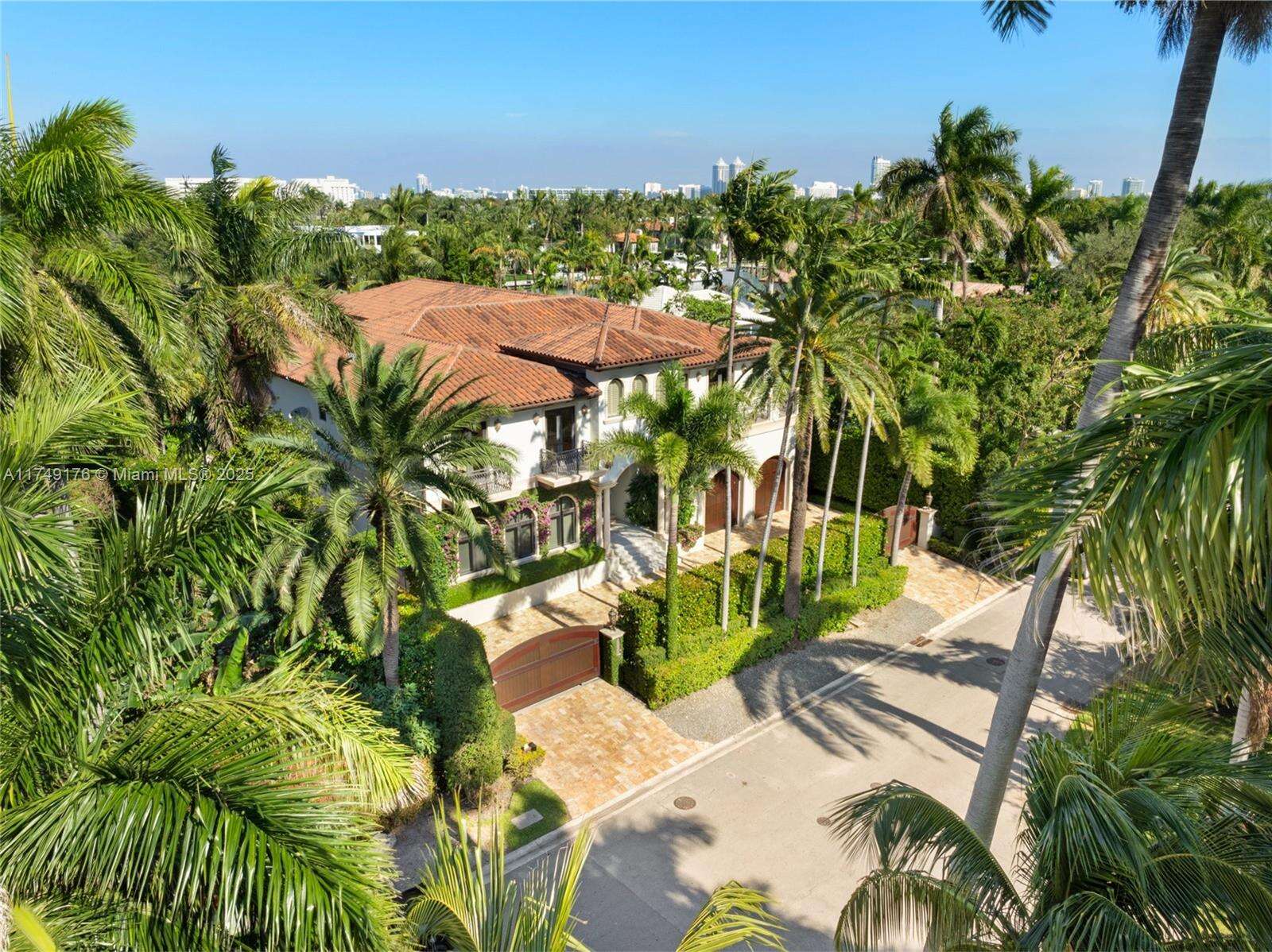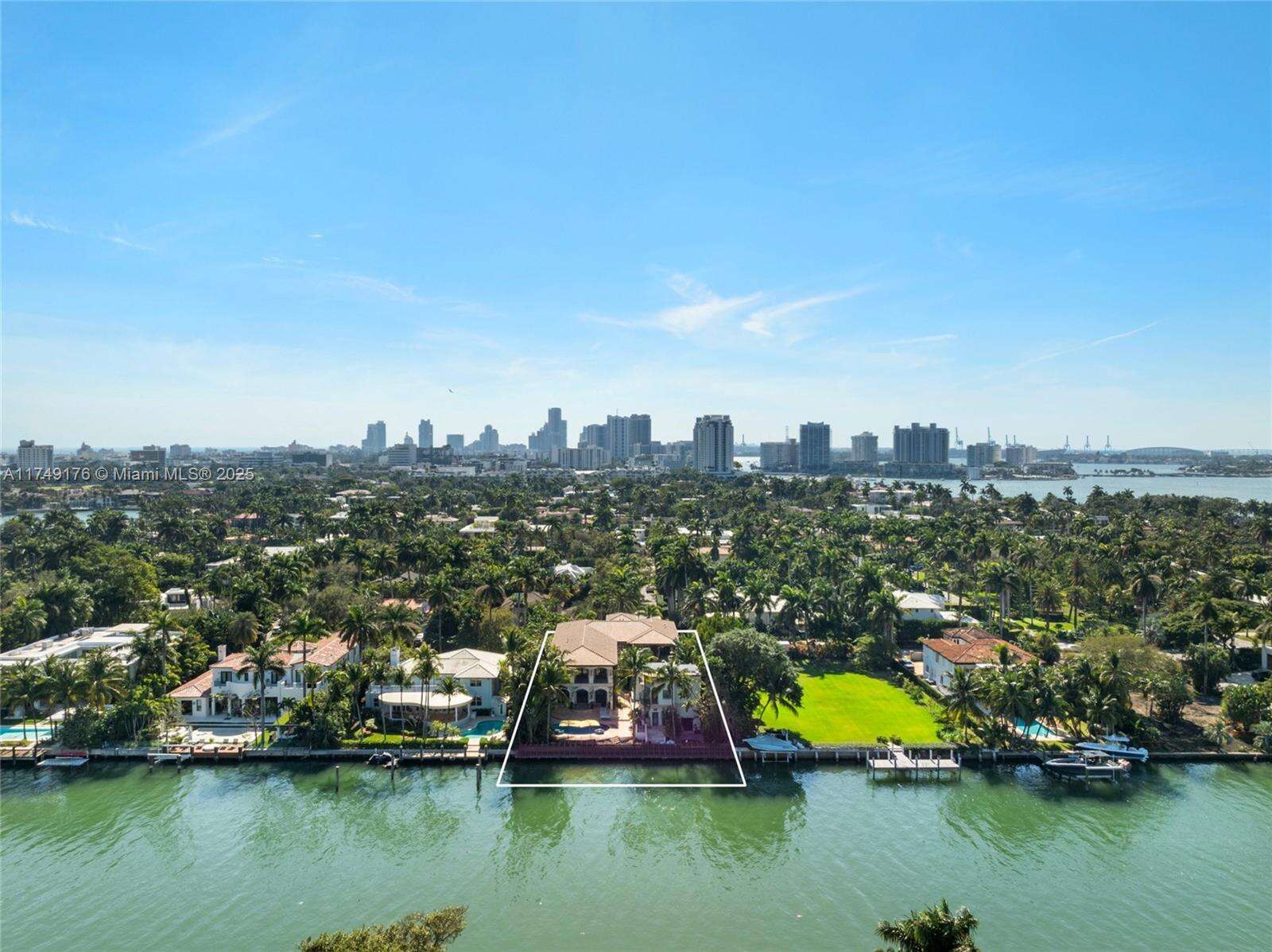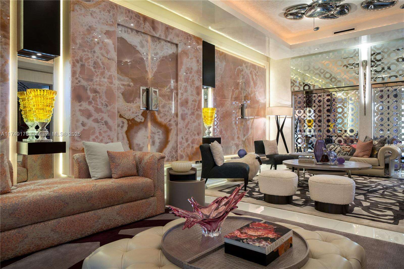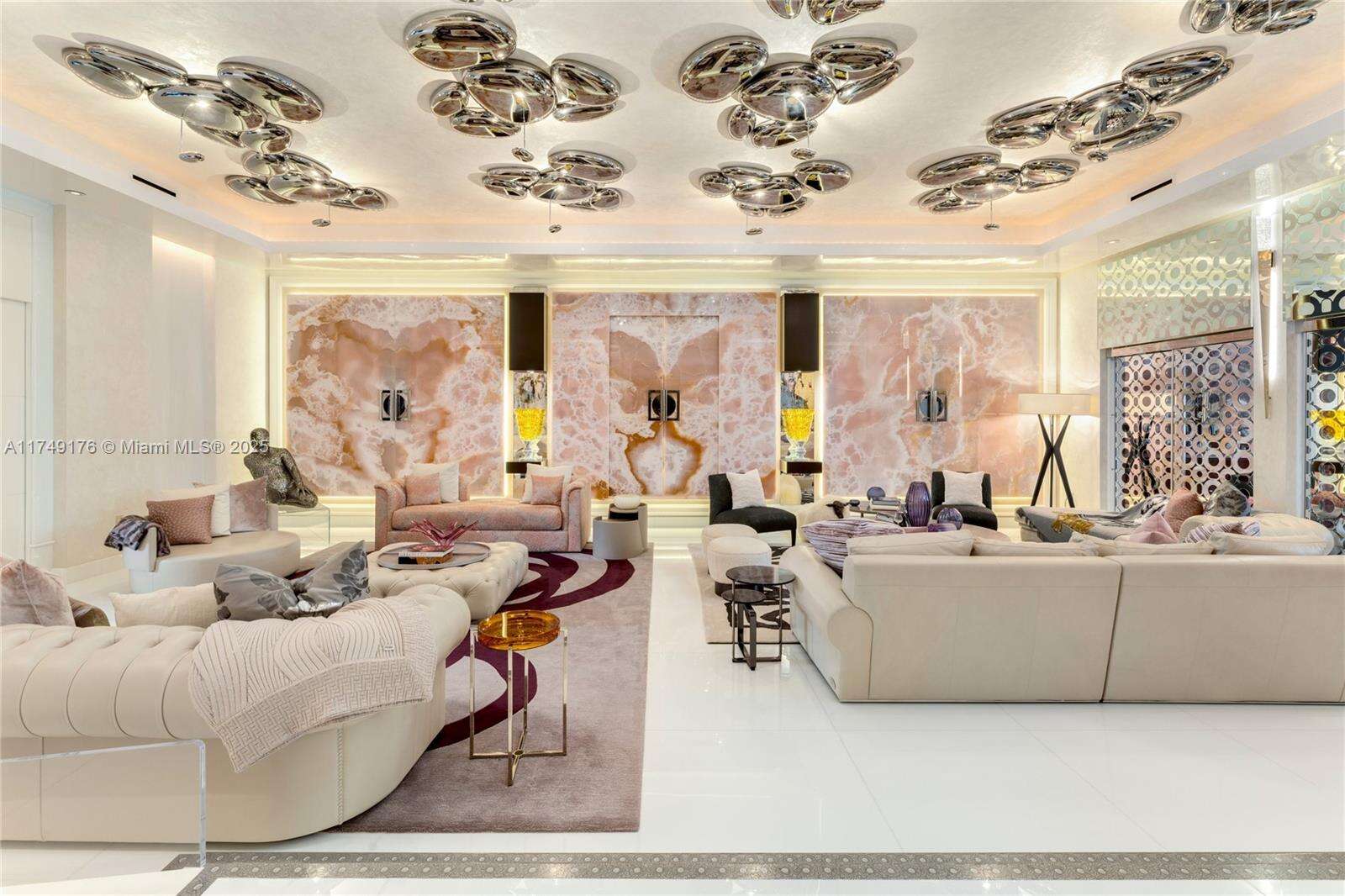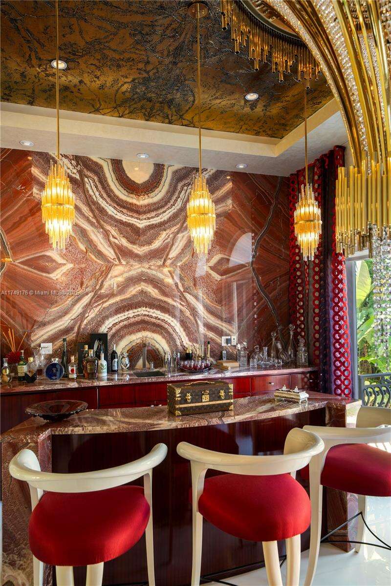 Prepare to be swept away by architectural artistry as this 13,924 SF estate on Sunset Island II debuts on the market for the first time ever. Embrace an opulent lifestyle with 9 beds, 9.5 baths, and a grand 2-story guest house. Uniquely crafted with a rose onyx living room, a Napoleon red marble speakeasy bar, chef’s dream kitchen with walk-in freezer, a regal dining hall, stunning custom walls, and an elevator. The generous primary suite features a private office, sitting area, a wet bar, and a private balcony with water views. An entertainer’s paradise with a bougainvillea-lined courtyard, fountain, summer kitchen, pool with spa, and 100' of waterfront with a private dock. This estate truly speaks for itself as a once-in-a-lifetime opportunity in a prime Miami Beach neighborhood.