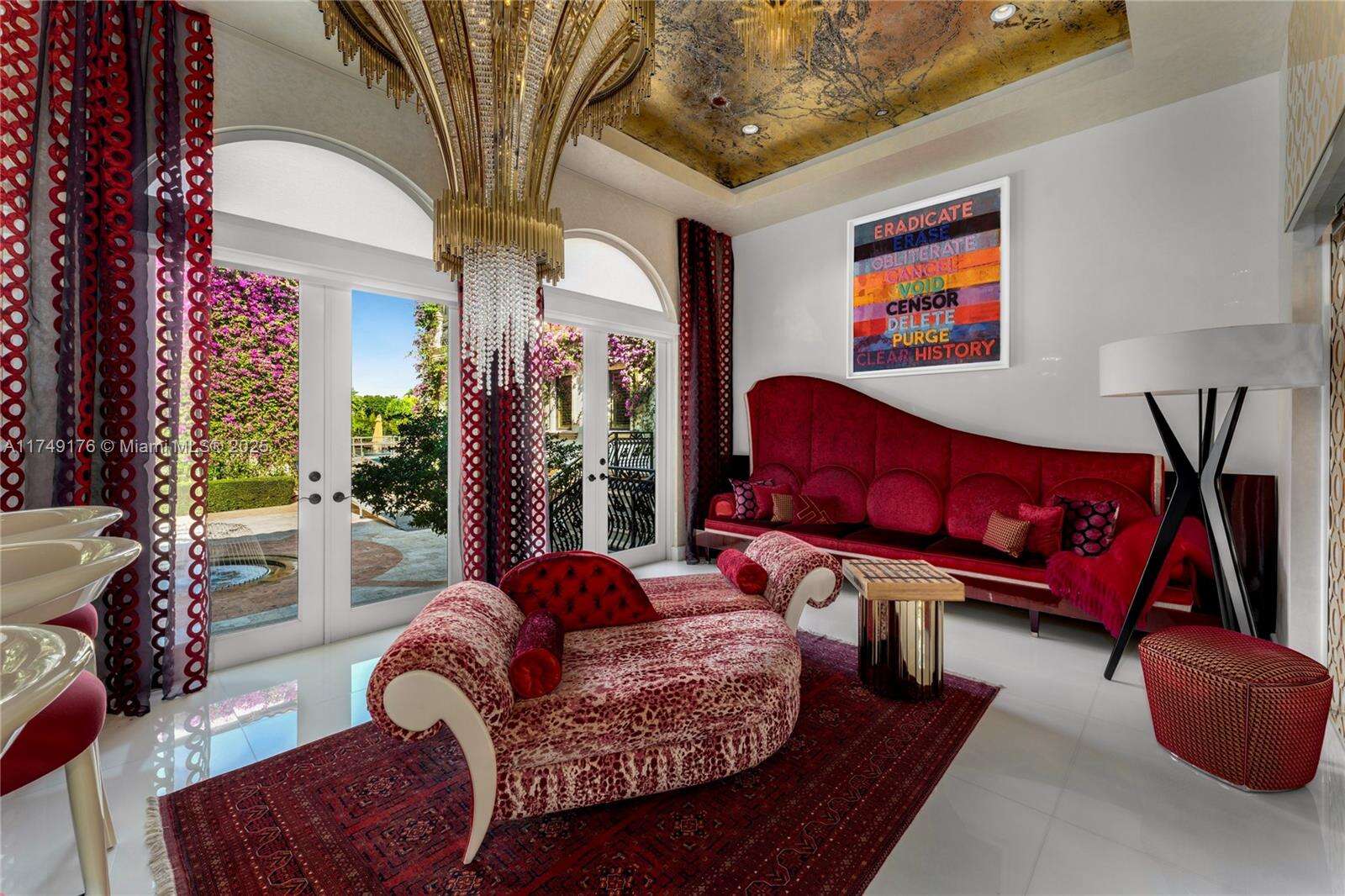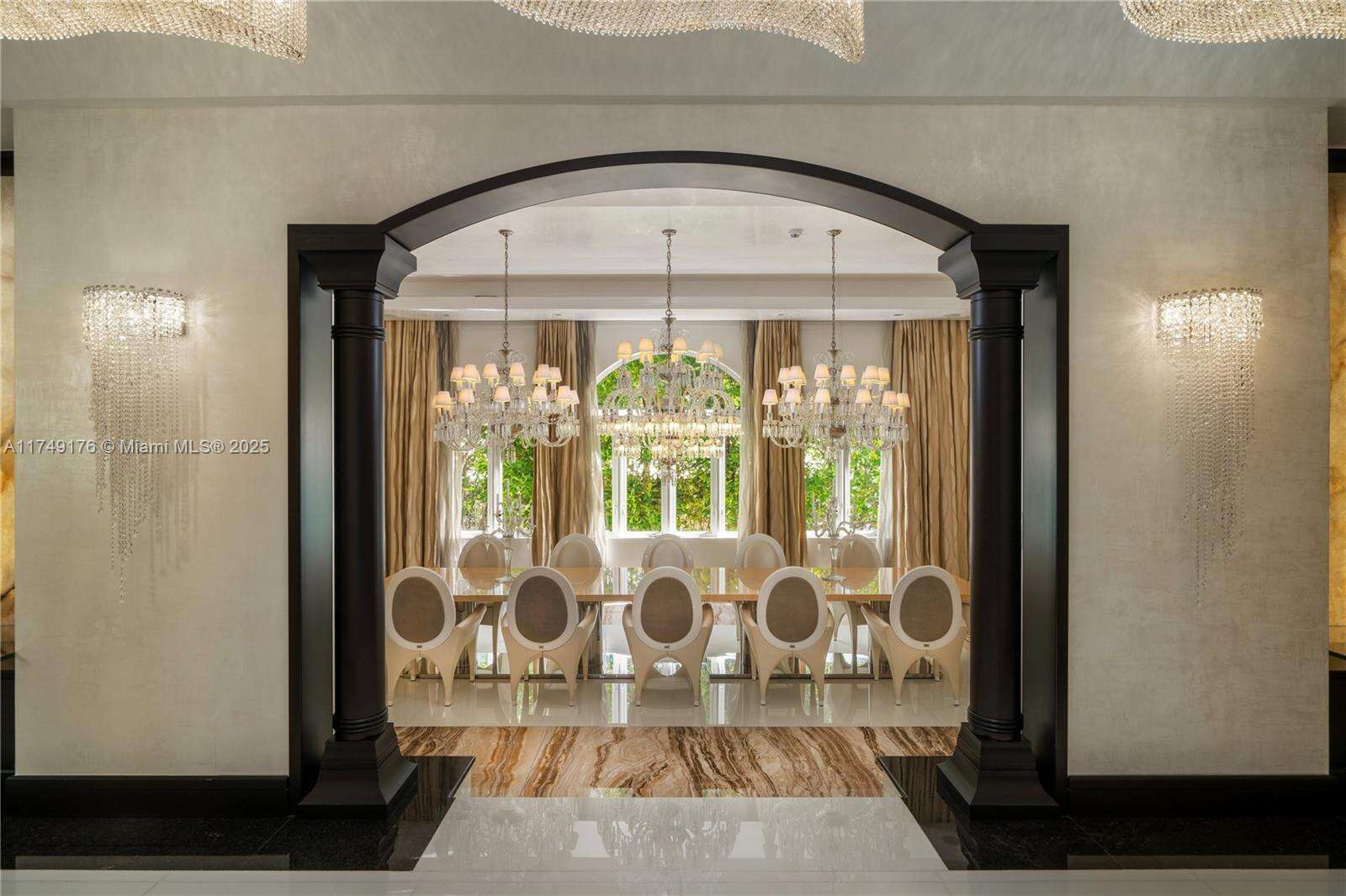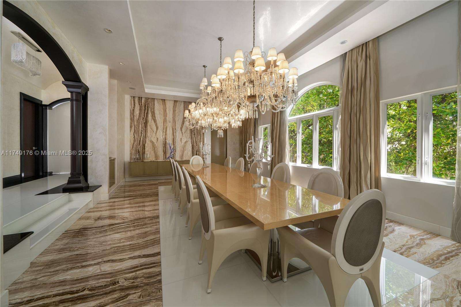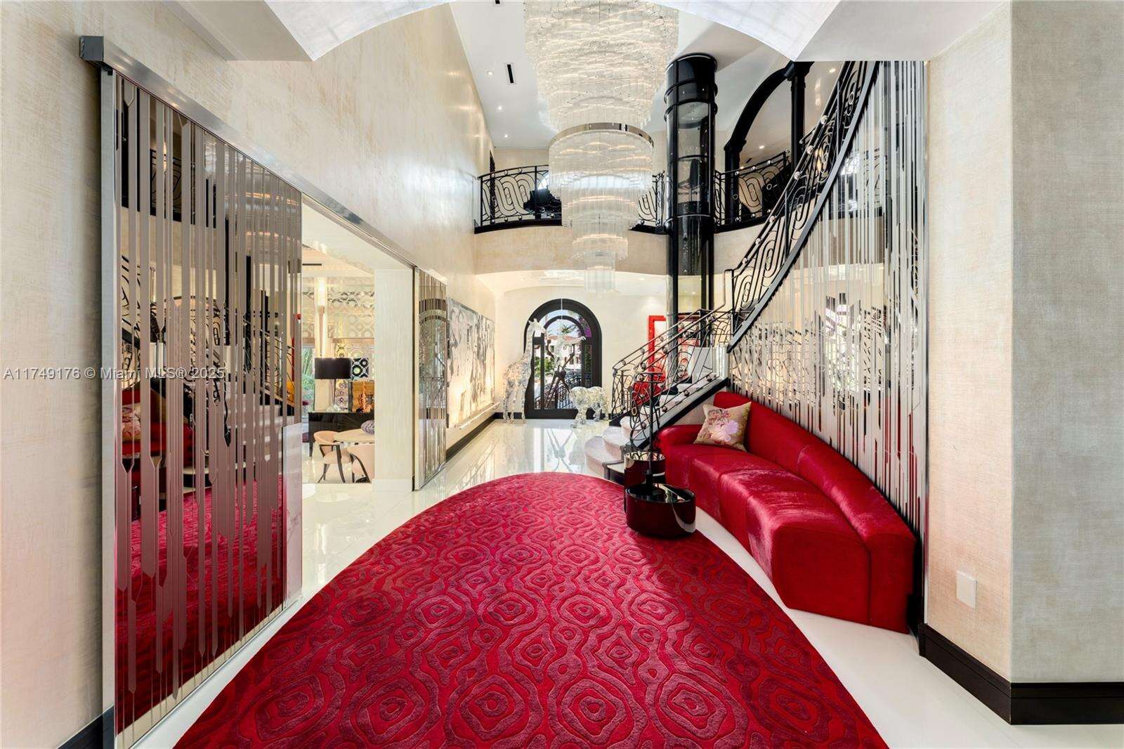 Prepare to be swept away by architectural artistry as this 13,924 SF estate on Sunset Island II debuts on the market for the first time ever. Embrace an opulent lifestyle with 9 beds, 9.5 baths, and a grand 2-story guest house. Uniquely crafted with a rose onyx living room, a Napoleon red marble speakeasy bar, chef’s dream kitchen with walk-in freezer, a regal dining hall, stunning custom walls, and an elevator. The generous primary suite features a private office, sitting area, a wet bar, and a private balcony with water views. An entertainer’s paradise with a bougainvillea-lined courtyard, fountain, summer kitchen, pool with spa, and 100' of waterfront with a private dock. This estate truly speaks for itself as a once-in-a-lifetime opportunity in a prime Miami Beach neighborhood.