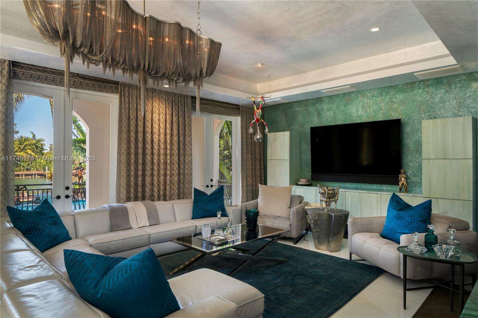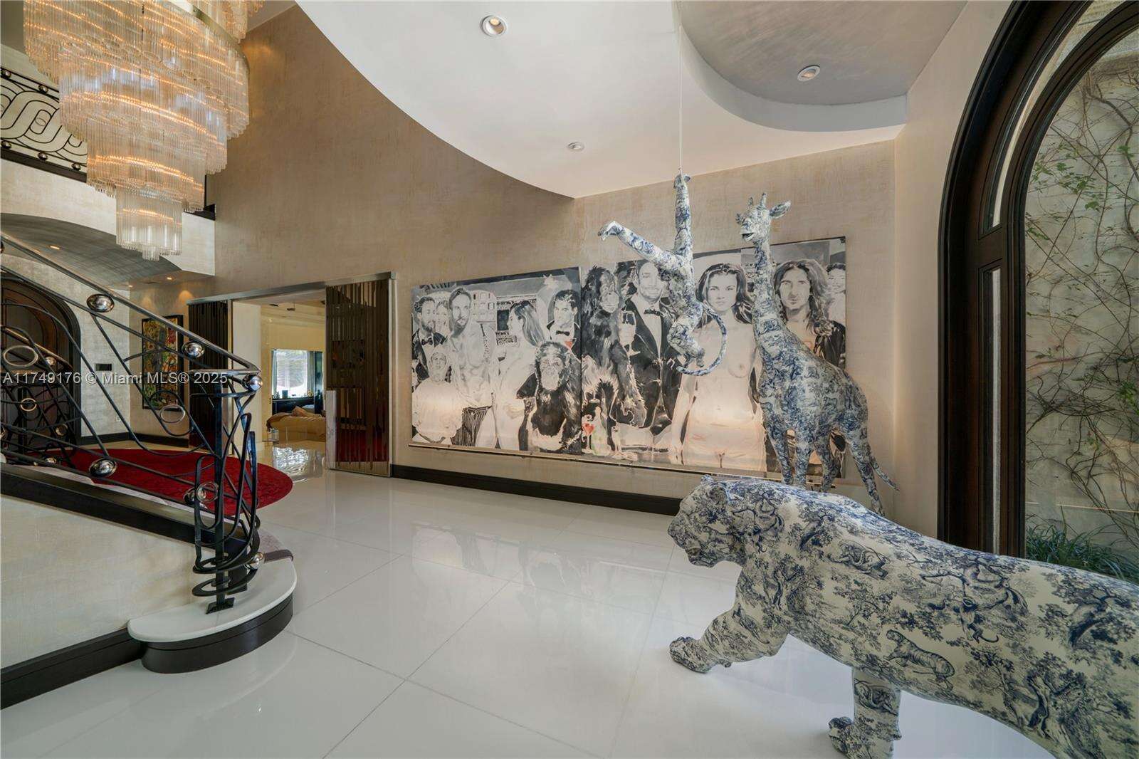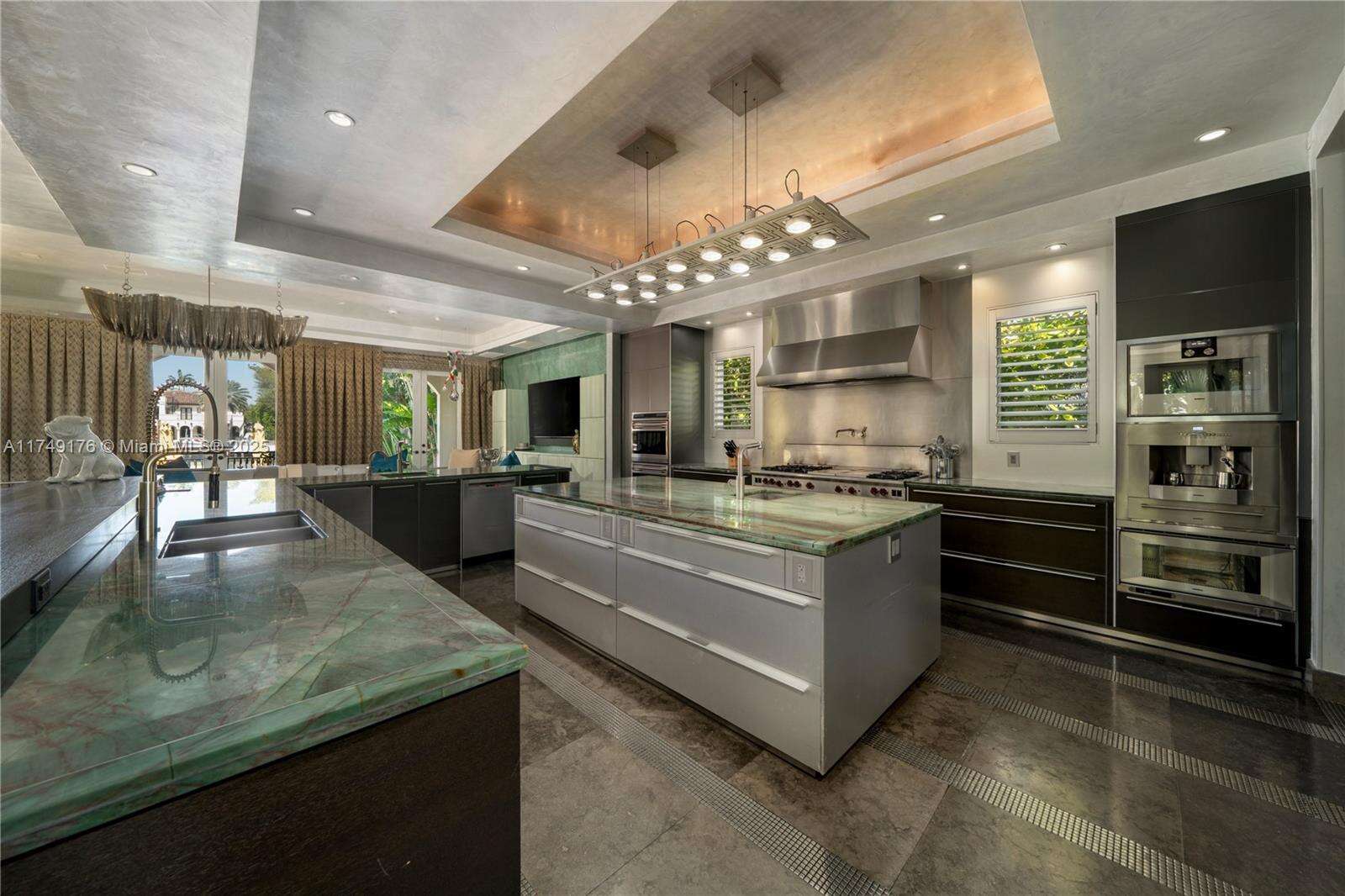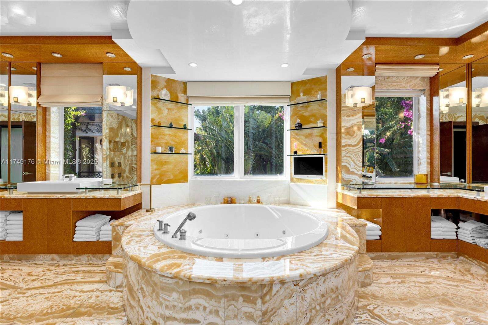 Prepare to be swept away by architectural artistry as this 13,924 SF estate on Sunset Island II debuts on the market for the first time ever. Embrace an opulent lifestyle with 9 beds, 9.5 baths, and a grand 2-story guest house. Uniquely crafted with a rose onyx living room, a Napoleon red marble speakeasy bar, chef’s dream kitchen with walk-in freezer, a regal dining hall, stunning custom walls, and an elevator. The generous primary suite features a private office, sitting area, a wet bar, and a private balcony with water views. An entertainer’s paradise with a bougainvillea-lined courtyard, fountain, summer kitchen, pool with spa, and 100' of waterfront with a private dock. This estate truly speaks for itself as a once-in-a-lifetime opportunity in a prime Miami Beach neighborhood.