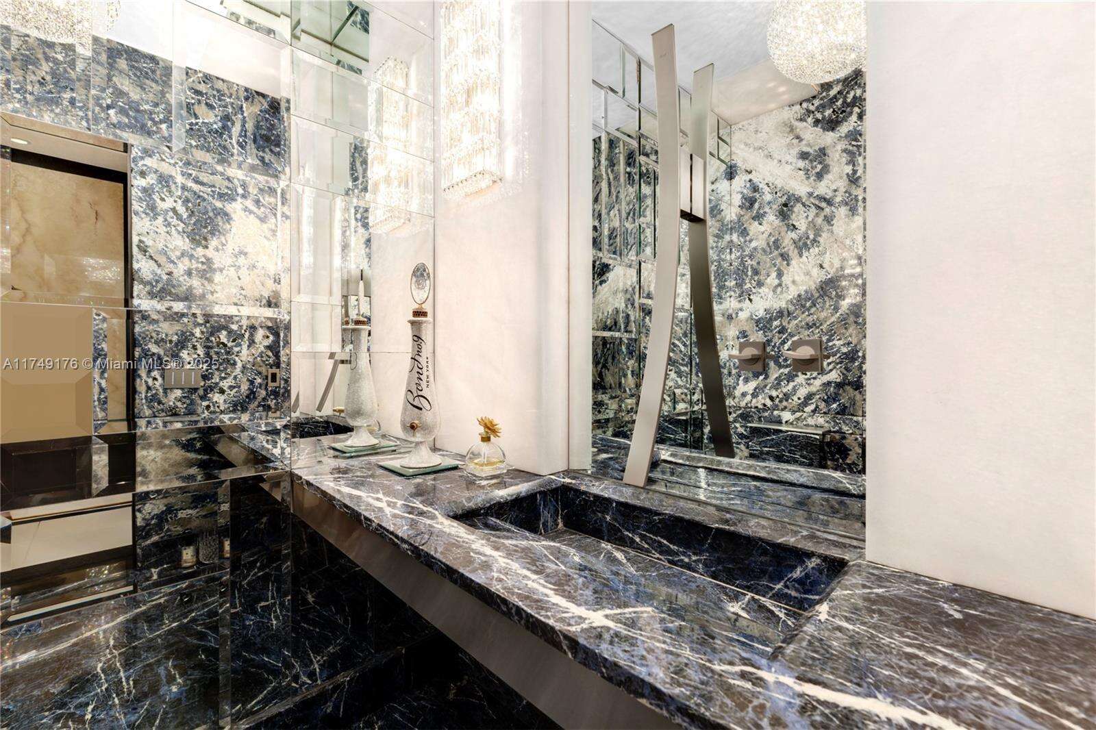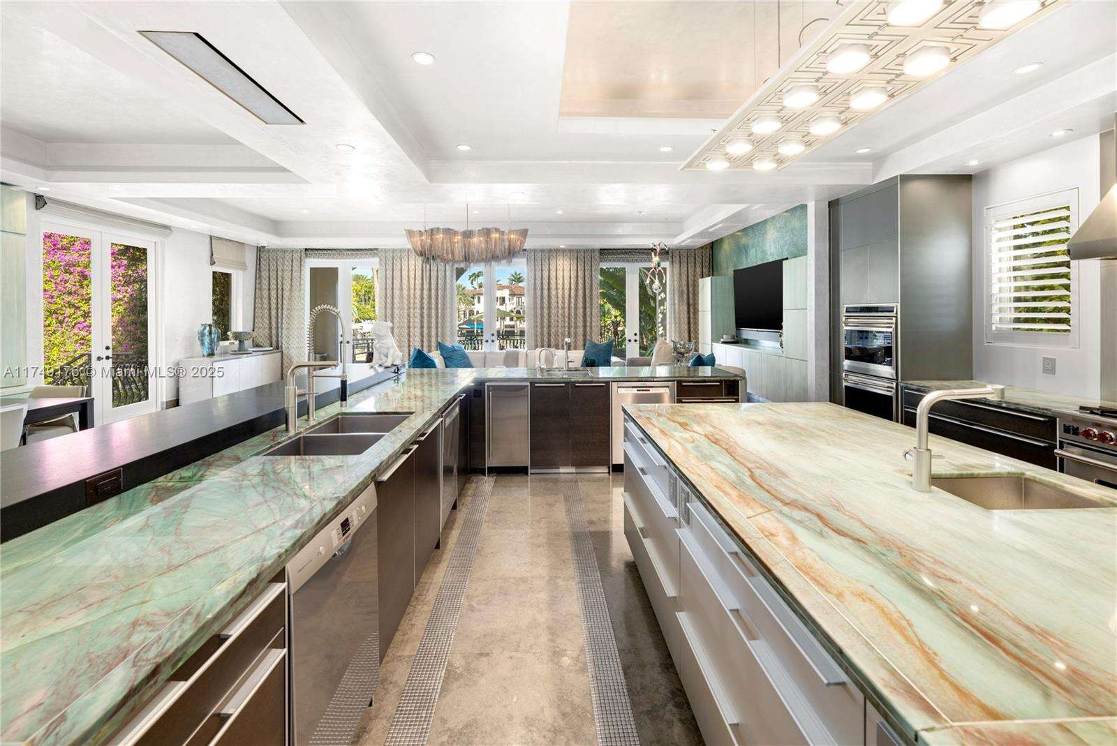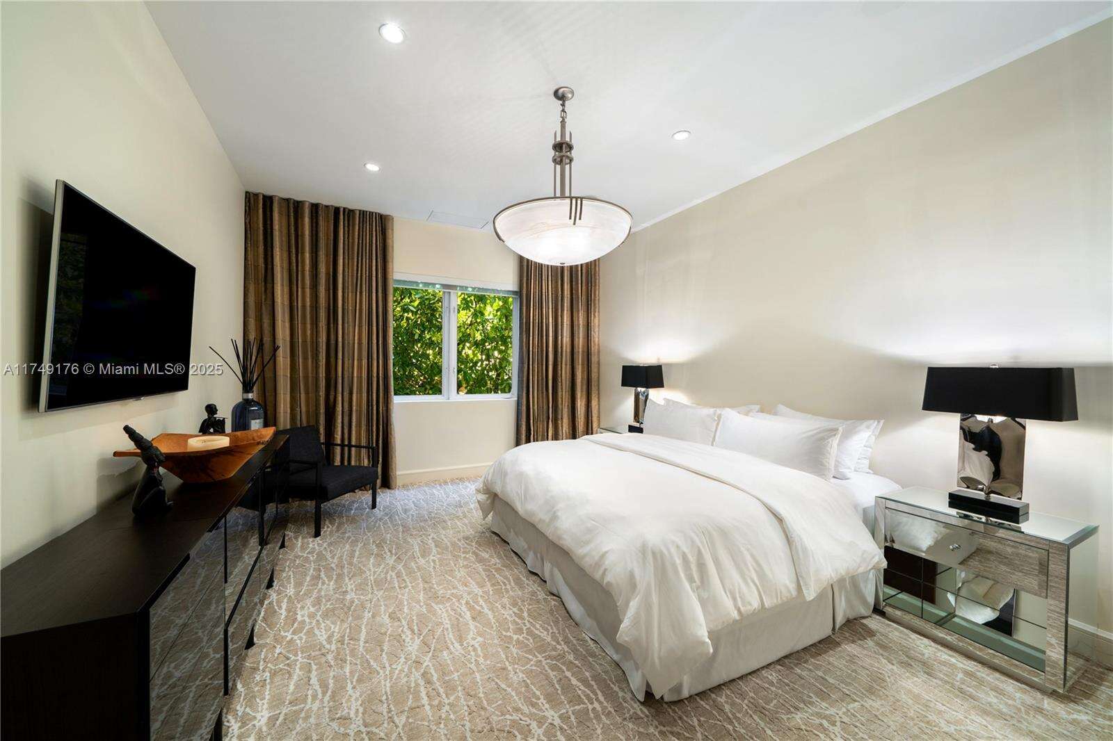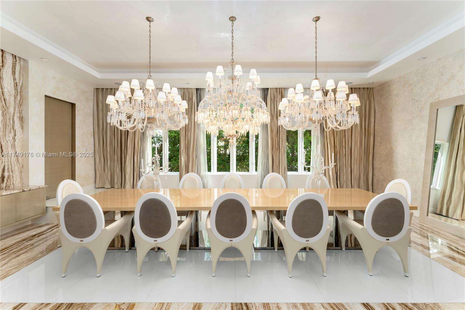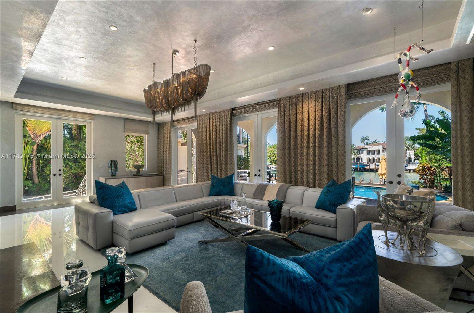 Prepare to be swept away by architectural artistry as this 13,924 SF estate on Sunset Island II debuts on the market for the first time ever. Embrace an opulent lifestyle with 9 beds, 9.5 baths, and a grand 2-story guest house. Uniquely crafted with a rose onyx living room, a Napoleon red marble speakeasy bar, chef’s dream kitchen with walk-in freezer, a regal dining hall, stunning custom walls, and an elevator. The generous primary suite features a private office, sitting area, a wet bar, and a private balcony with water views. An entertainer’s paradise with a bougainvillea-lined courtyard, fountain, summer kitchen, pool with spa, and 100' of waterfront with a private dock. This estate truly speaks for itself as a once-in-a-lifetime opportunity in a prime Miami Beach neighborhood.