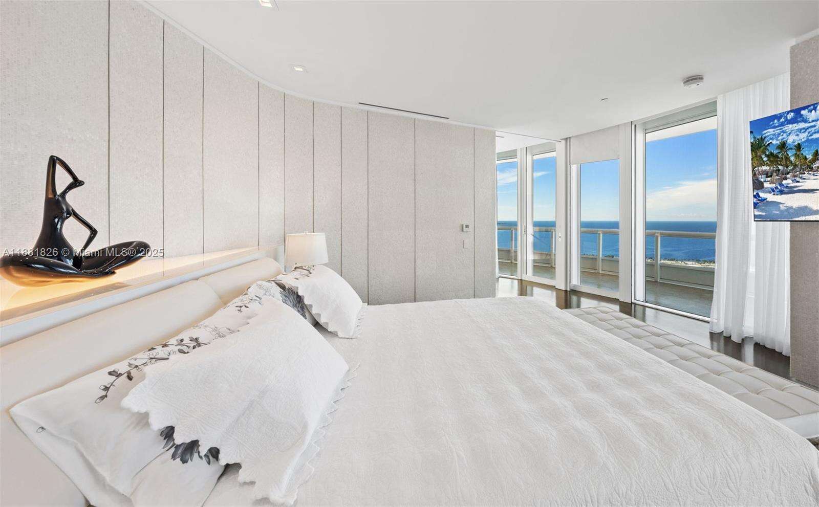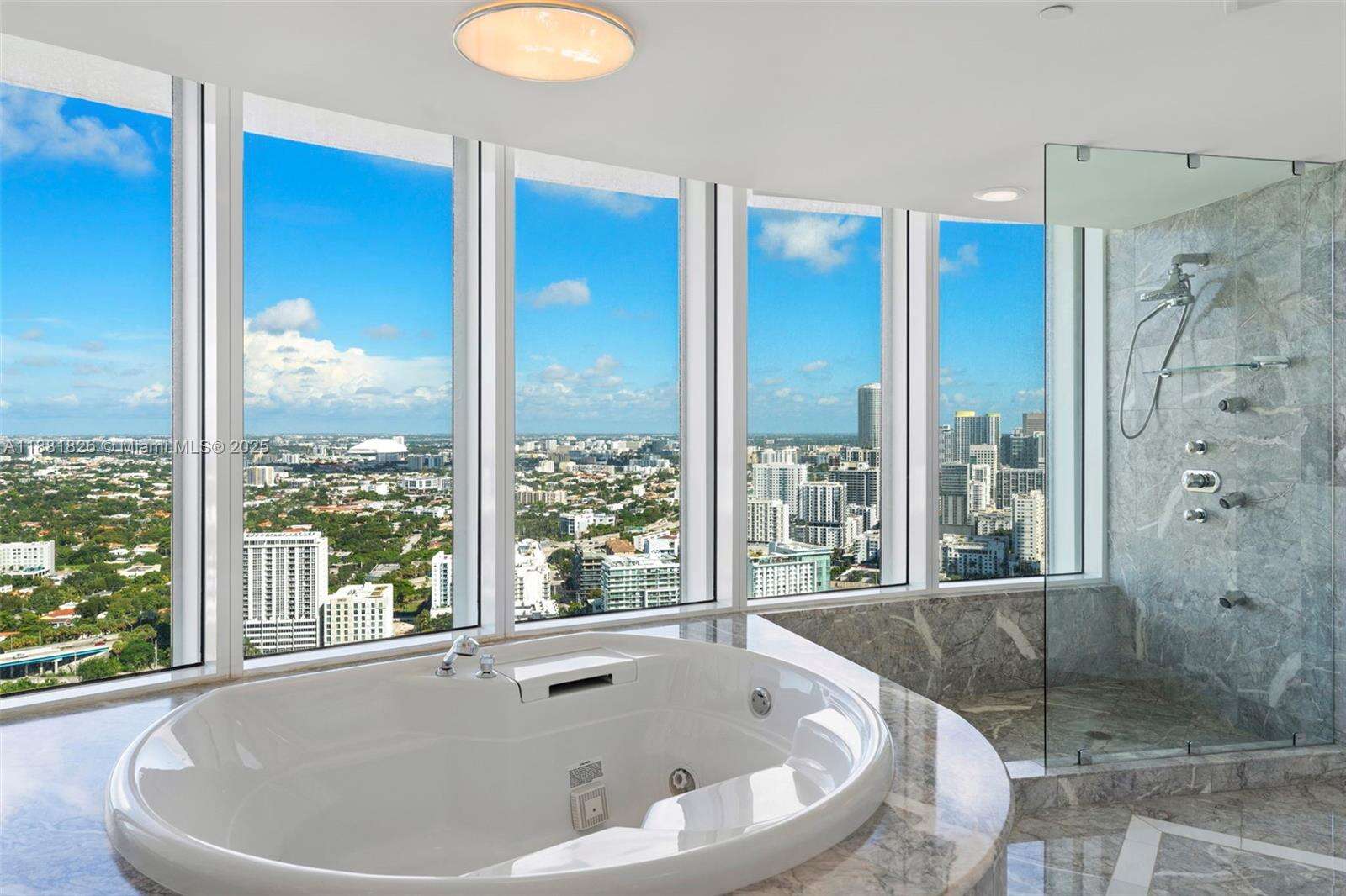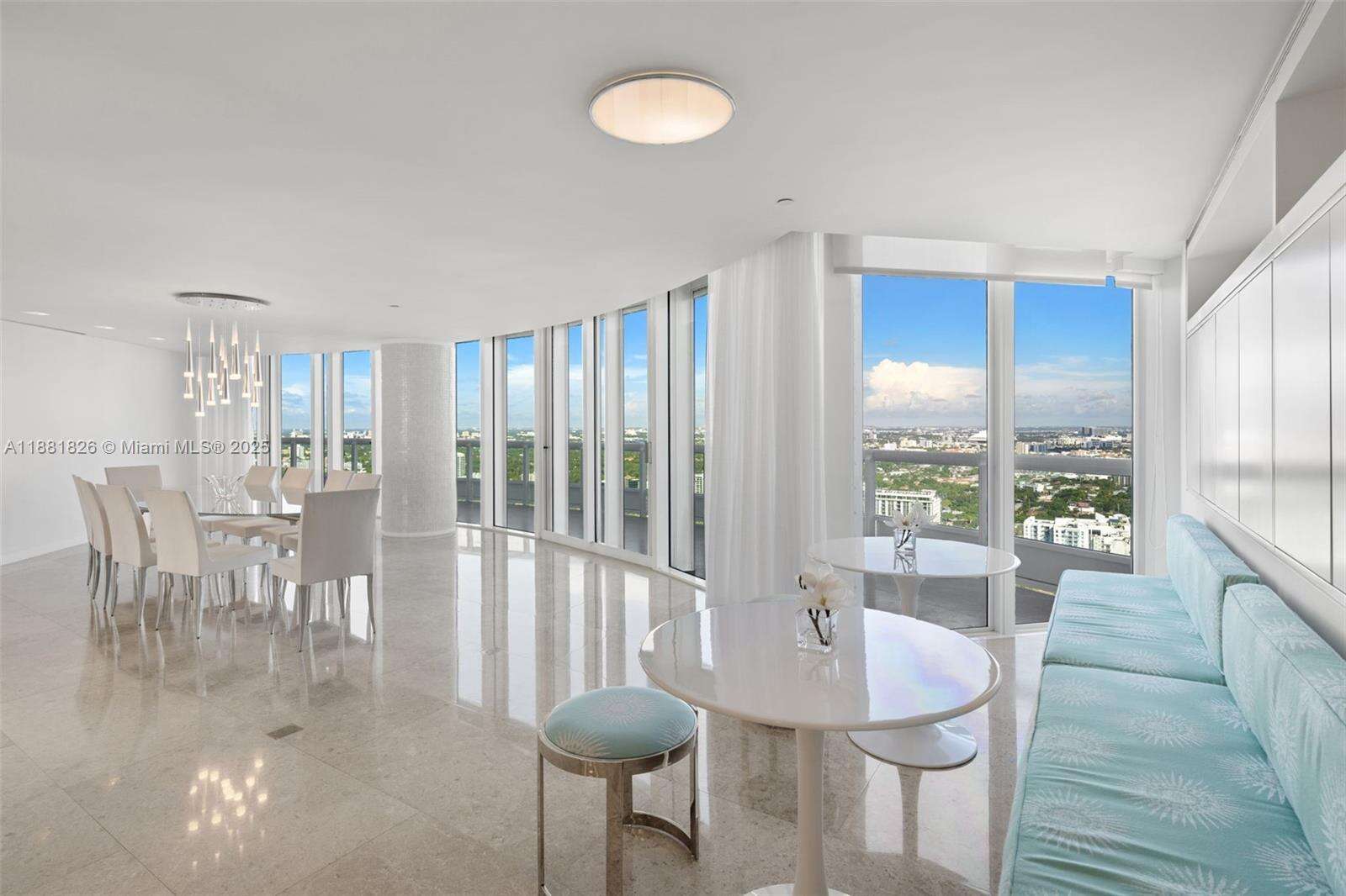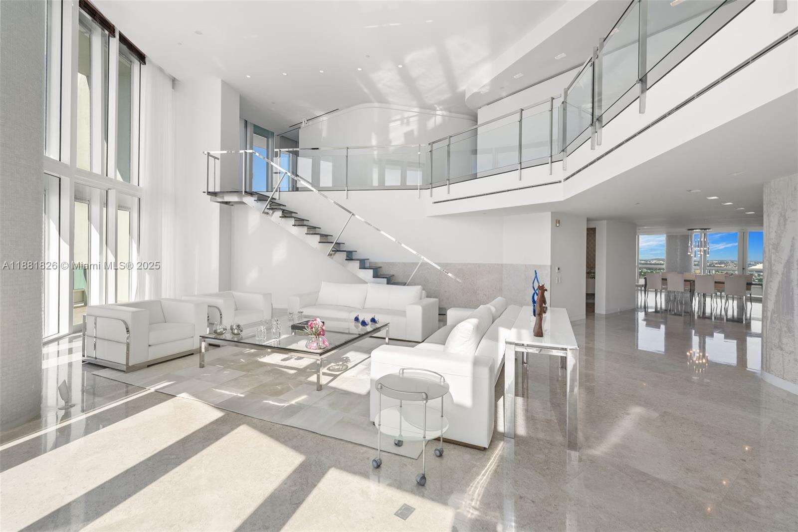 Breathtaking sweeping views of the Bay and Ocean greet you as you step into this highest 2 level townhouse on the 41st and 42nd floors. 5,730 sq ft interiors were redesigned by a renowned architect and feature contemporary sleek finishes such as cream marble flooring throughout, glass and stainless steel staircase, built-ins, customized walk-in closets, motorized shades and so much more. Soaring 20 ft ceilings and refined craftmanship convey a sense of elegance and glamour coupled with unsurpassed relaxation. Santa Maria offers 5 star amenities, a brand new fitness center, a bistro, lighted tennis court, marina access, 24 hour security and a totally redesigned pool and upper deck to be completed in the first quarter of 2026. Included: 3 assigned parking spaces and 1 storage unit.