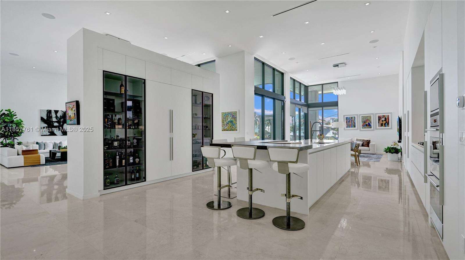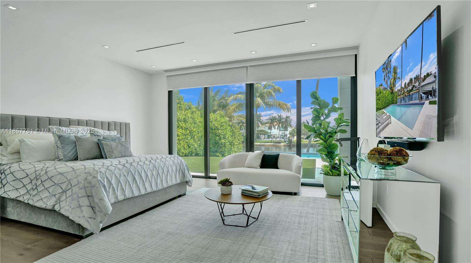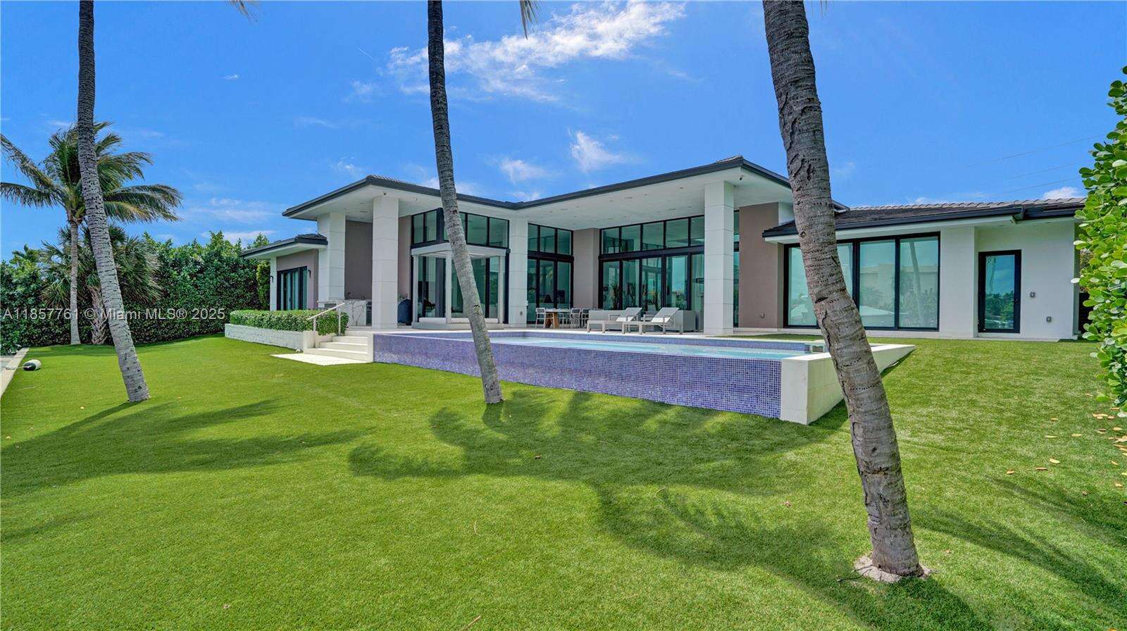 This stunning modern one-story residence features floor-to-ceiling windows with expansive water views from every room. This exquisite home boasts 15-foot ceiling, five bedrooms, seven full bathrooms, den, heated pool, covered terrace and outdoor kitchen. Over $450,000 in upgrades. It has approximately 114 feet of water frontage, private dock and a 40,000lb boat lift. This is truly a boater's paradise. Come see for yourself this modern design masterpiece and make it your home.