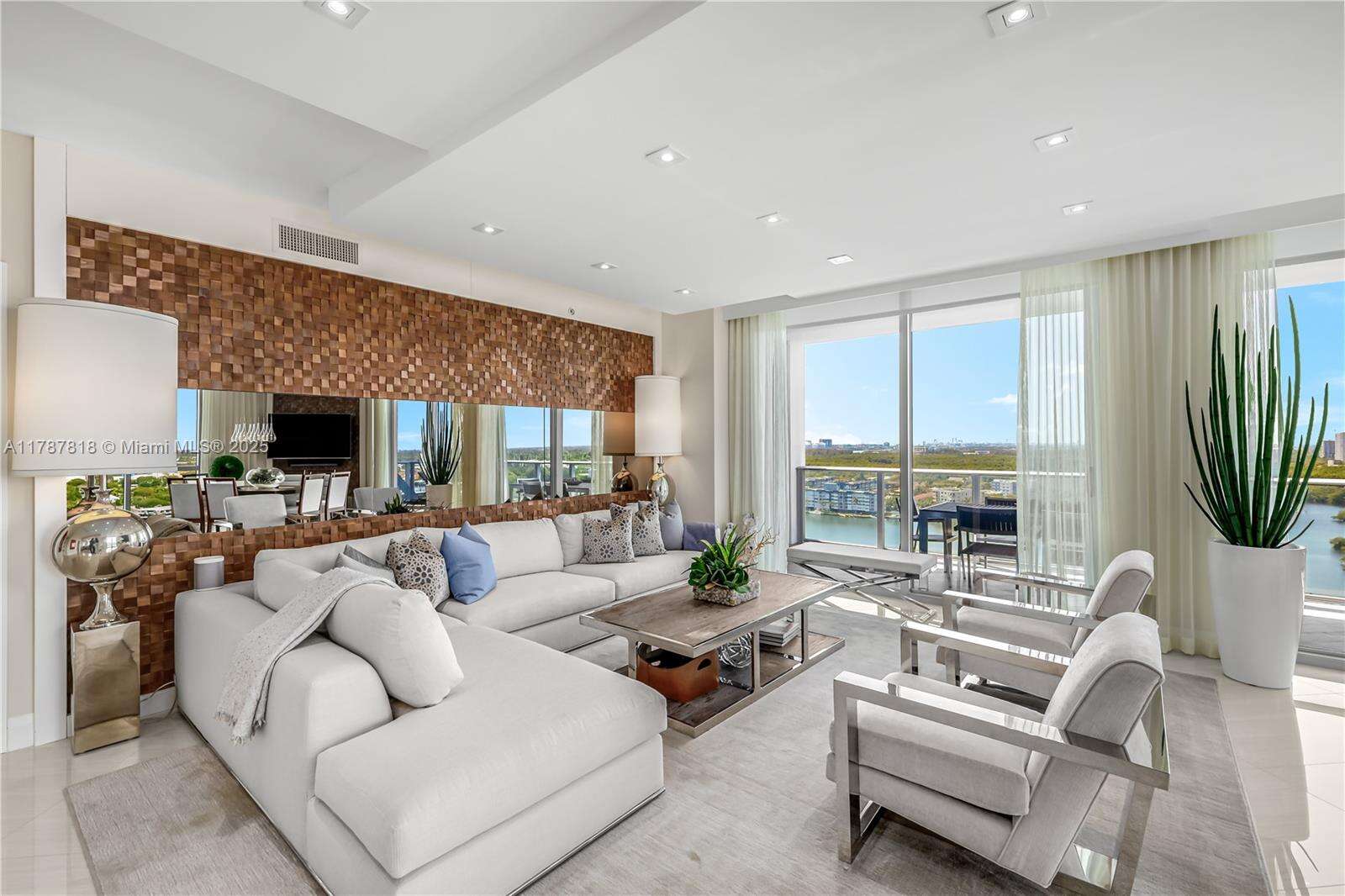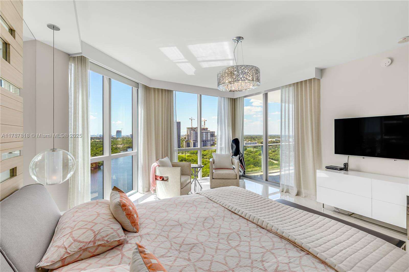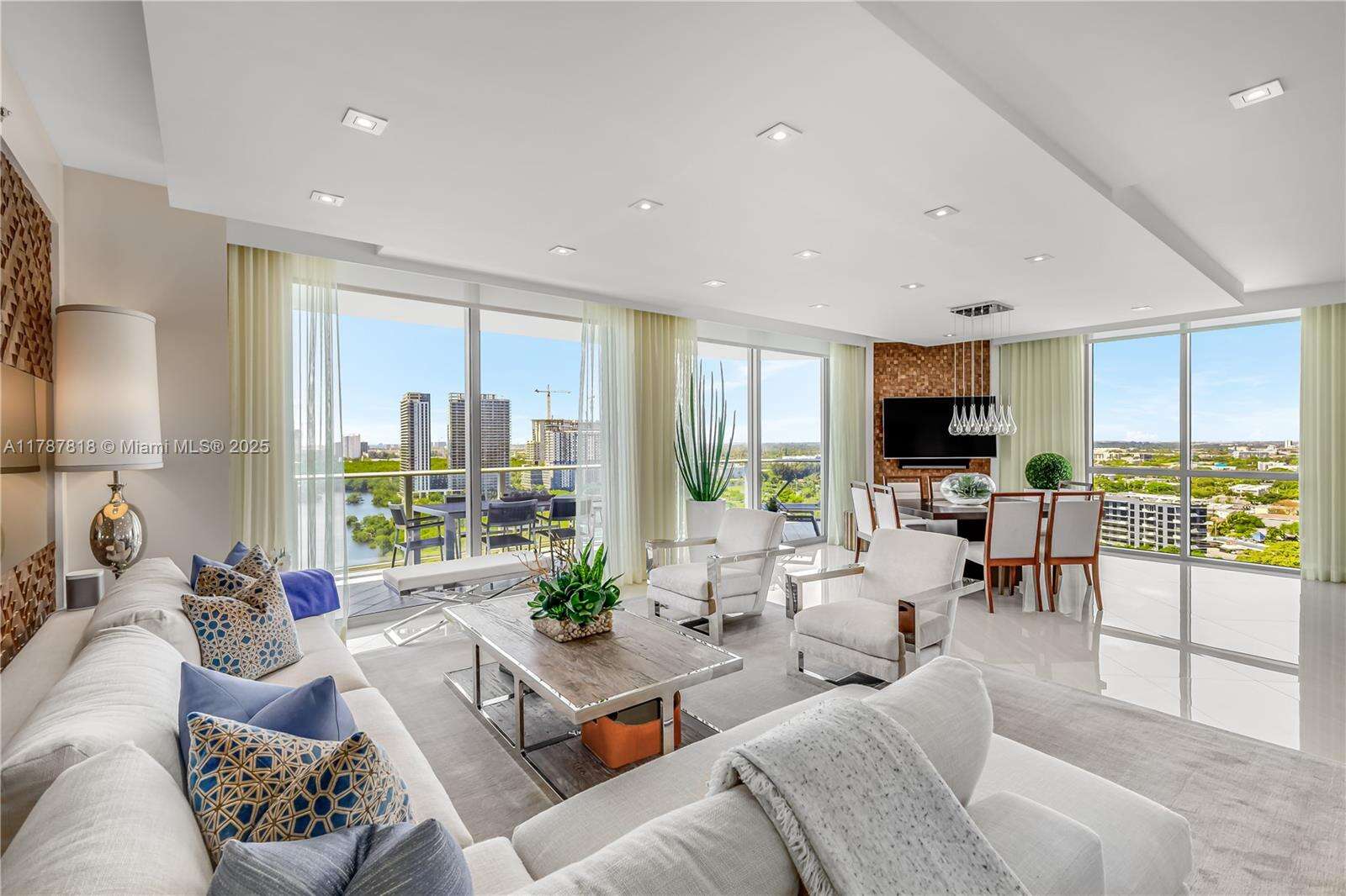 Luxurious Turnkey Corner residence at The Reserve at Marina Palms featuring unobstructed water views, designed, remodeled and curated by Steven G with high-end finishes throughout. Features include luxury lighting, porcelain floors, custom ceilings, and tailored closets. Enjoy two spacious master suites, fully enclosed den ideal as third bedroom or office, chic powder room, TWO assigned parking spaces, and private storage. Residents enjoy world-class amenities: spa with steam and sauna, fitness center, yoga/Pilates studio, news café, business lounge, infinity pool with summer kitchen, kids' pool, play zone, dog trail, and art-adorned grand lobby. 24-hour concierge, gated security, and option to purchase boat slip. Perfect blend of luxury and convenience. MOVE-IN READY!