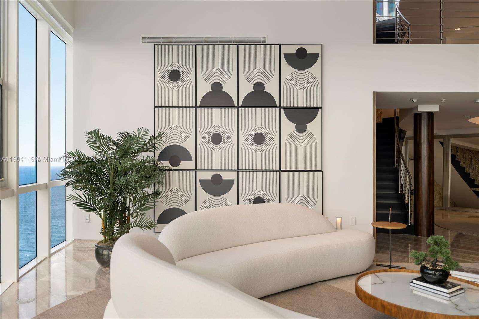 Experience the pinnacle of coastal luxury in TS-1 at Trump Royale, an ultra-rare 5,727 sq ft duplex trophy residence soaring above the shoreline of Sunny Isles Beach. This extraordinary sky mansion is offered fully furnished, featuring a curated collection of high-end designer pieces that complement the home’s sculptural architecture and breathtaking views.The main living area is a masterpiece of scale and natural light, wrapped in panoramic glass. Refined neutral palettes, architectural curves, custom millwork, and a seamless indoor-outdoor visual connection create a feeling of serenity. A contemporary floating staircase connects the two levels, giving the residence the volume and presence of a single-family home in the sky. Situated along one of Miami’s most coveted beachfront stretches.