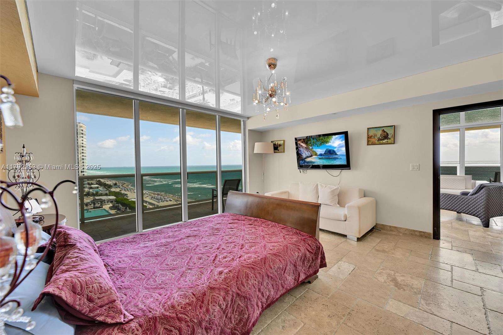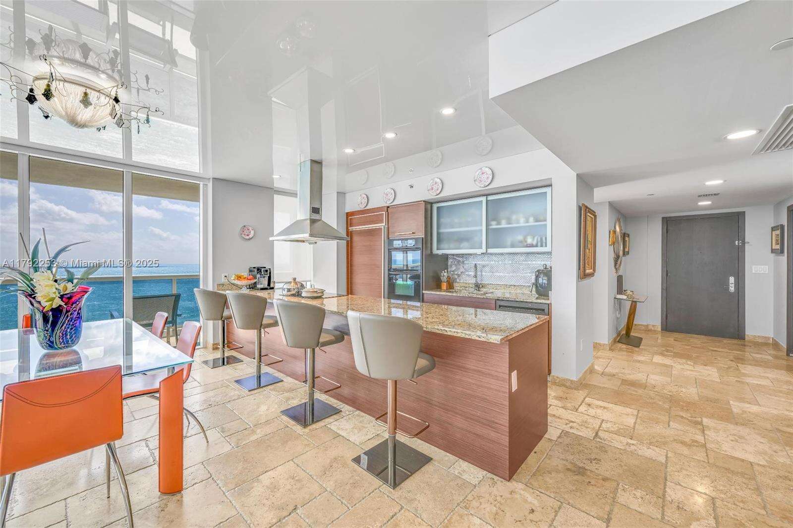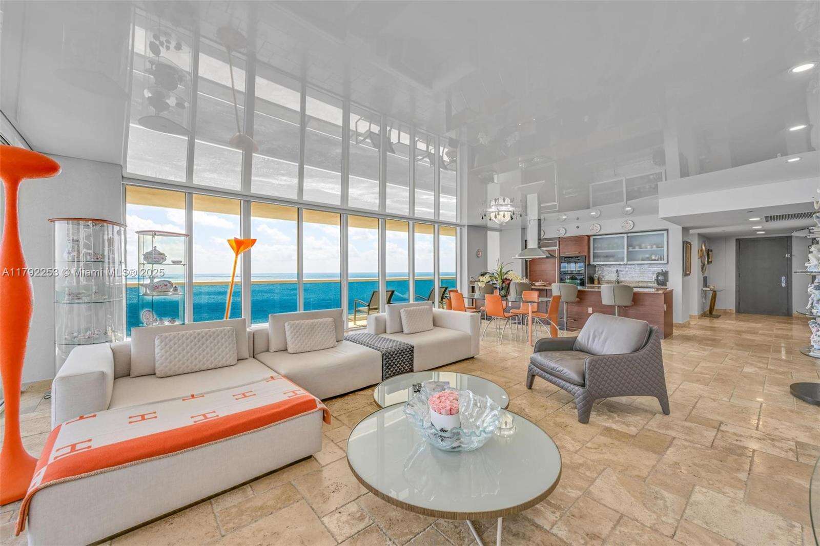 Truly unique NE corner unit with 270° of direct ocean views! Designed for entertaining, this one-of-a-kind residence features a dramatic stretch ceiling, custom finishes, wood doors, marble floors, electric shades, and recessed lighting. The Primary Suite offers his-and-hers dressing rooms and custom walk-in closets. Italian kitchen equipped with premium KitchenAid appliances. Enjoy 5-star resort amenities: a grand 2-story lobby, 24-hour security and valet, five heated pools, and a 50,000 sq. ft. oceanfront spa and fitness center. Resort living at its finest!