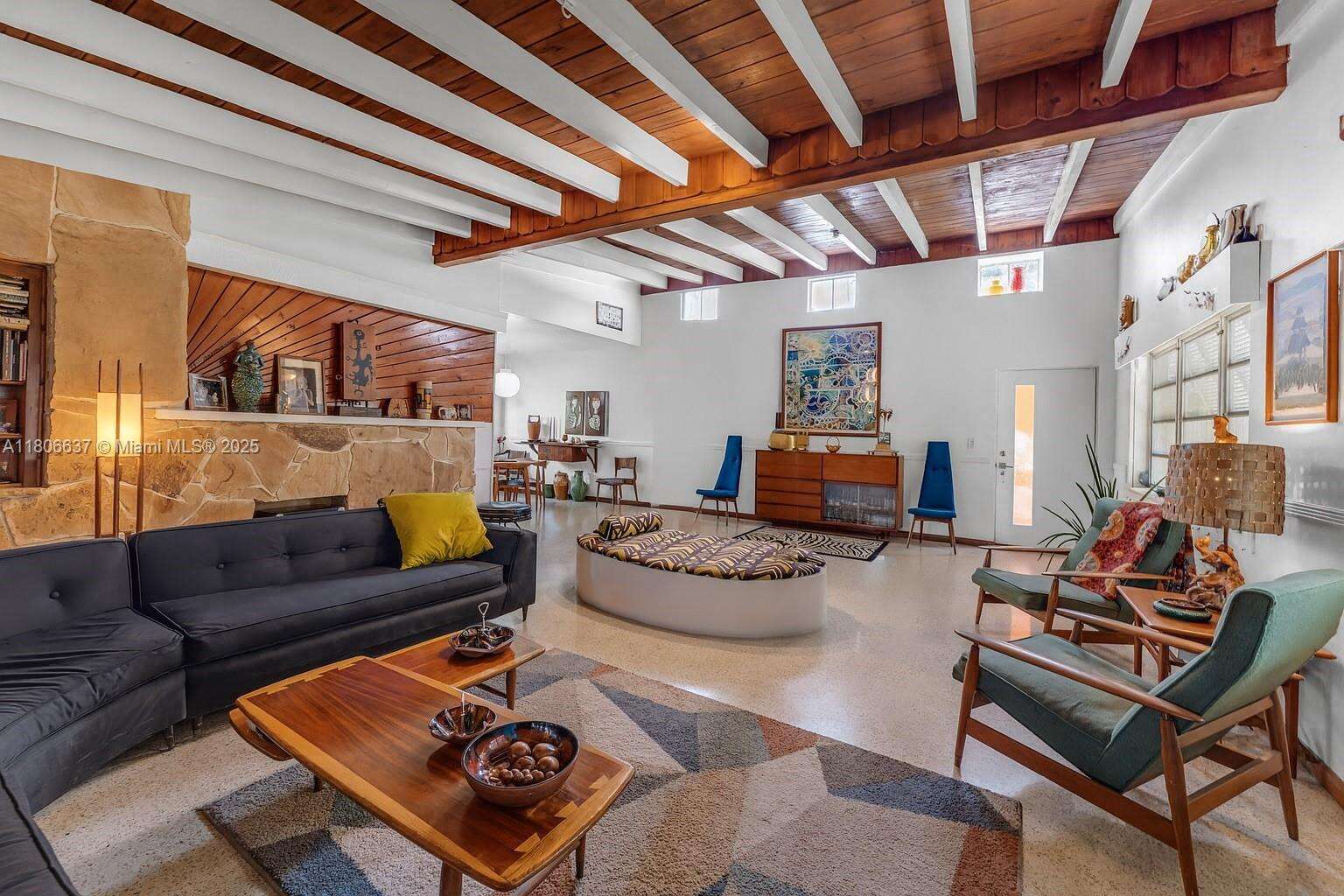 Welcome to Casa Palmera! This mid-century modern gem sits on a quiet cul-de-sac located just minutes from Coconut Grove. Nestled in a lush tropical garden, this home boasts true modernist style with large windows, beamed ceilings, original terrazzo and parquet wood floors. The bathrooms have been tastefully renovated to match the original design intent. This home can be enjoyed as a 3/2 with a separate 1/1 or can easily be transformed back into a 4/3.