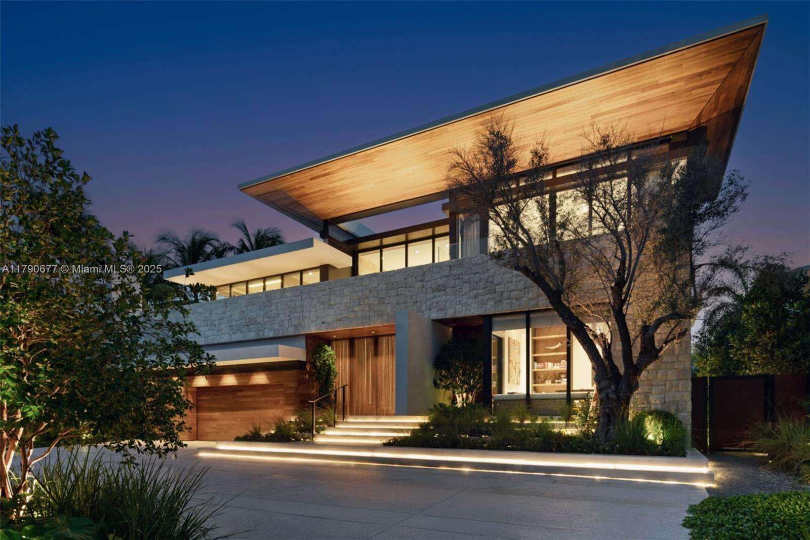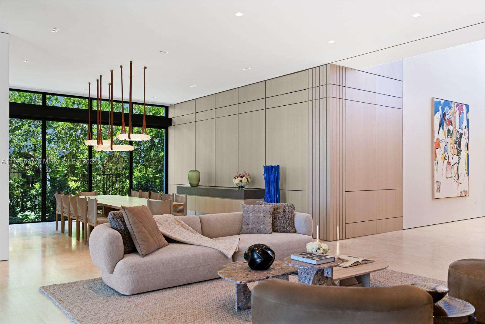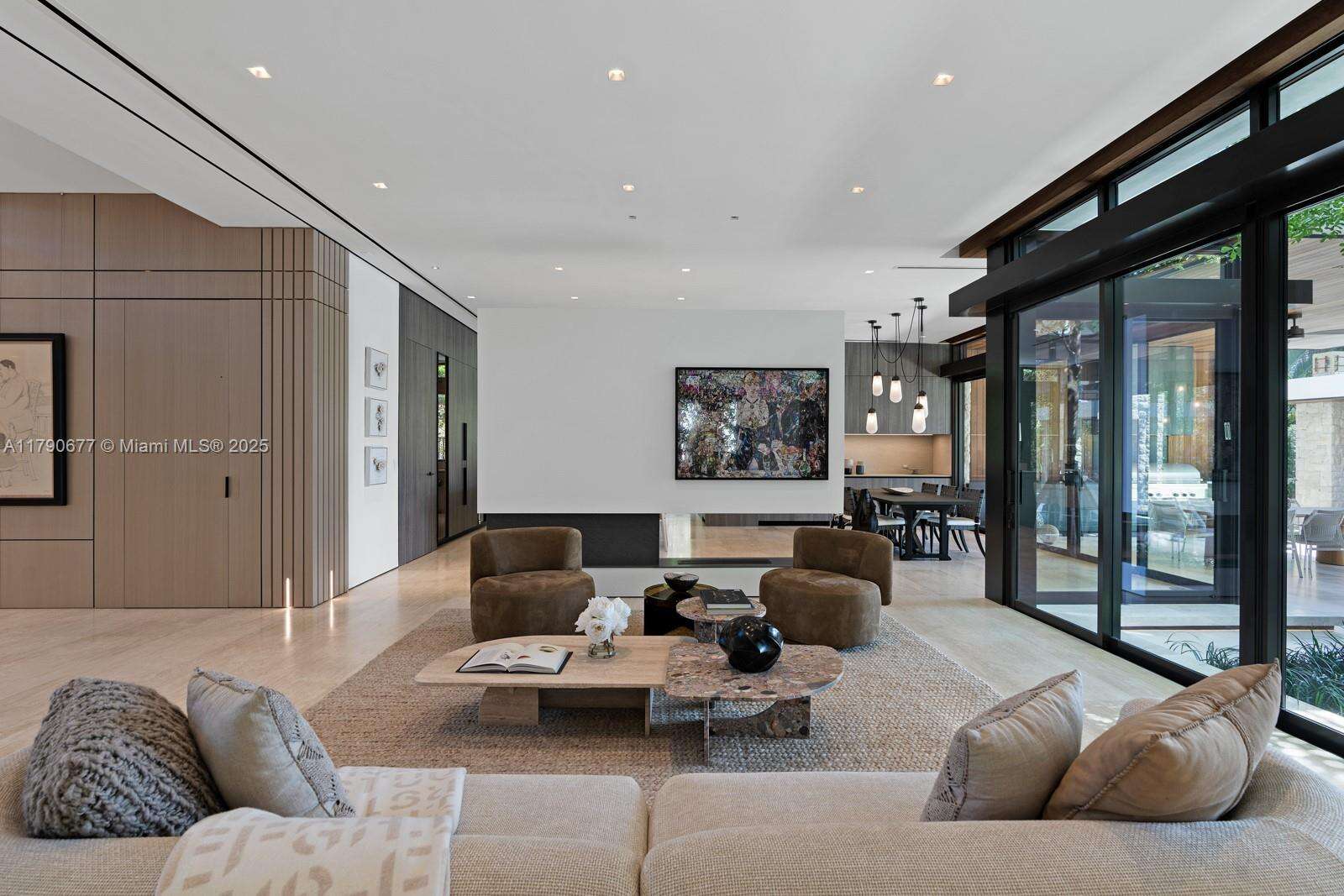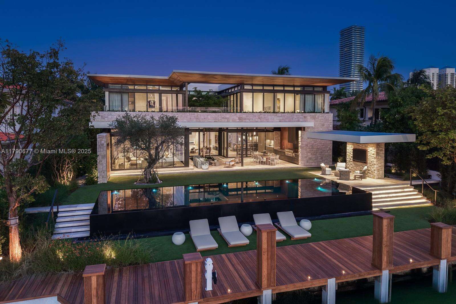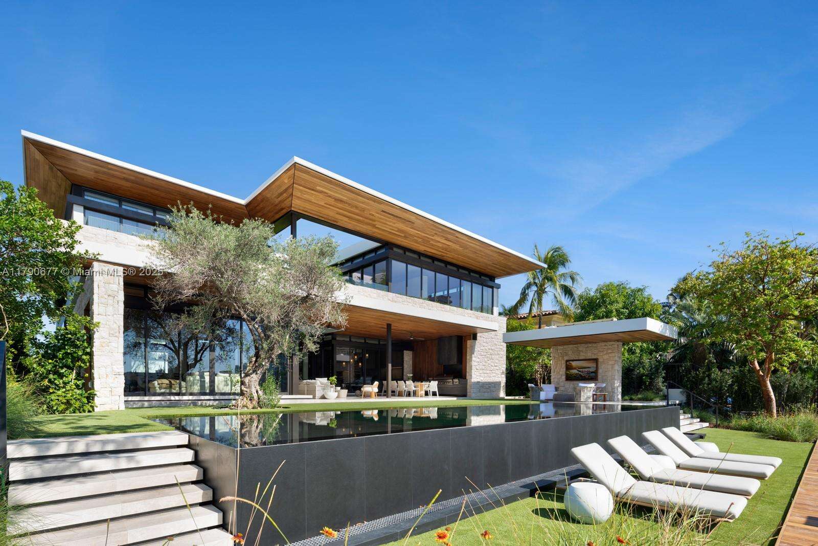 Glamour in Golden Beach! Masterfully designed, this 2025 residence sets a new benchmark in waterfront modernism. Hand-placed stone, iroko wood, and clear glass interlace a 100-year olive tree. The grand foyer achieves 24' heights highlighting Italian oak-paneled walls that lead to a sophisticated salon. Curated by Fanny Haim, the worldly interiors include a travertine bar in the bespoke media lounge, and stylized fireplaces & drapery throughout. The exceptional MiaCucina kitchen revolves around a bright breakfast area. An architectural staircase arrives to the primary suite’s dual dressing rooms and spacious marble bath enhanced by an upstairs library. A theater, office, gym, elevator & staff room complete the home. The resort pool shines with a cabana, Summer Kitchen, new dock + seawall.