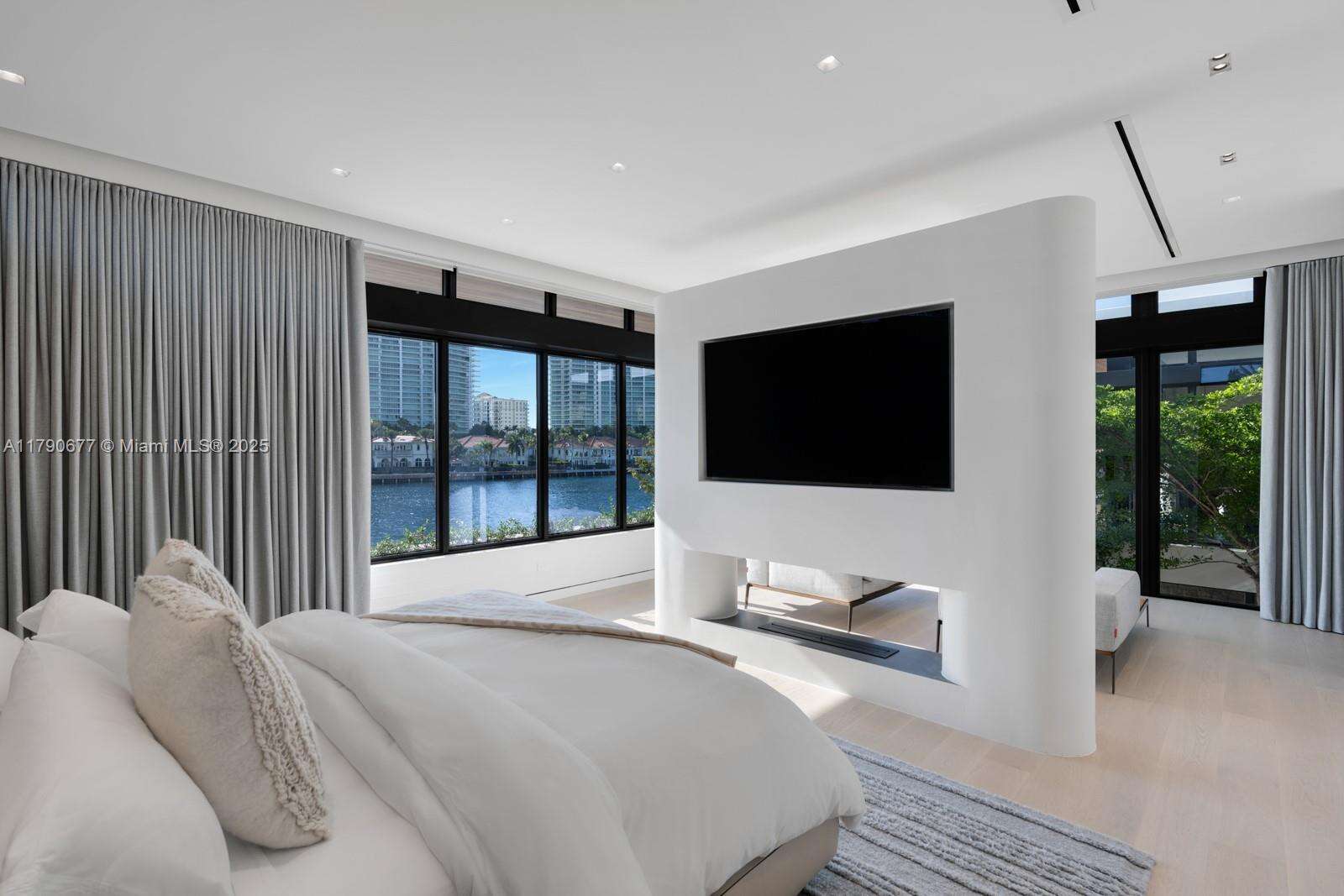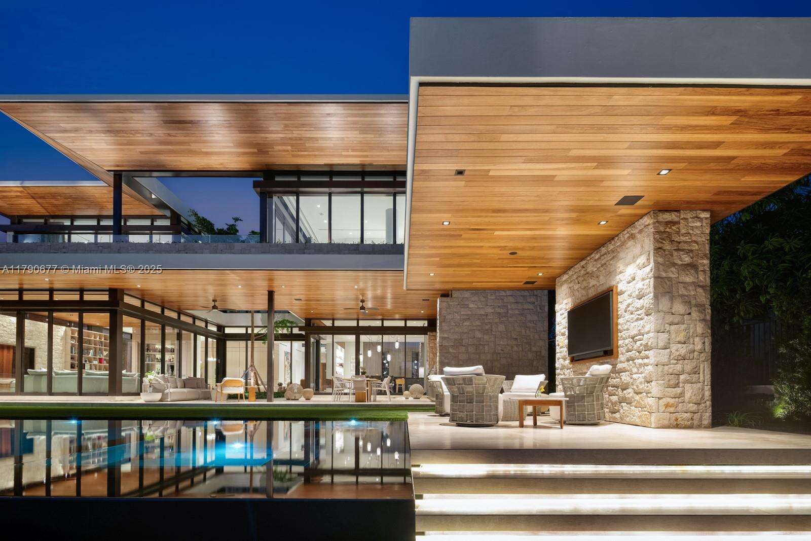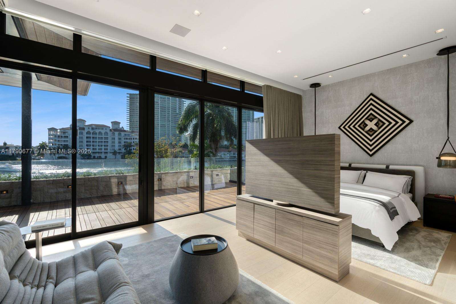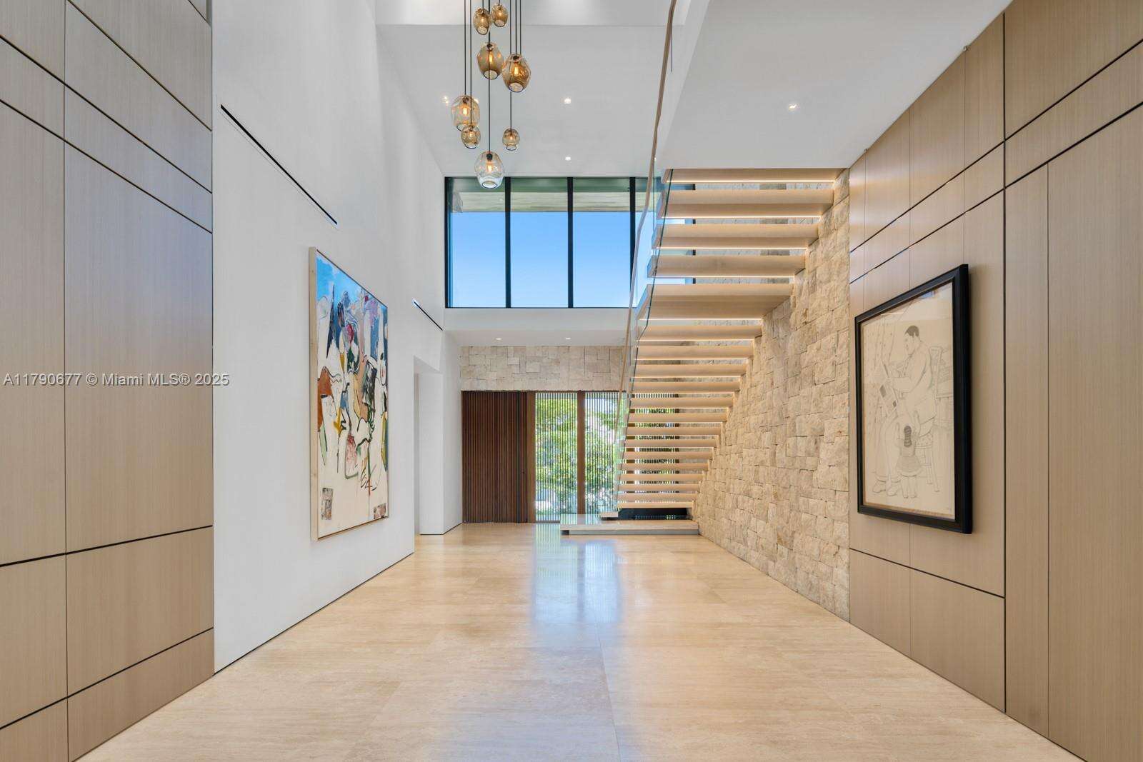Glamour in Golden Beach! Masterfully designed, this 2025 residence sets a new benchmark in waterfront modernism. Hand-placed stone, iroko wood, and clear glass interlace a 100-year olive tree. The grand foyer achieves 24' heights highlighting Italian oak-paneled walls that lead to a sophisticated salon. Curated by Fanny Haim, the worldly interiors include a travertine bar in the bespoke media lounge, and stylized fireplaces & drapery throughout. The exceptional MiaCucina kitchen revolves around a bright breakfast area. An architectural staircase arrives to the primary suite’s dual dressing rooms and spacious marble bath enhanced by an upstairs library. A theater, office, gym, elevator & staff room complete the home. The resort pool shines with a cabana, Summer Kitchen, new dock + seawall.
