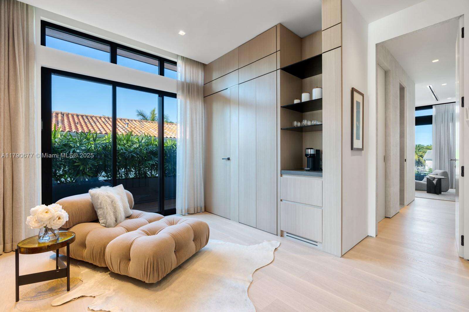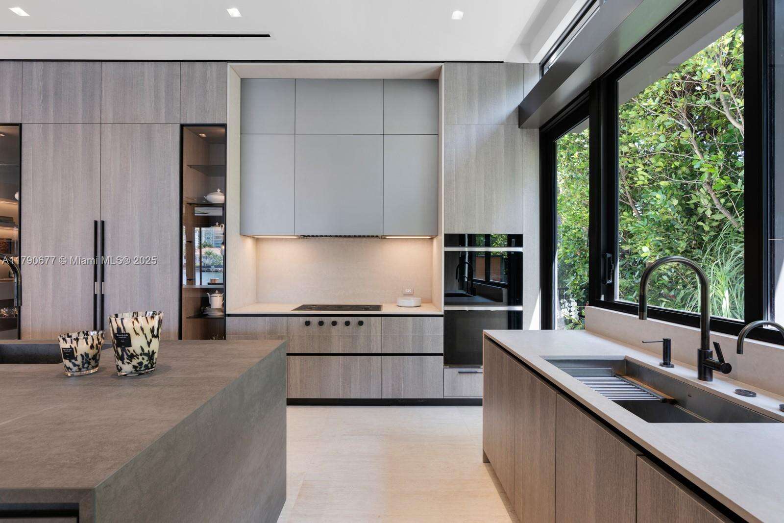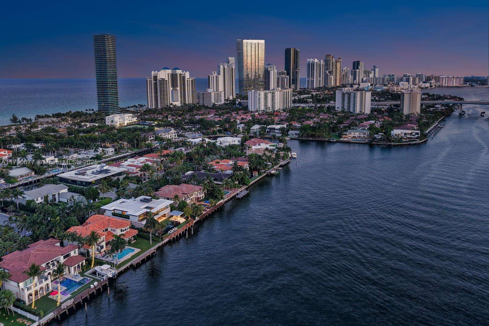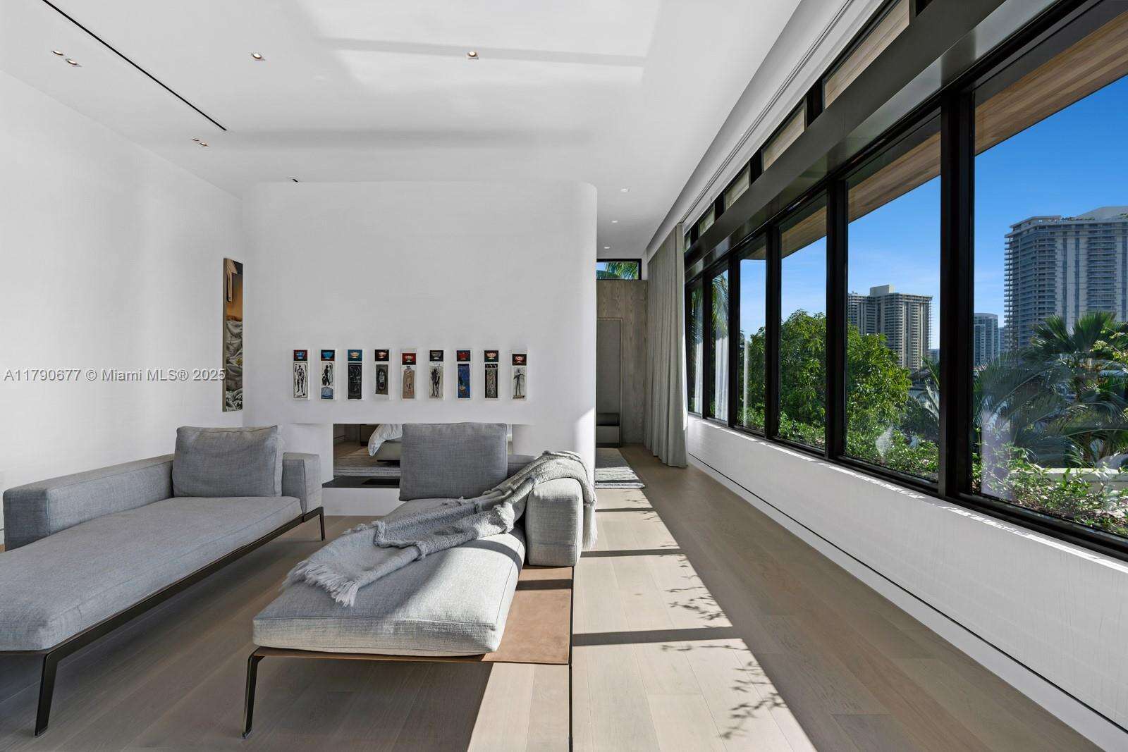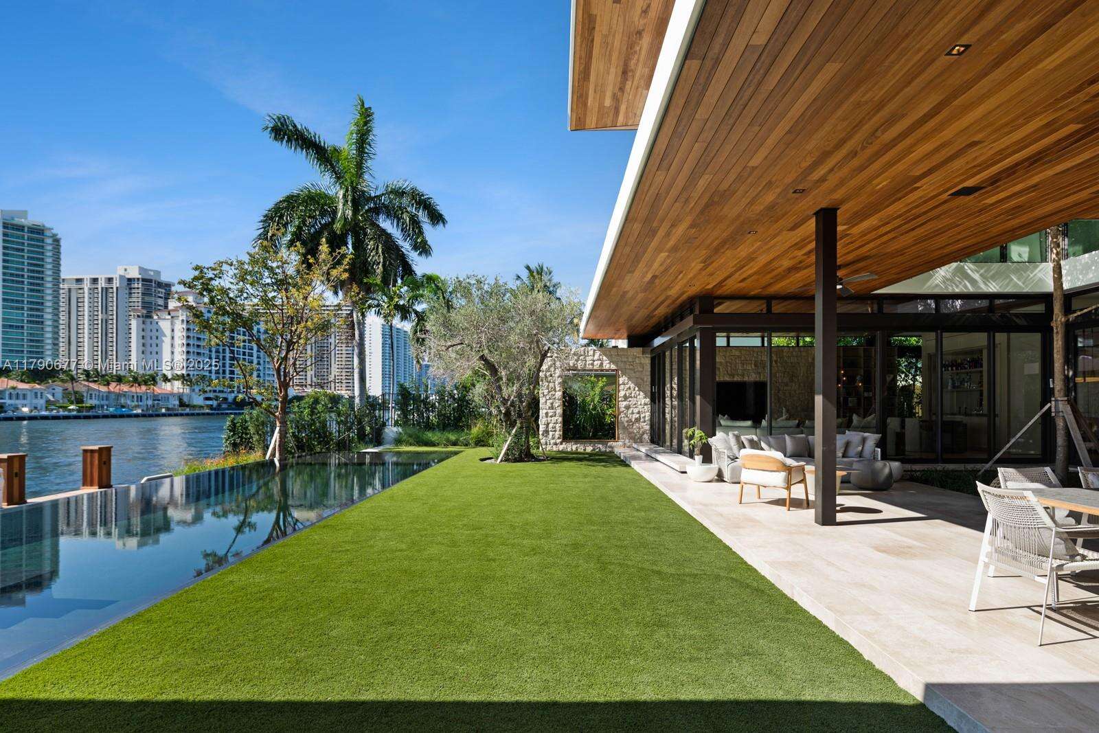 Glamour in Golden Beach! Masterfully designed, this 2025 residence sets a new benchmark in waterfront modernism. Hand-placed stone, iroko wood, and clear glass interlace a 100-year olive tree. The grand foyer achieves 24' heights highlighting Italian oak-paneled walls that lead to a sophisticated salon. Curated by Fanny Haim, the worldly interiors include a travertine bar in the bespoke media lounge, and stylized fireplaces & drapery throughout. The exceptional MiaCucina kitchen revolves around a bright breakfast area. An architectural staircase arrives to the primary suite’s dual dressing rooms and spacious marble bath enhanced by an upstairs library. A theater, office, gym, elevator & staff room complete the home. The resort pool shines with a cabana, Summer Kitchen, new dock + seawall.