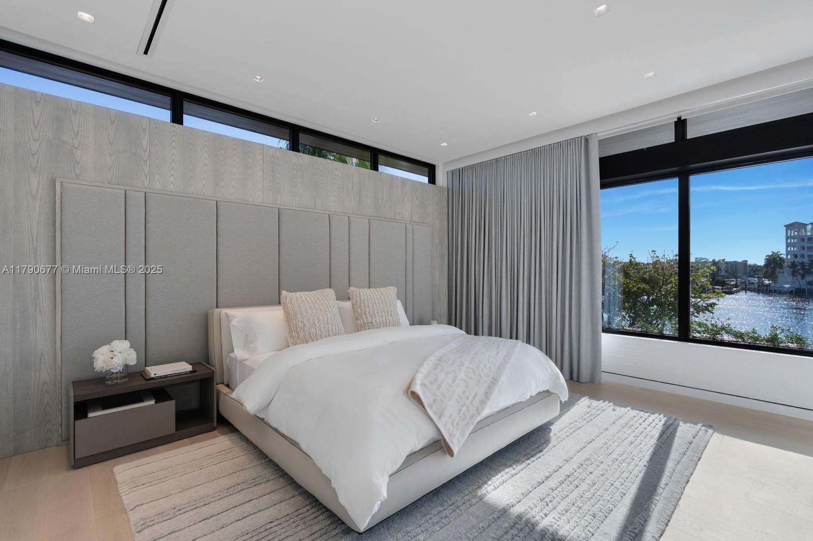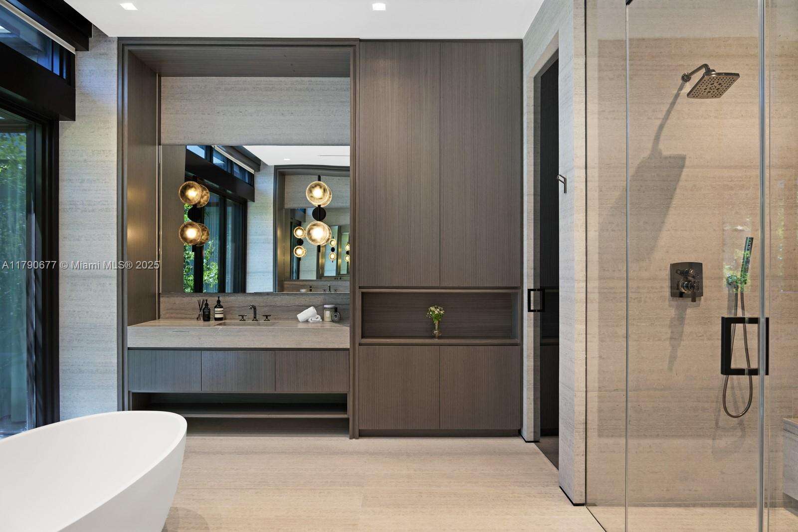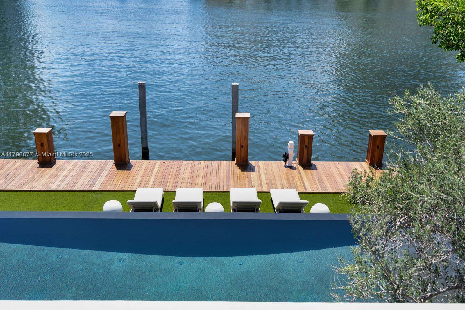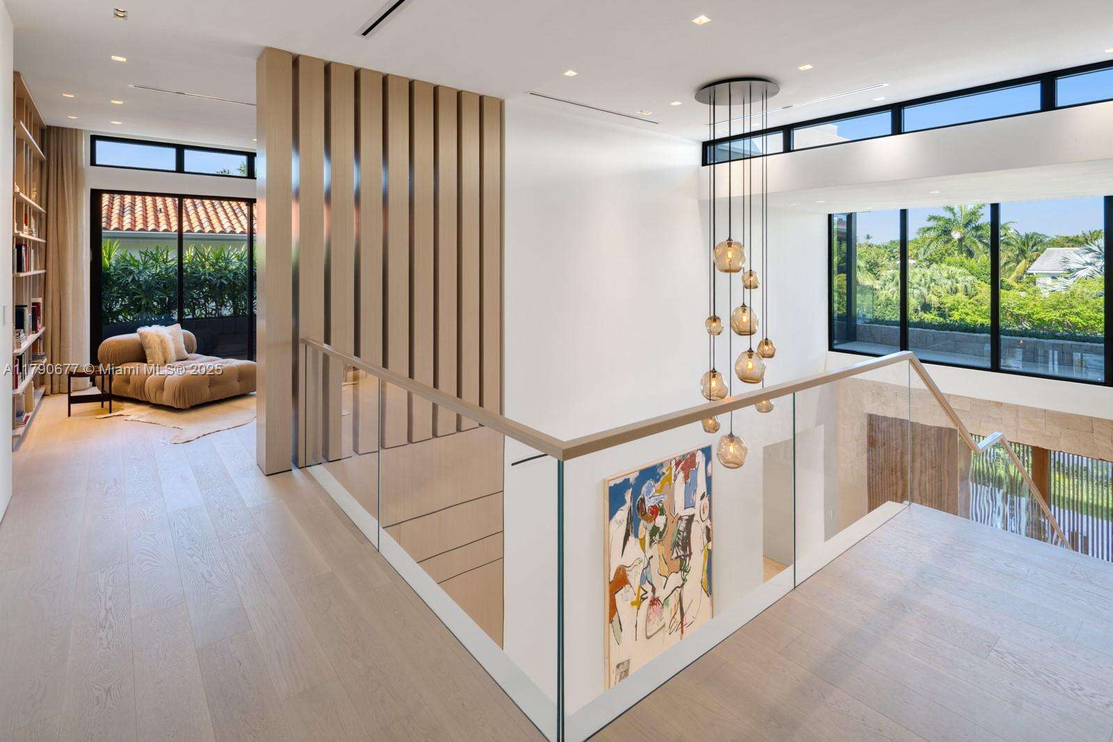 Glamour in Golden Beach! Masterfully designed, this 2025 residence sets a new benchmark in waterfront modernism. Hand-placed stone, iroko wood, and clear glass interlace a 100-year olive tree. The grand foyer achieves 24' heights highlighting Italian oak-paneled walls that lead to a sophisticated salon. Curated by Fanny Haim, the worldly interiors include a travertine bar in the bespoke media lounge, and stylized fireplaces & drapery throughout. The exceptional MiaCucina kitchen revolves around a bright breakfast area. An architectural staircase arrives to the primary suite’s dual dressing rooms and spacious marble bath enhanced by an upstairs library. A theater, office, gym, elevator & staff room complete the home. The resort pool shines with a cabana, Summer Kitchen, new dock + seawall.