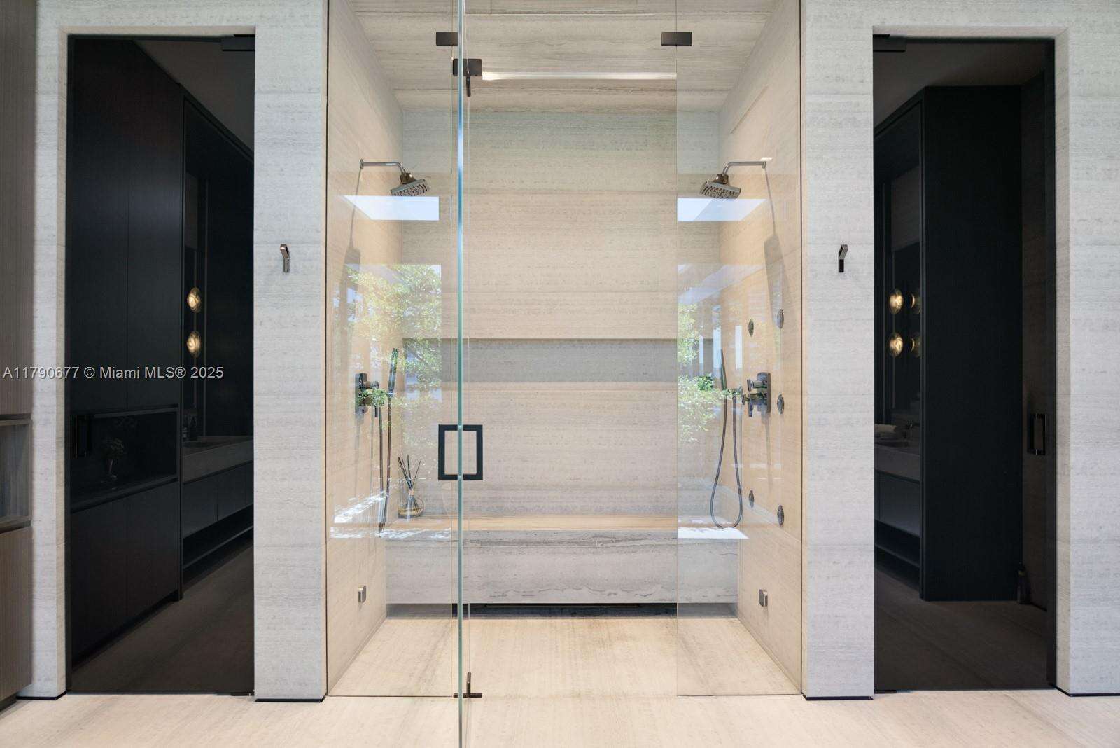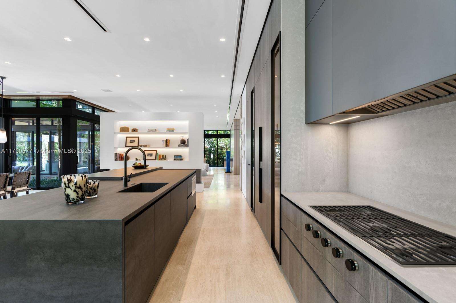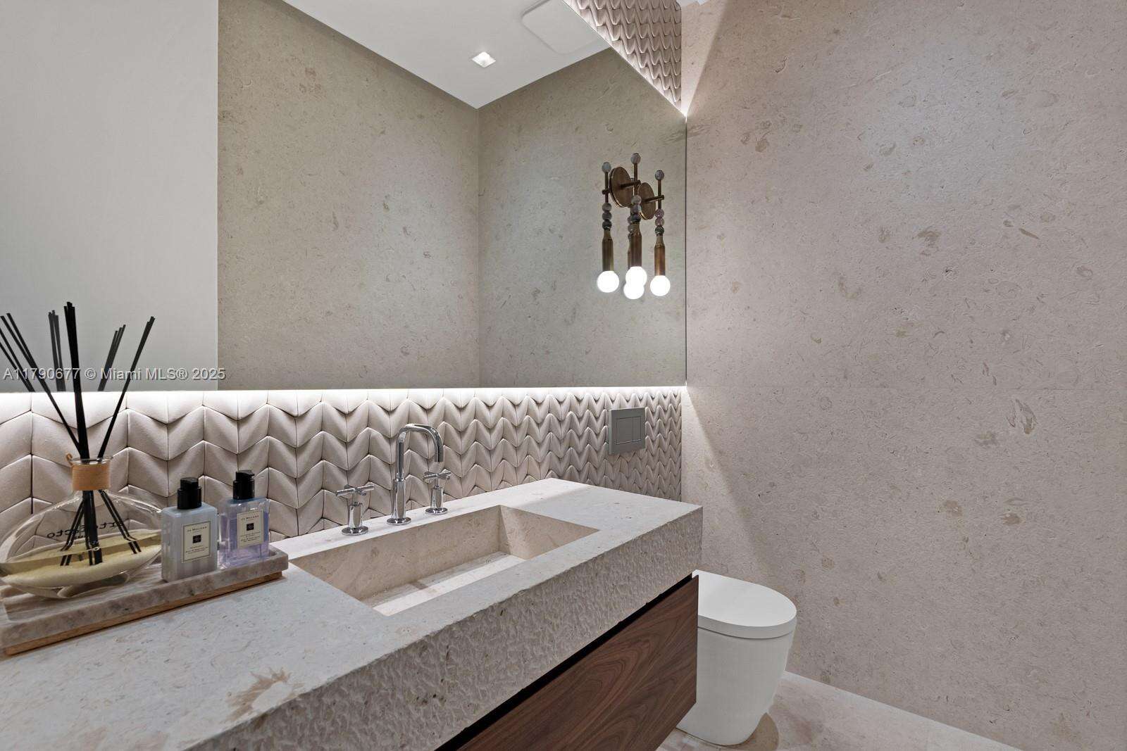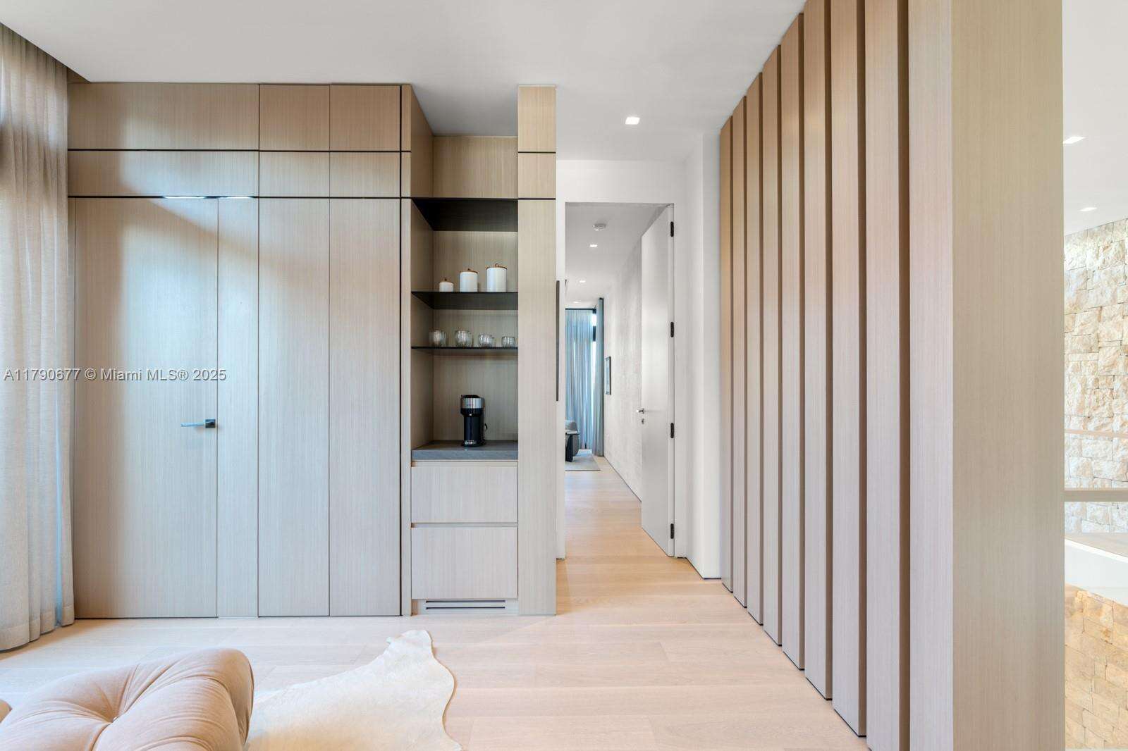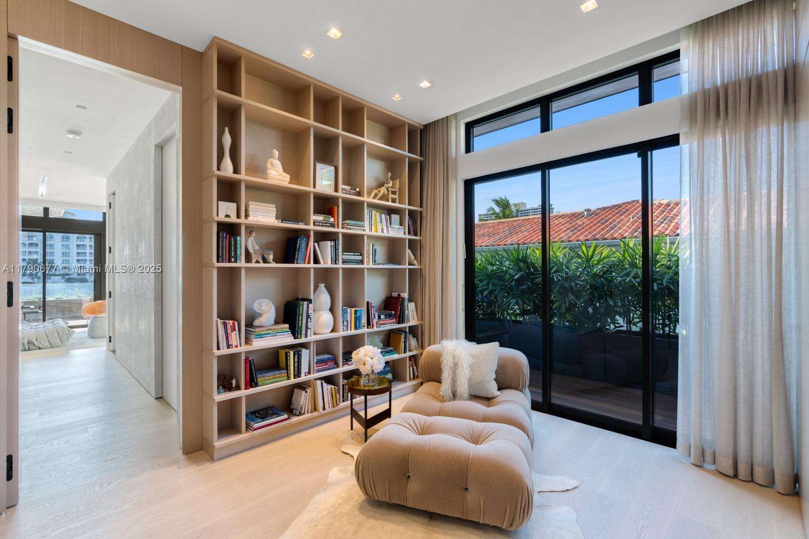 Glamour in Golden Beach! Masterfully designed, this 2025 residence sets a new benchmark in waterfront modernism. Hand-placed stone, iroko wood, and clear glass interlace a 100-year olive tree. The grand foyer achieves 24' heights highlighting Italian oak-paneled walls that lead to a sophisticated salon. Curated by Fanny Haim, the worldly interiors include a travertine bar in the bespoke media lounge, and stylized fireplaces & drapery throughout. The exceptional MiaCucina kitchen revolves around a bright breakfast area. An architectural staircase arrives to the primary suite’s dual dressing rooms and spacious marble bath enhanced by an upstairs library. A theater, office, gym, elevator & staff room complete the home. The resort pool shines with a cabana, Summer Kitchen, new dock + seawall.