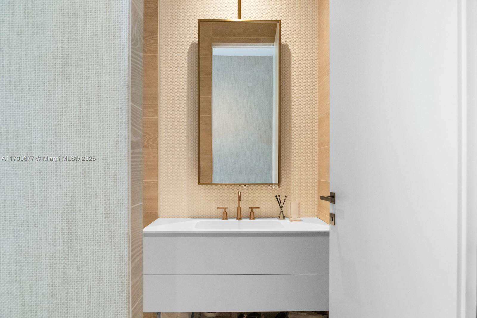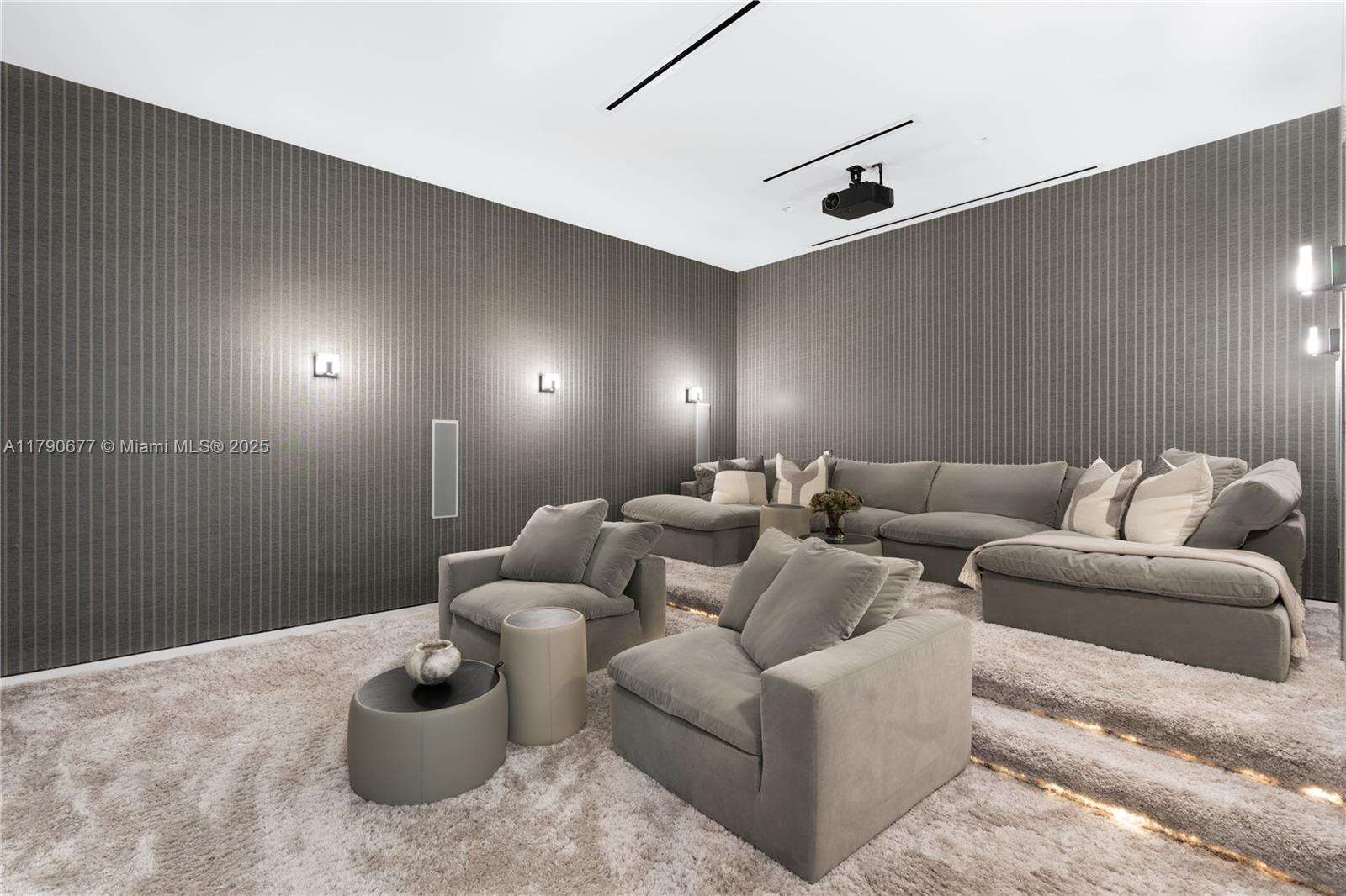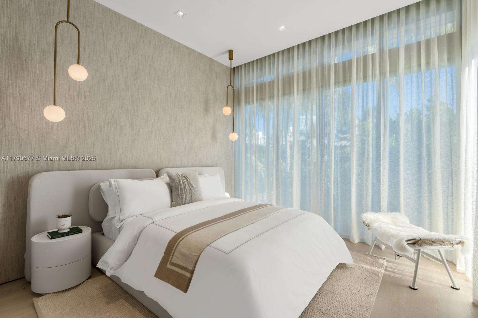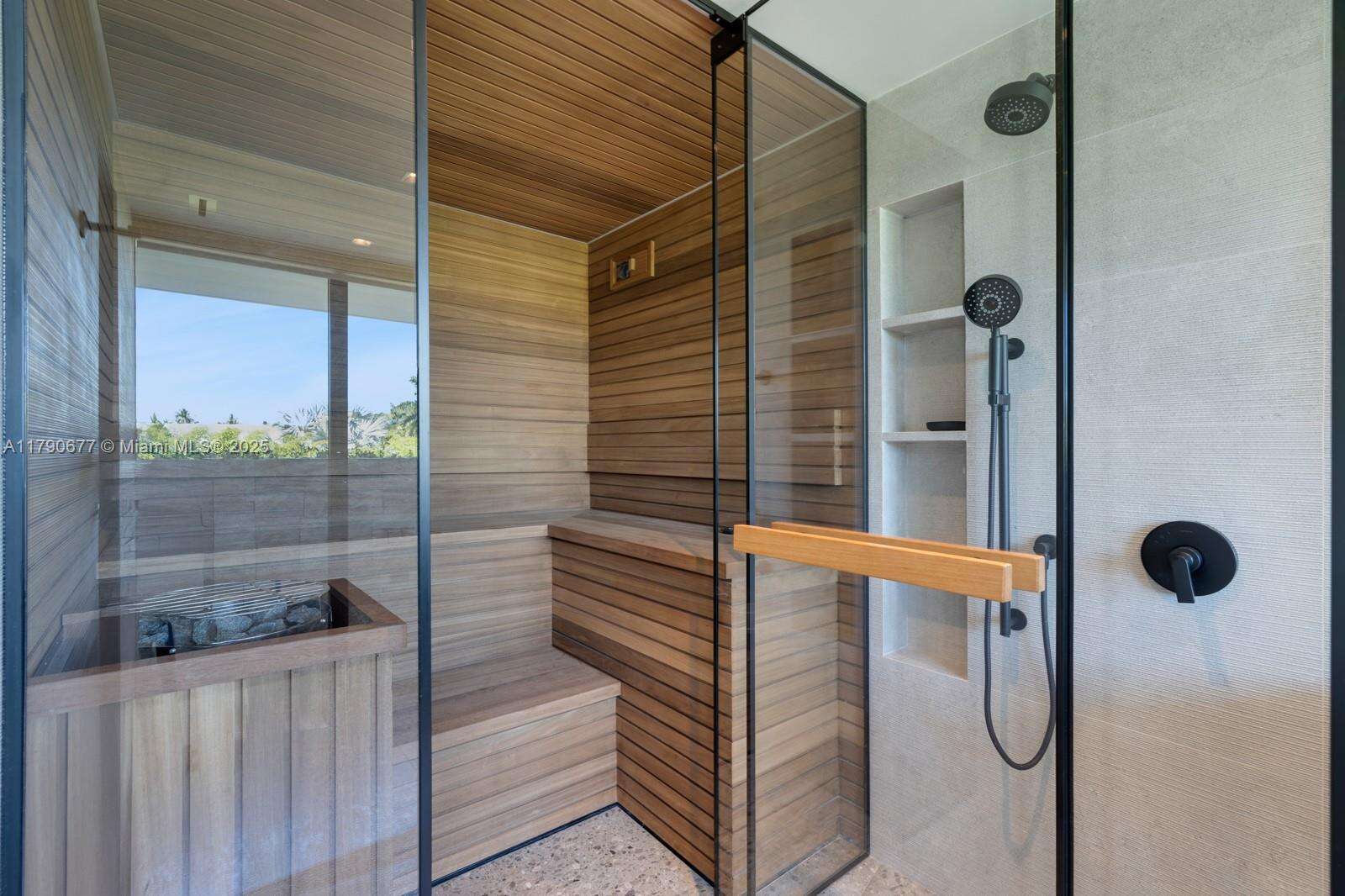 Glamour in Golden Beach! Masterfully designed, this 2025 residence sets a new benchmark in waterfront modernism. Hand-placed stone, iroko wood, and clear glass interlace a 100-year olive tree. The grand foyer achieves 24' heights highlighting Italian oak-paneled walls that lead to a sophisticated salon. Curated by Fanny Haim, the worldly interiors include a travertine bar in the bespoke media lounge, and stylized fireplaces & drapery throughout. The exceptional MiaCucina kitchen revolves around a bright breakfast area. An architectural staircase arrives to the primary suite’s dual dressing rooms and spacious marble bath enhanced by an upstairs library. A theater, office, gym, elevator & staff room complete the home. The resort pool shines with a cabana, Summer Kitchen, new dock + seawall.