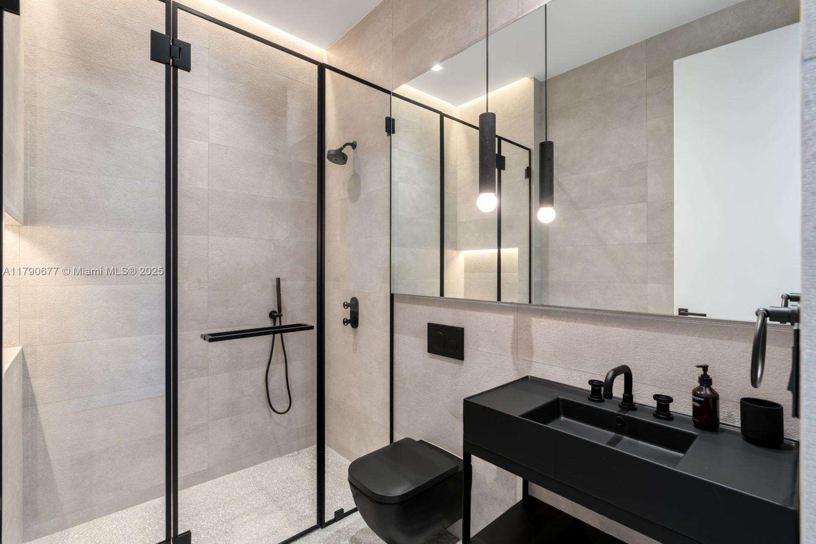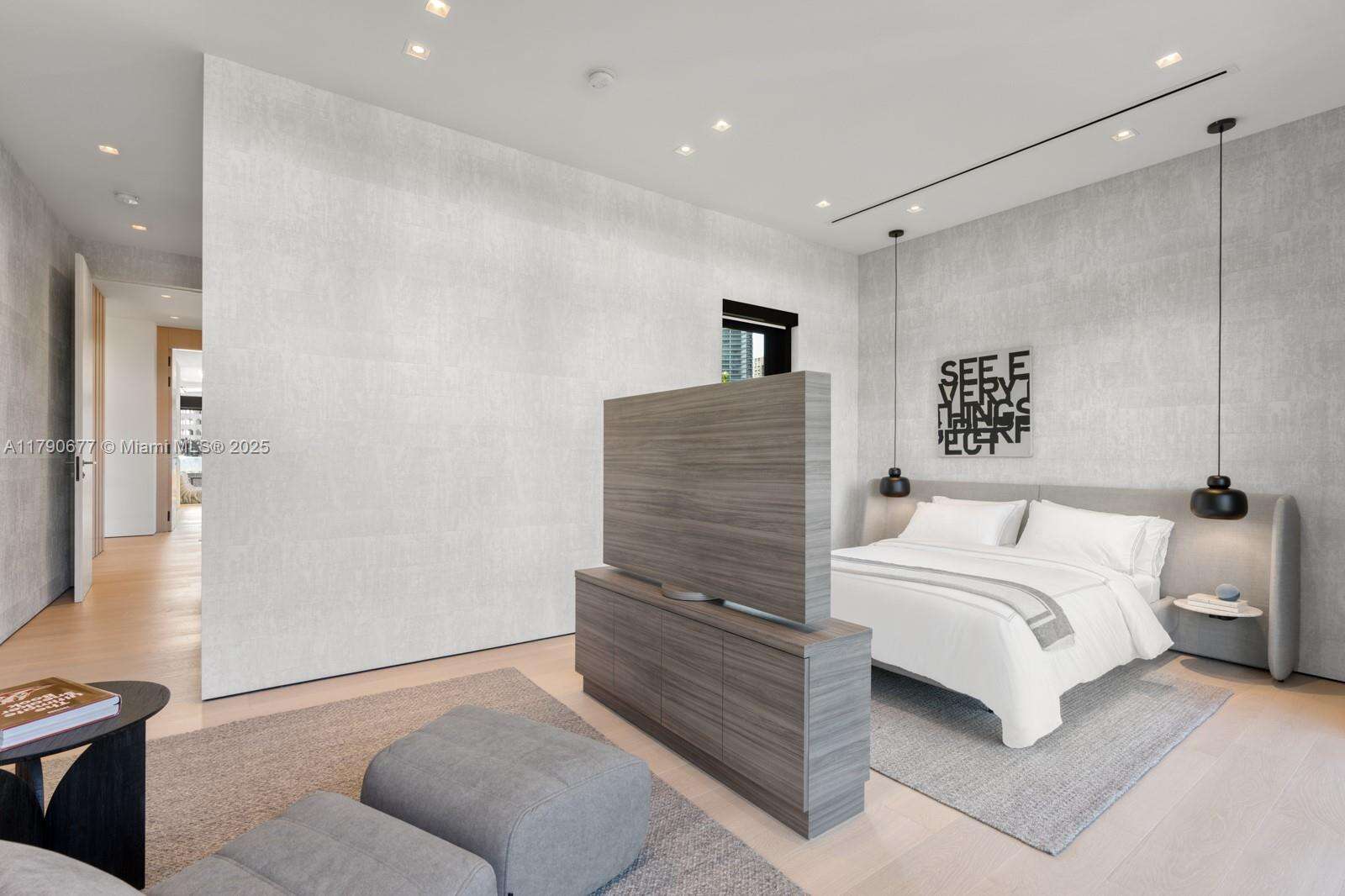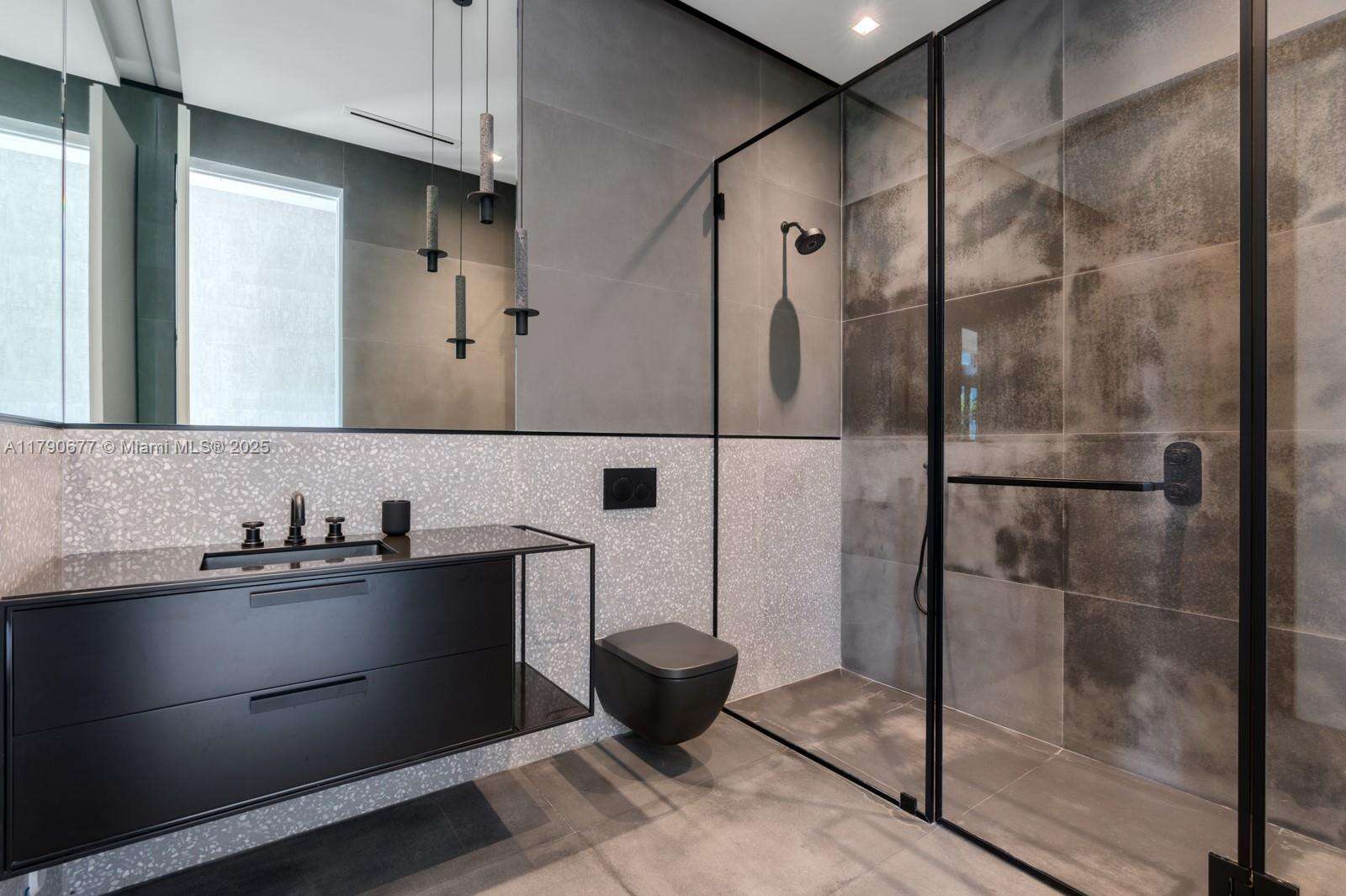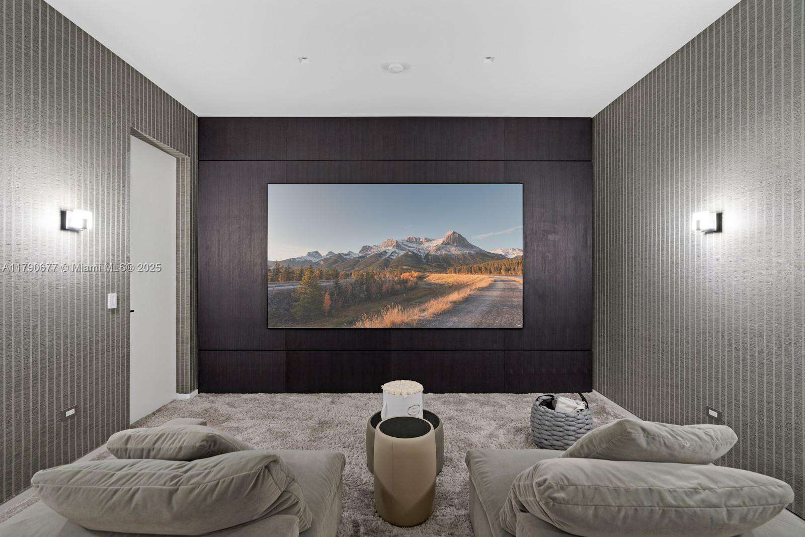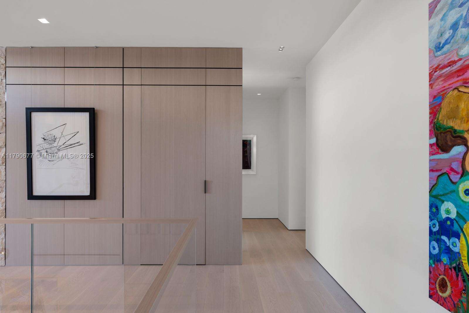 Glamour in Golden Beach! Masterfully designed, this 2025 residence sets a new benchmark in waterfront modernism. Hand-placed stone, iroko wood, and clear glass interlace a 100-year olive tree. The grand foyer achieves 24' heights highlighting Italian oak-paneled walls that lead to a sophisticated salon. Curated by Fanny Haim, the worldly interiors include a travertine bar in the bespoke media lounge, and stylized fireplaces & drapery throughout. The exceptional MiaCucina kitchen revolves around a bright breakfast area. An architectural staircase arrives to the primary suite’s dual dressing rooms and spacious marble bath enhanced by an upstairs library. A theater, office, gym, elevator & staff room complete the home. The resort pool shines with a cabana, Summer Kitchen, new dock + seawall.