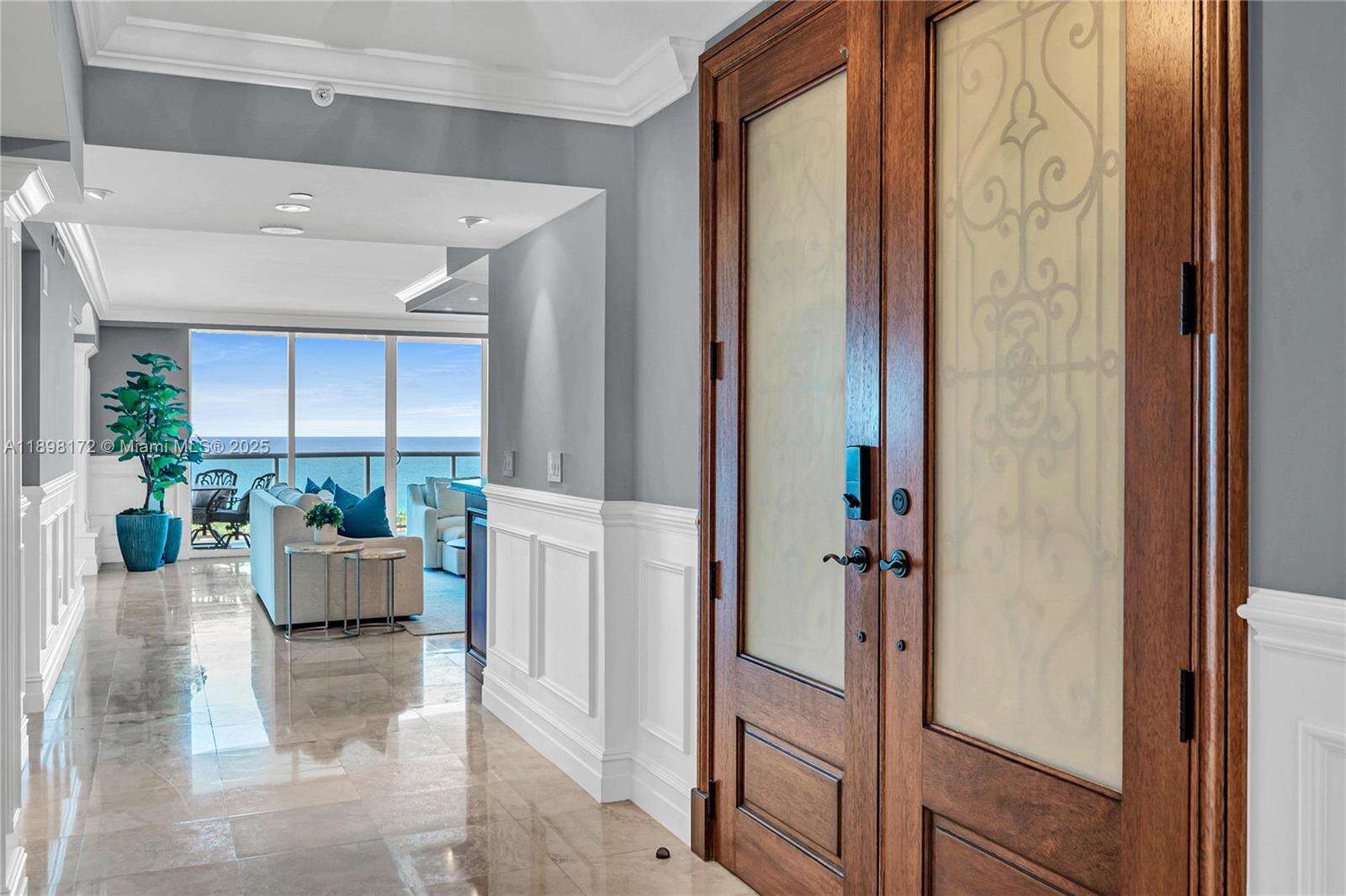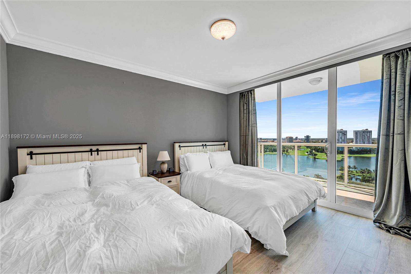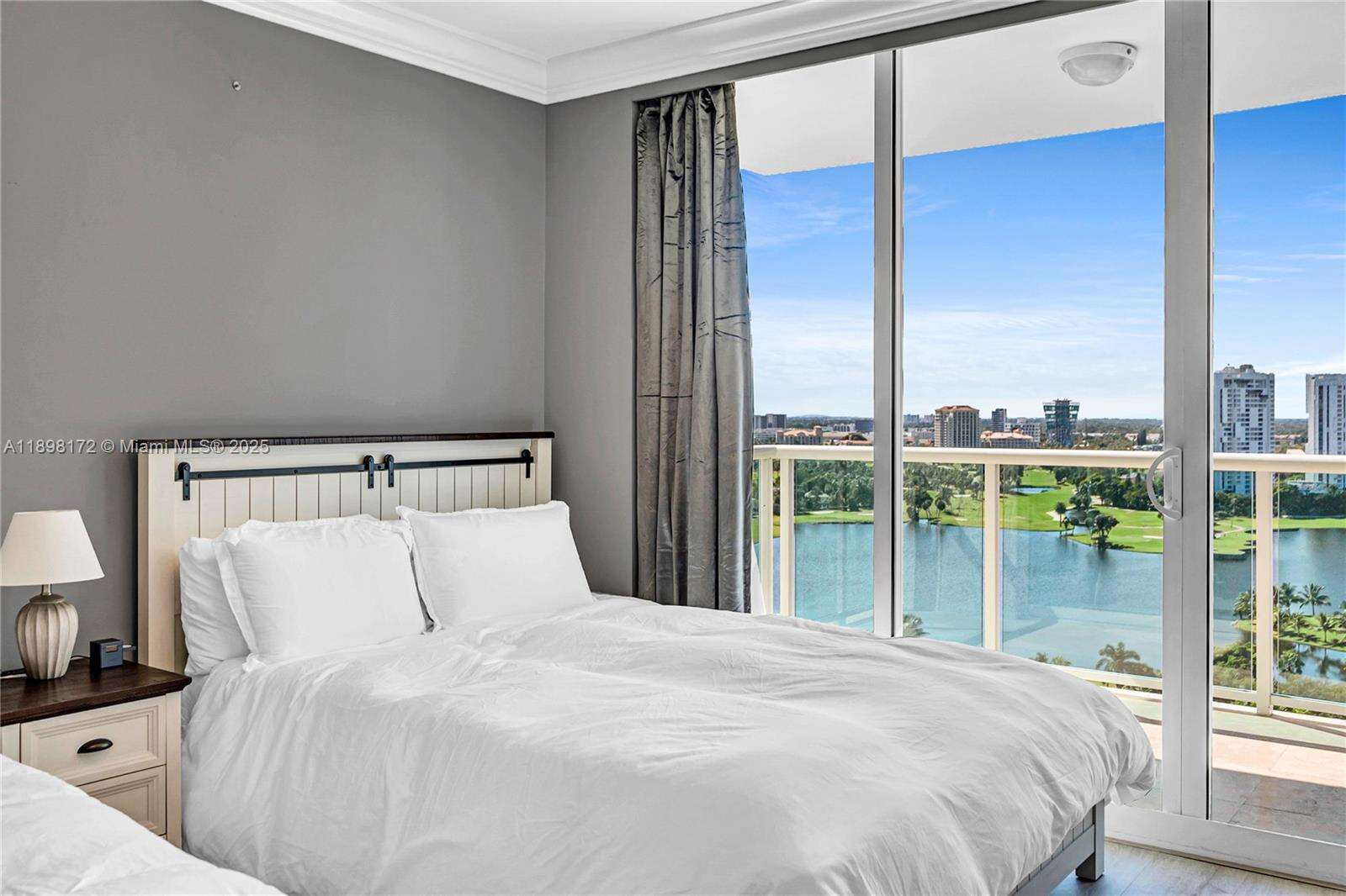 Step off your private elevator into this spacious waterfront residence featuring 2 bedrooms + den + home office and 2.5 baths. Enjoy a flow-through layout with stunning water and city views. The east terrace captures sunrises over the Intracoastal and Atlantic, while the west terrace offers sunsets over the Turnberry Golf Course and skyline. Highlights include marble floors, electric blinds, a built-in wet bar, stainless steel appliances, and a primary suite with walk-in closet and bathroom with dual vanities. Includes 2 assigned parking spaces and storage unit. Resort-style amenities: 24-hr security, valet, infinity pool, theater, tennis courts, gym, clubhouse, and on-site restaurant. Minutes from the beach and scenic walking path—the perfect blend of luxury and leisure living.