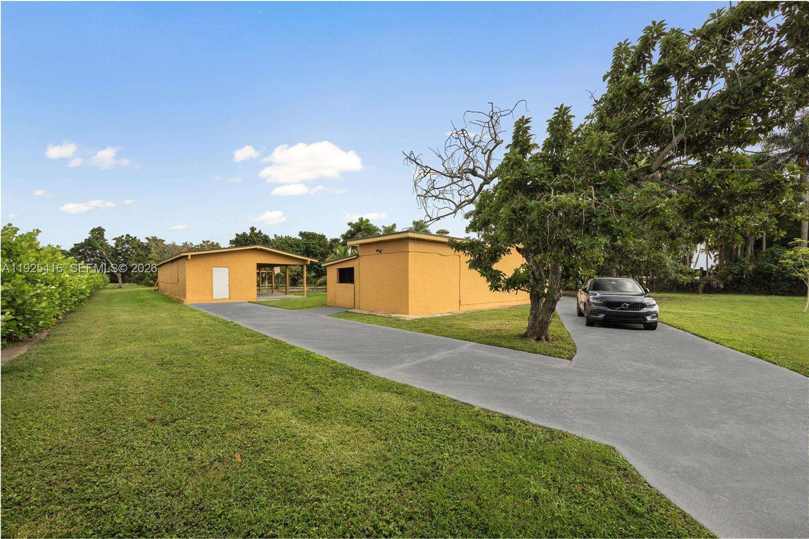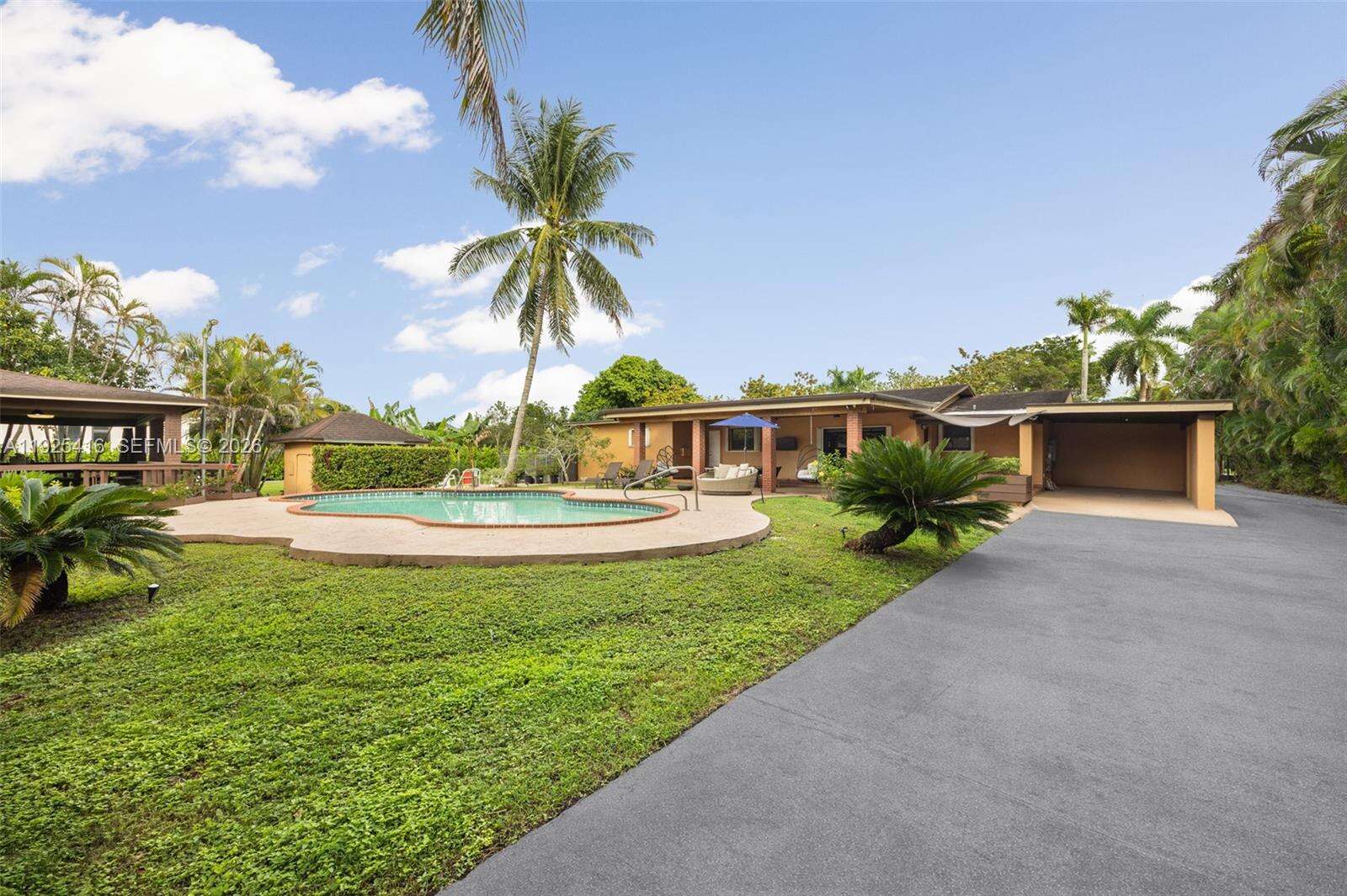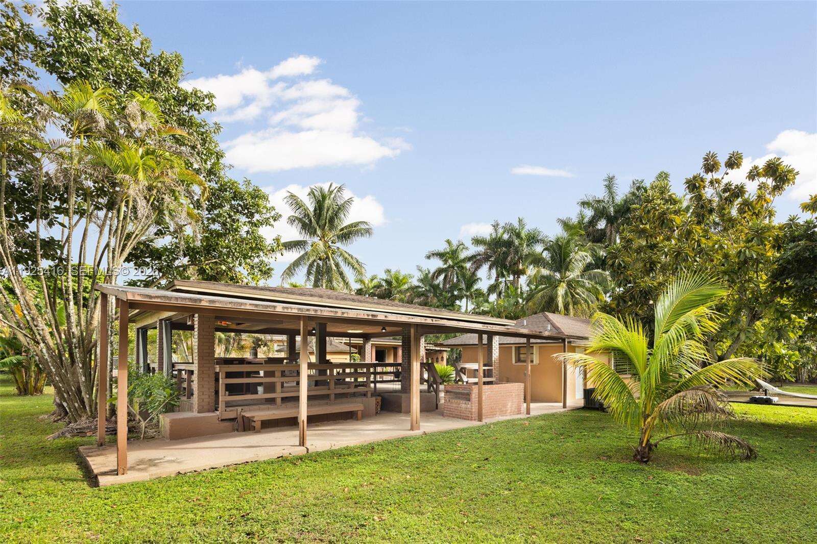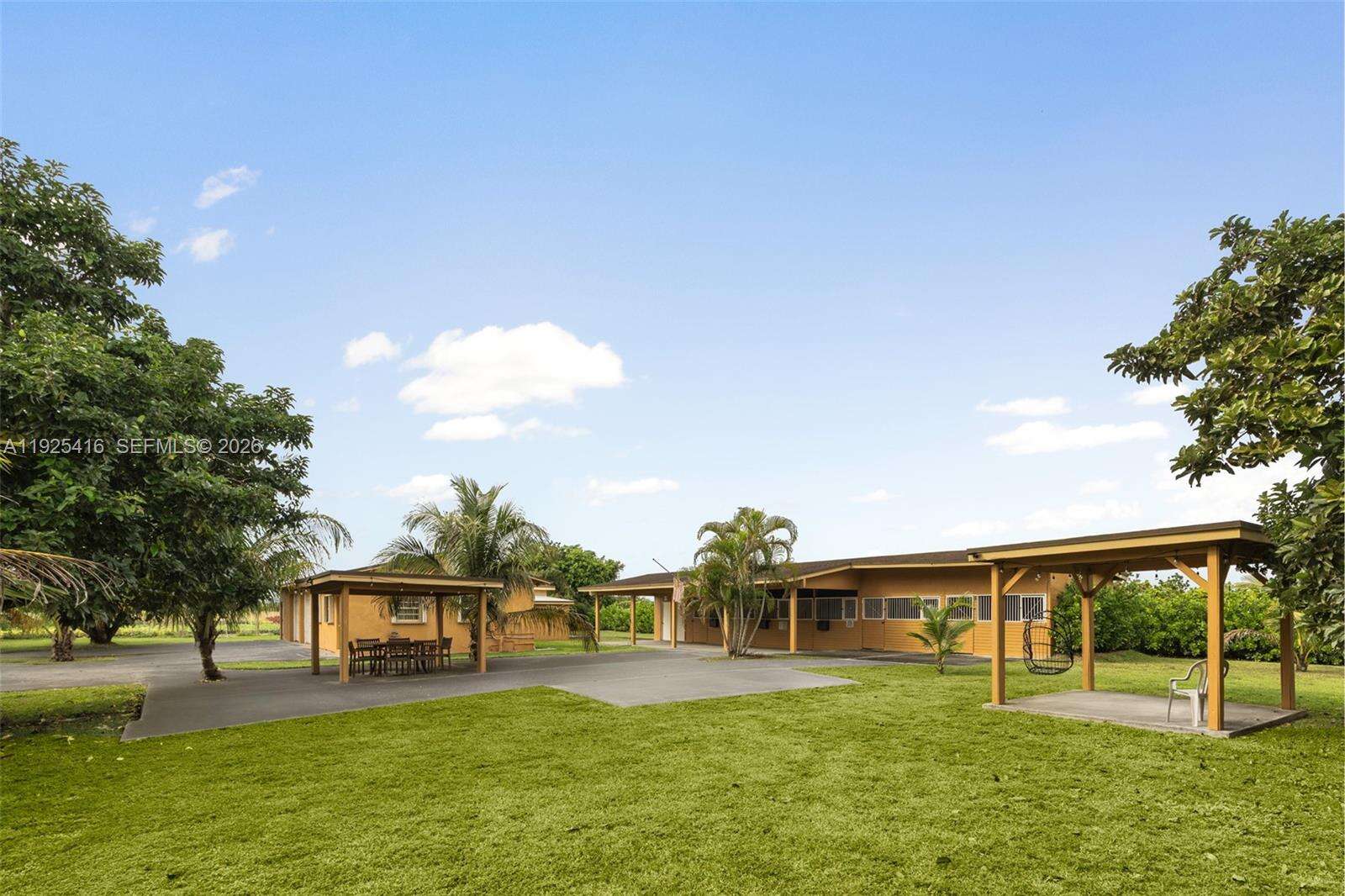 Tucked behind lush landscaping in the heart of the Redlands, this 2.42-acre tropical retreat offers a rare blend of serenity, recreation, and resort-style living. The 3-bed, 2-bath main residence features spacious interiors with open living areas, garden views, and a seamless indoor-outdoor flow. Across from the main house sits a detached game room/studio suite with full bath, plus a separate entertainment pavilion which boasts a bar and grill, as a covered lounge. Outside, enjoy a sparkling kidney-shaped pool surrounded by fruit trees, flowering gardens, and shaded patios. Located at the back of the property, sits a 2-car garage with a connected 1-bed/1-bath apartment. The grounds are a horticultural haven with more than a dozen varieties of tropical fruit trees, mature palms, and lush plantings that create a true sense of escape. Designed for both relaxation and activity, the property includes stables to board 5-horses, and a rare private indoor sports shooting range. Additional features in the main house include a formal dining area, dual primary suites, whirlpool tub, accordion shutters, and a full-house generator for peace of mind. As a family compound, private getaway, or equestrian paradise, this exceptional estate delivers a unique lifestyle immersed in the natural beauty and privacy of South Florida’s iconic Redland agricultural community.