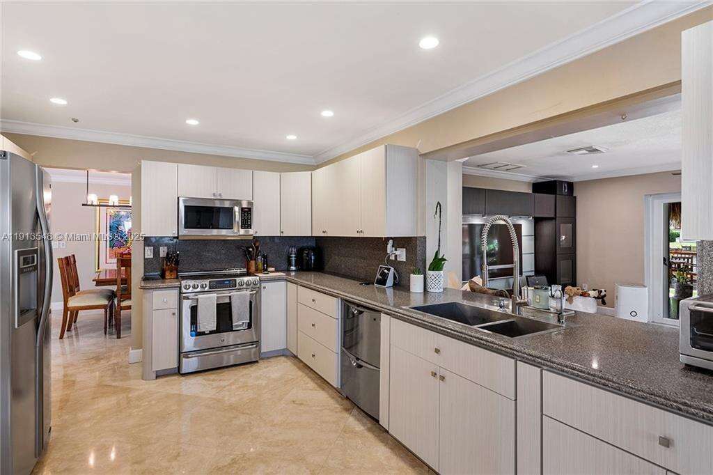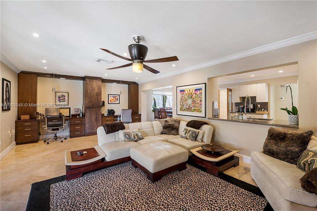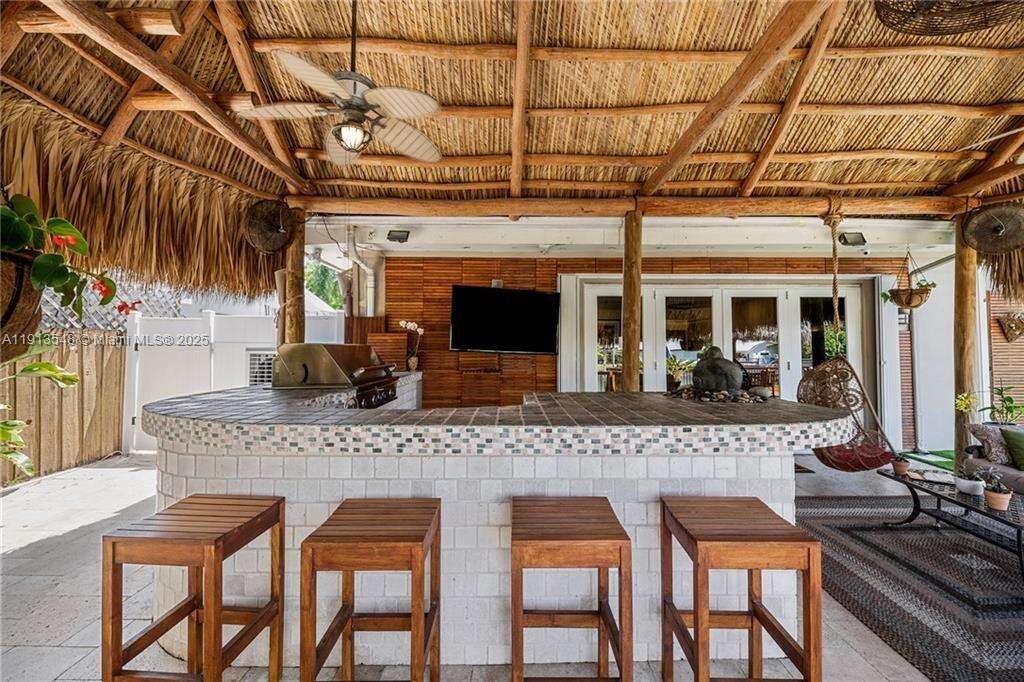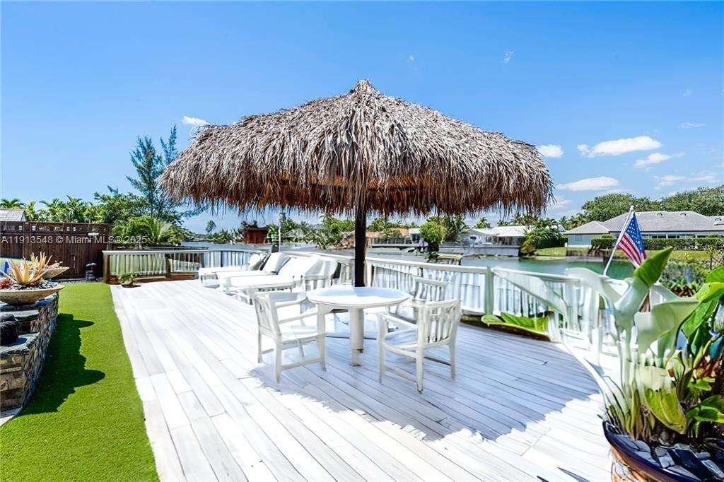 Discover true lakefront living in this beautifully upgraded 5BR/3BA home. Elegant 24x24 marble floors flow throughout, with wood flooring in the office and full impact glass windows and doors. The updated kitchen features stainless steel appliances and a modern master bath. Step outside to your private paradise with a tiki hut, electric fans, outdoor kitchen, teak dining area, and teak accent walls. Enjoy the soothing sounds of a waterfall, paddleboard or fish from your floating dock, or relax on the sand beach entry to the lake. Additional highlights include a circular driveway and lush tropical landscaping. Located in a top-rated school district and walking distance to houses of worship, this home offers the perfect blend of beauty, comfort, and lifestyle.