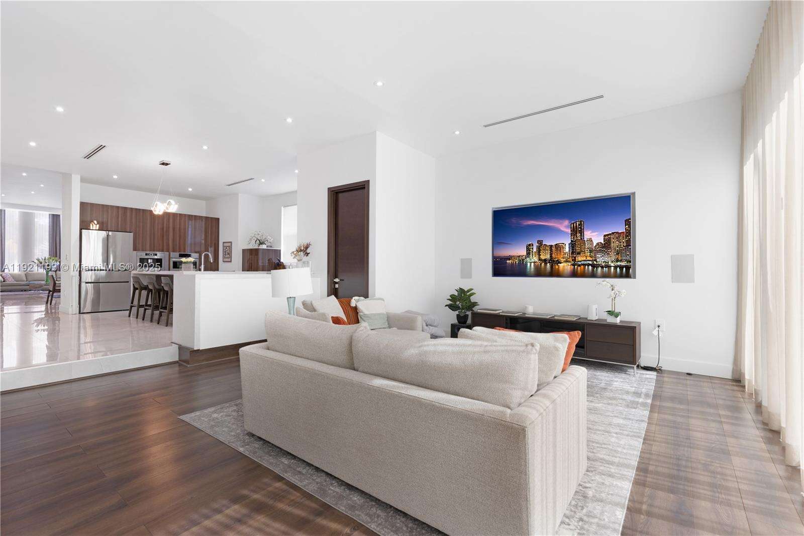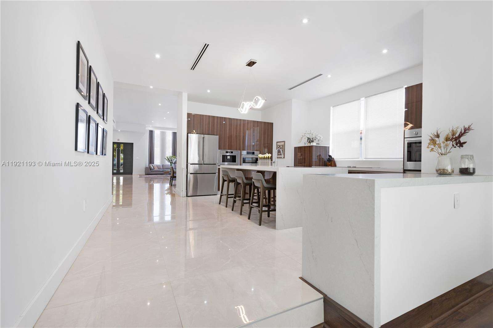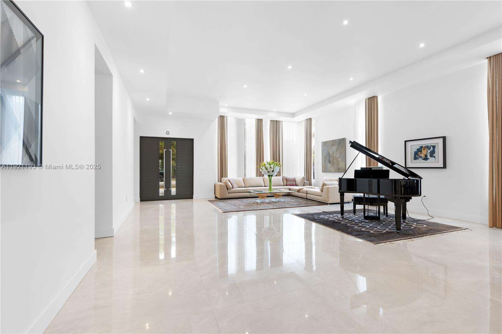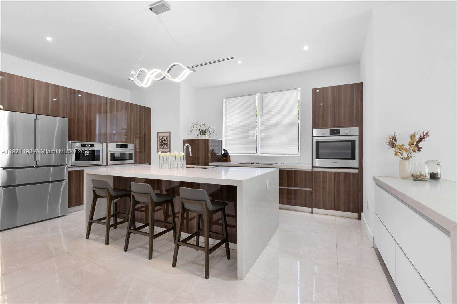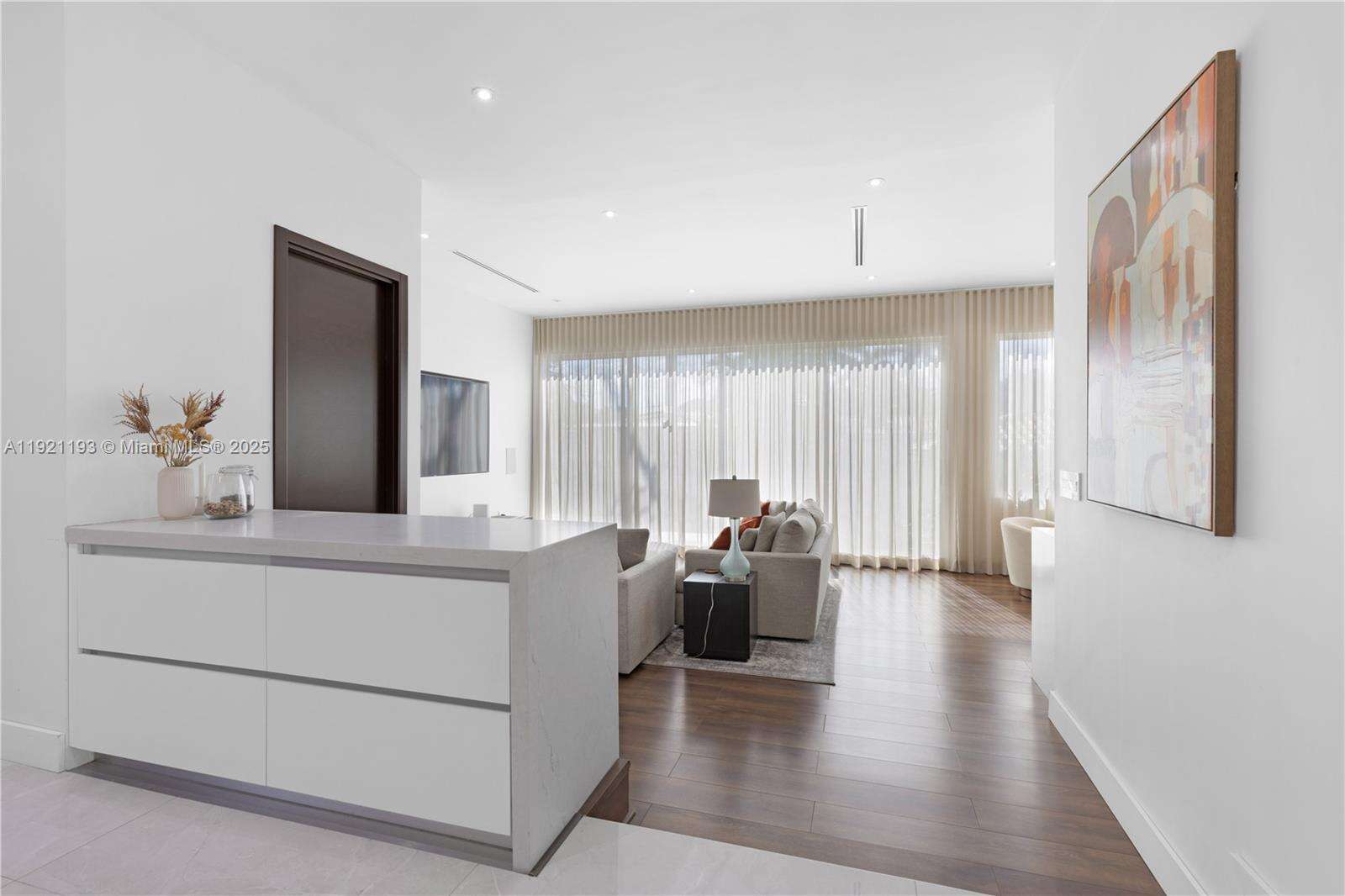 A residence of remarkable elegance, volume and presence throughout. Soaring 12-foot ceilings, expansive open spaces, and beautifully filtered natural light define this distinguished residence. Premium 48x48 Spanish ceramic flooring, 8-foot solid wood doors, and a sleek modern kitchen appointed with Bosch appliances elevate the home’s refined aesthetic. A private family room enhances the living experience with a built-in ice maker, wine cooler, and direct access to the terrace. Sliding glass doors open wide to create a seamless connection between the interior and the outdoor areas, extending the home’s sense of scale and comfort. Additional features include Toto ceramic fixtures, upgraded electrical installation for enhanced efficiency, and a strategically engineered AC system. Approved pool plans offer the opportunity to further elevate the exterior environment.