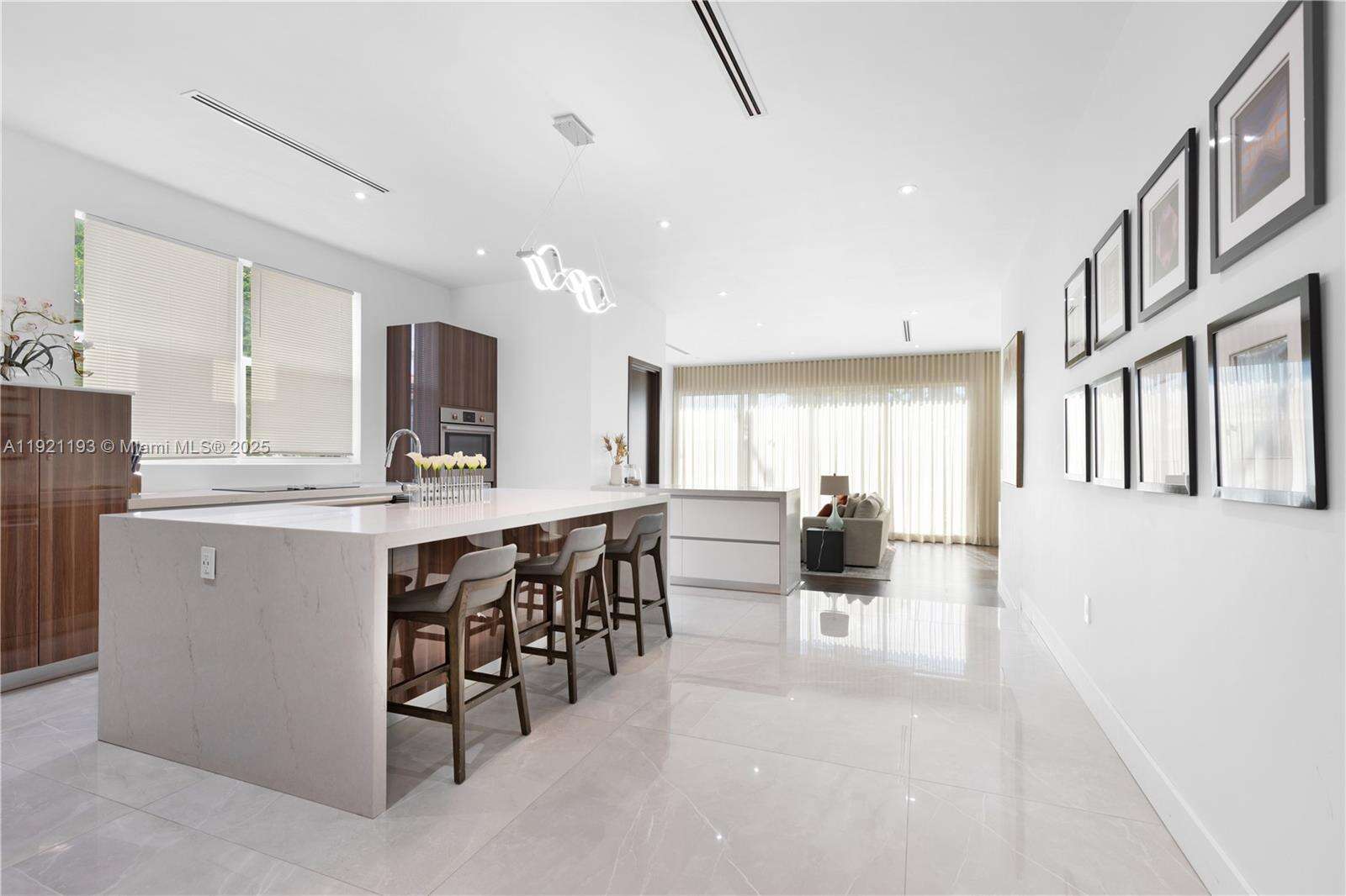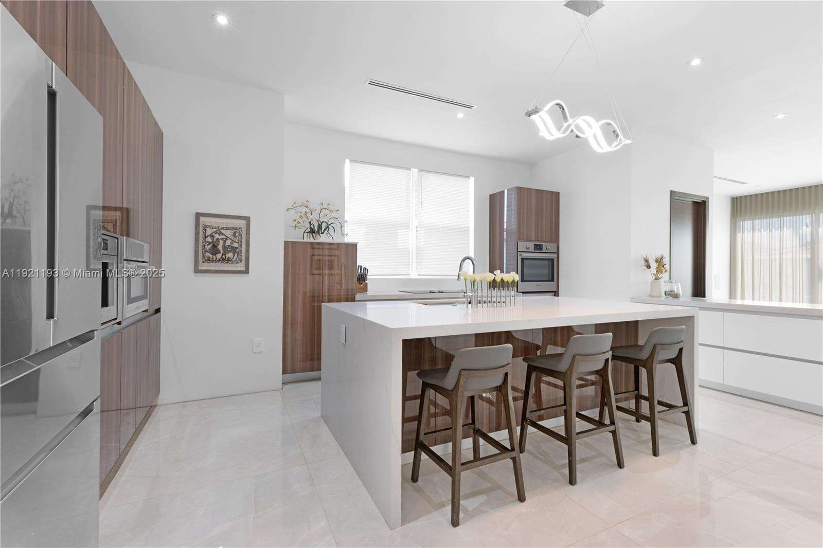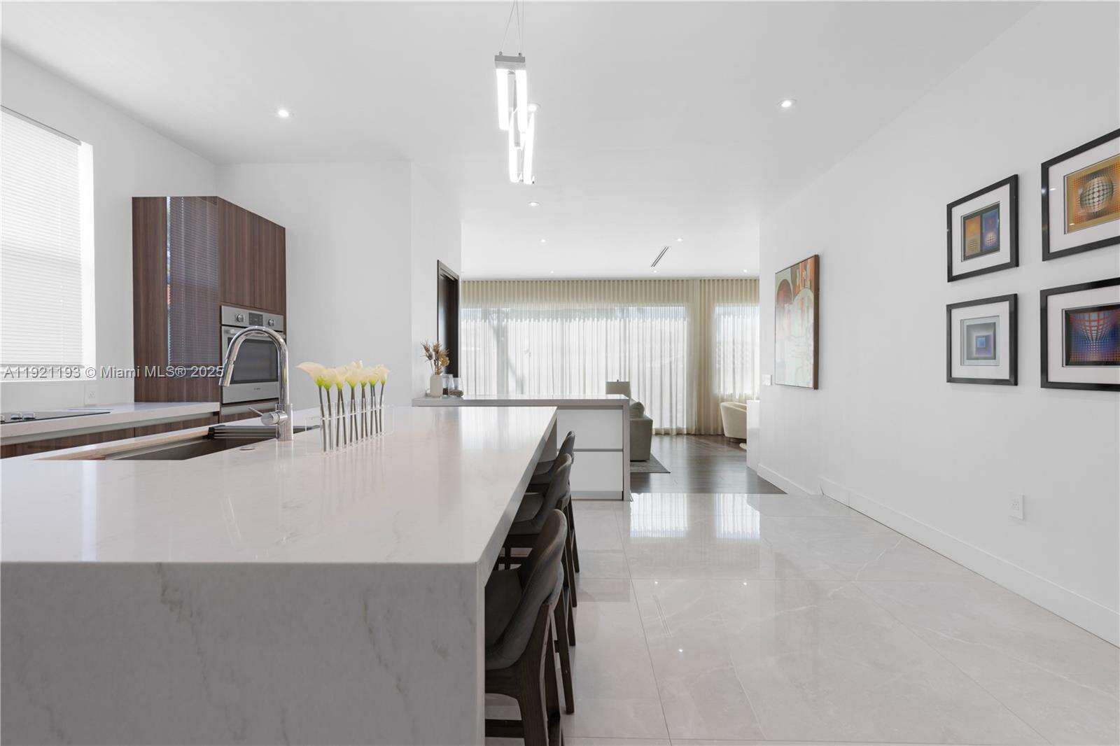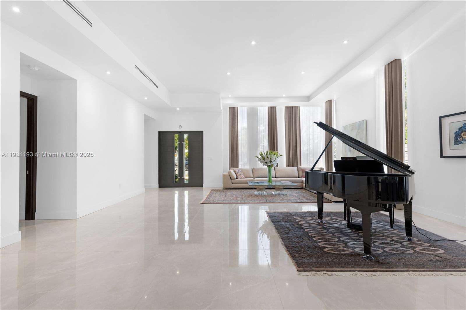 A residence of remarkable elegance, volume and presence throughout. Soaring 12-foot ceilings, expansive open spaces, and beautifully filtered natural light define this distinguished residence. Premium 48x48 Spanish ceramic flooring, 8-foot solid wood doors, and a sleek modern kitchen appointed with Bosch appliances elevate the home’s refined aesthetic. A private family room enhances the living experience with a built-in ice maker, wine cooler, and direct access to the terrace. Sliding glass doors open wide to create a seamless connection between the interior and the outdoor areas, extending the home’s sense of scale and comfort. Additional features include Toto ceramic fixtures, upgraded electrical installation for enhanced efficiency, and a strategically engineered AC system. Approved pool plans offer the opportunity to further elevate the exterior environment.