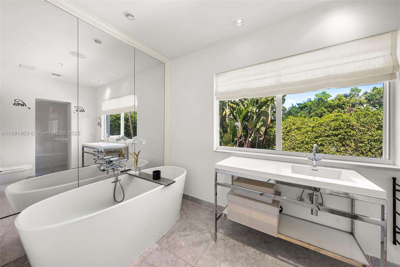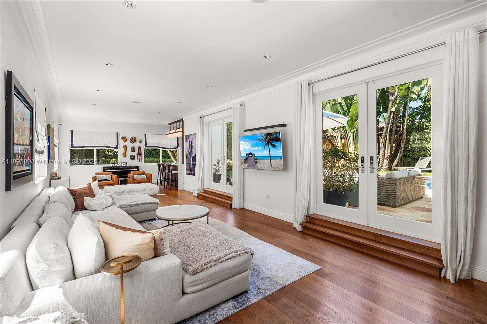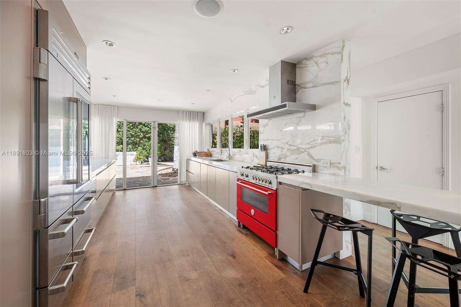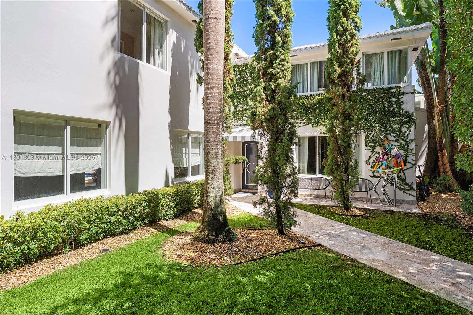 Impeccably renovated, this home in Miami Beach nestled amongst palm trees and 20-ft clusia hedges on prestigious North Bay Road, was designed in the Modern Deco style. This property features a massive living room with a bar, a master suite with 15-ft ceilings, a loft, electric shades, walk-in closets, and a spa bathroom with a steam shower, & a chef's kitchen with a Bertazzoni stove, Sub-Zero fridge, & marble counters. This 6 bed, 6.5 bath house includes walnut hardwood floors, impact windows, a smart home system, a formal dining room, & a separate guest suite. The backyard boasts a heated, mosaic 40-ft long pool, a covered outdoor kitchen and dining area, plus a spacious lawn. This home comes with parking for 10 cars in total. This private oasis is a must-see!