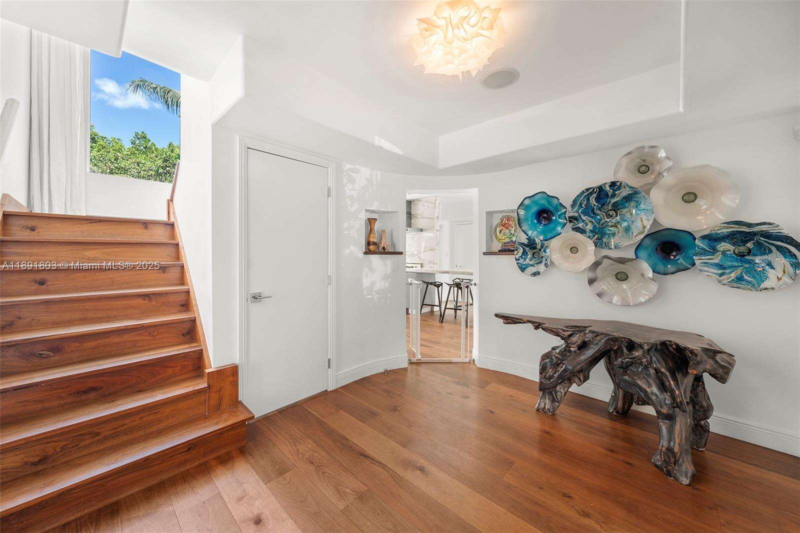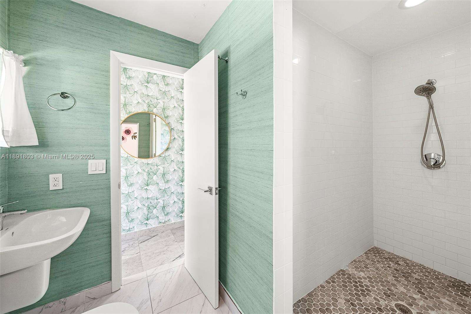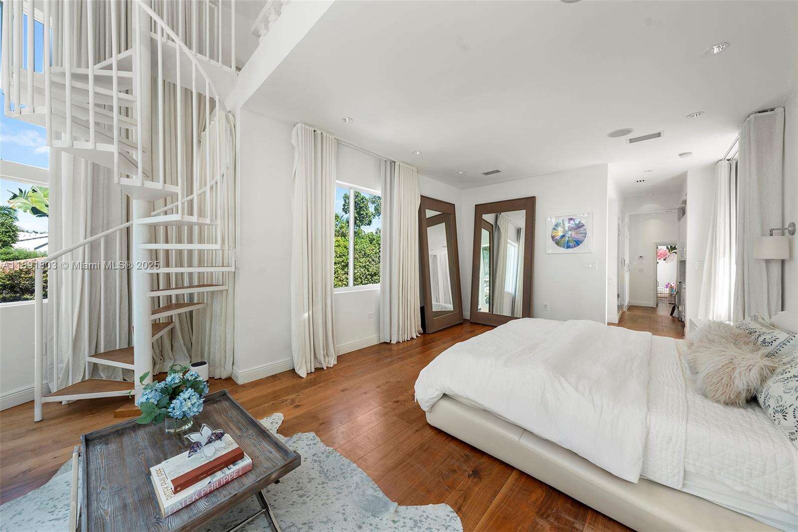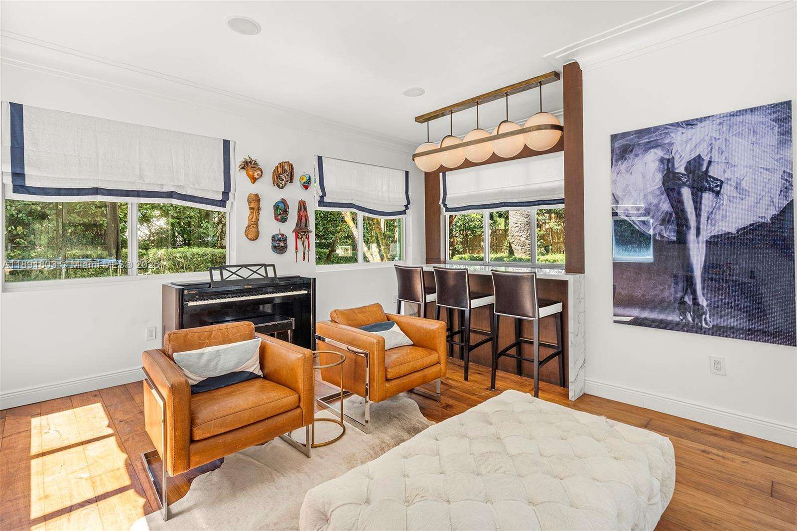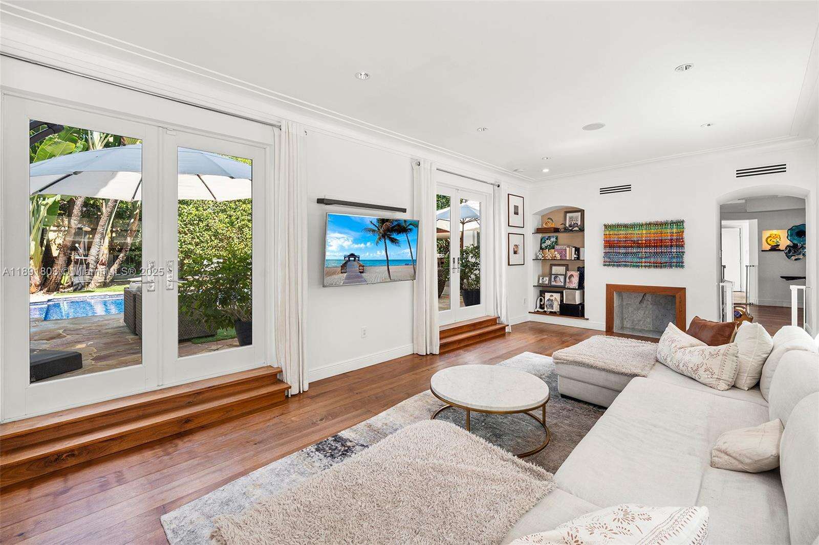 Impeccably renovated, this home in Miami Beach nestled amongst palm trees and 20-ft clusia hedges on prestigious North Bay Road, was designed in the Modern Deco style. This property features a massive living room with a bar, a master suite with 15-ft ceilings, a loft, electric shades, walk-in closets, and a spa bathroom with a steam shower, & a chef's kitchen with a Bertazzoni stove, Sub-Zero fridge, & marble counters. This 6 bed, 6.5 bath house includes walnut hardwood floors, impact windows, a smart home system, a formal dining room, & a separate guest suite. The backyard boasts a heated, mosaic 40-ft long pool, a covered outdoor kitchen and dining area, plus a spacious lawn. This home comes with parking for 10 cars in total. This private oasis is a must-see!
