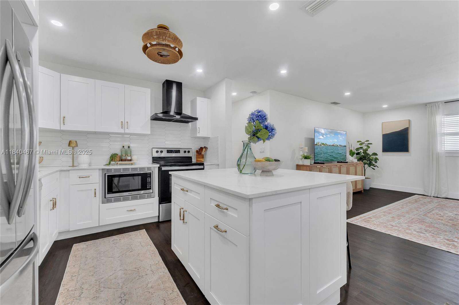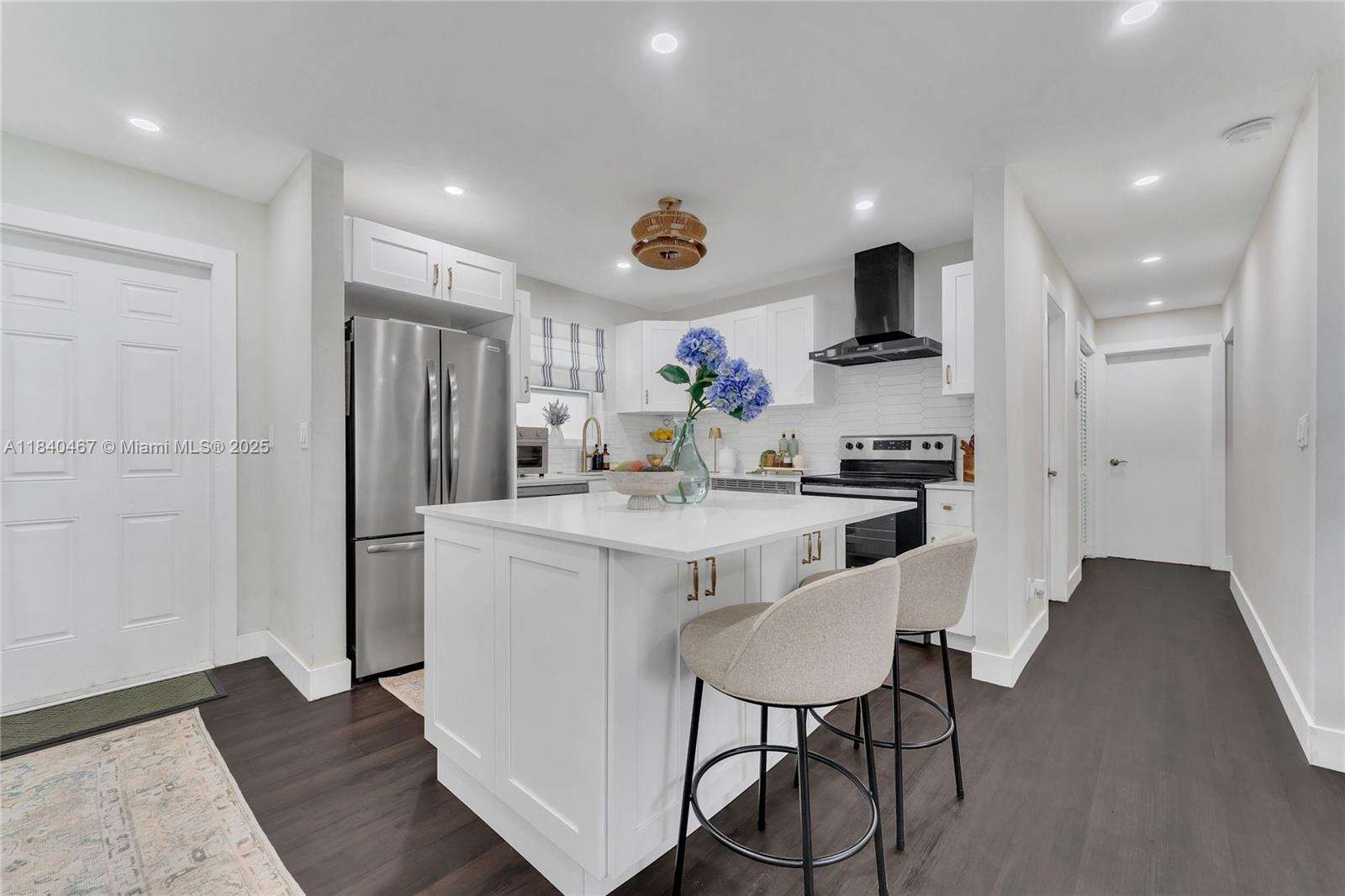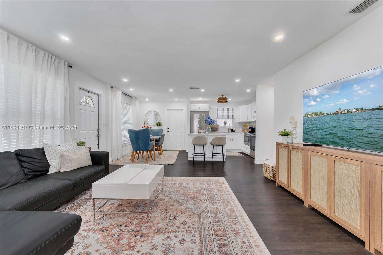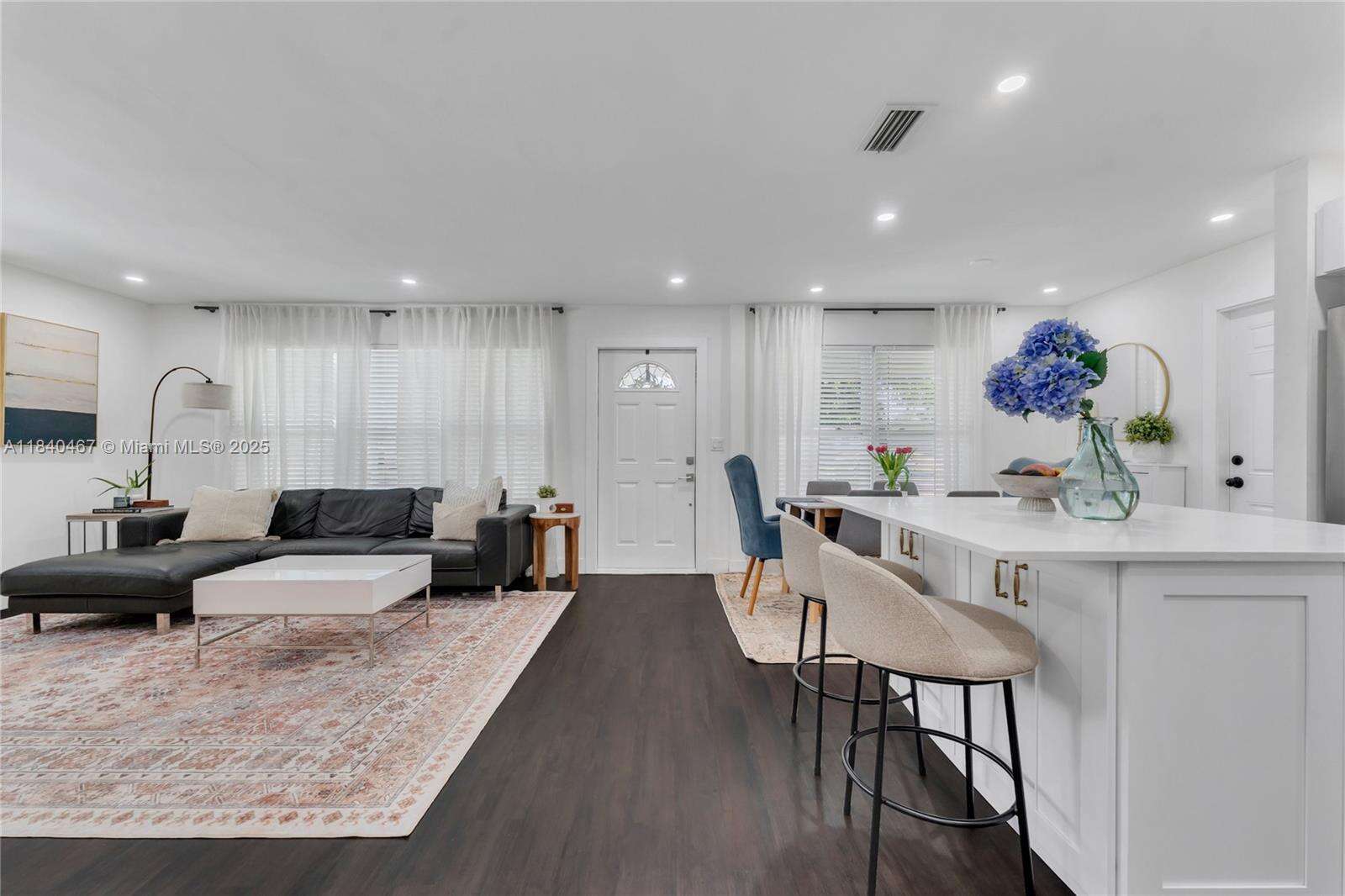 Welcome to this beautiful 3-bed, 2-bath home located in a quiet neighborhood near I-95 and the Hollywood beaches. The kitchen is a standout feature with brand-new cabinets, quartz countertops, a center island, stainless steel appliances including a dishwasher, microwave, and hood. The primary bedroom includes its own private ensuite with a stand-up shower, while the guest bathroom offers a full tub. Recent upgrades include new roof (2024), new laminate flooring (2024), new washer and dryer, and new recessed lighting throughout. The property offers a large backyard with mature fruit trees and plenty of untouched space. Whether you envision a pool or in-law the yard provides endless opportunity. Zoned for multi-family use, this property has investment potential!