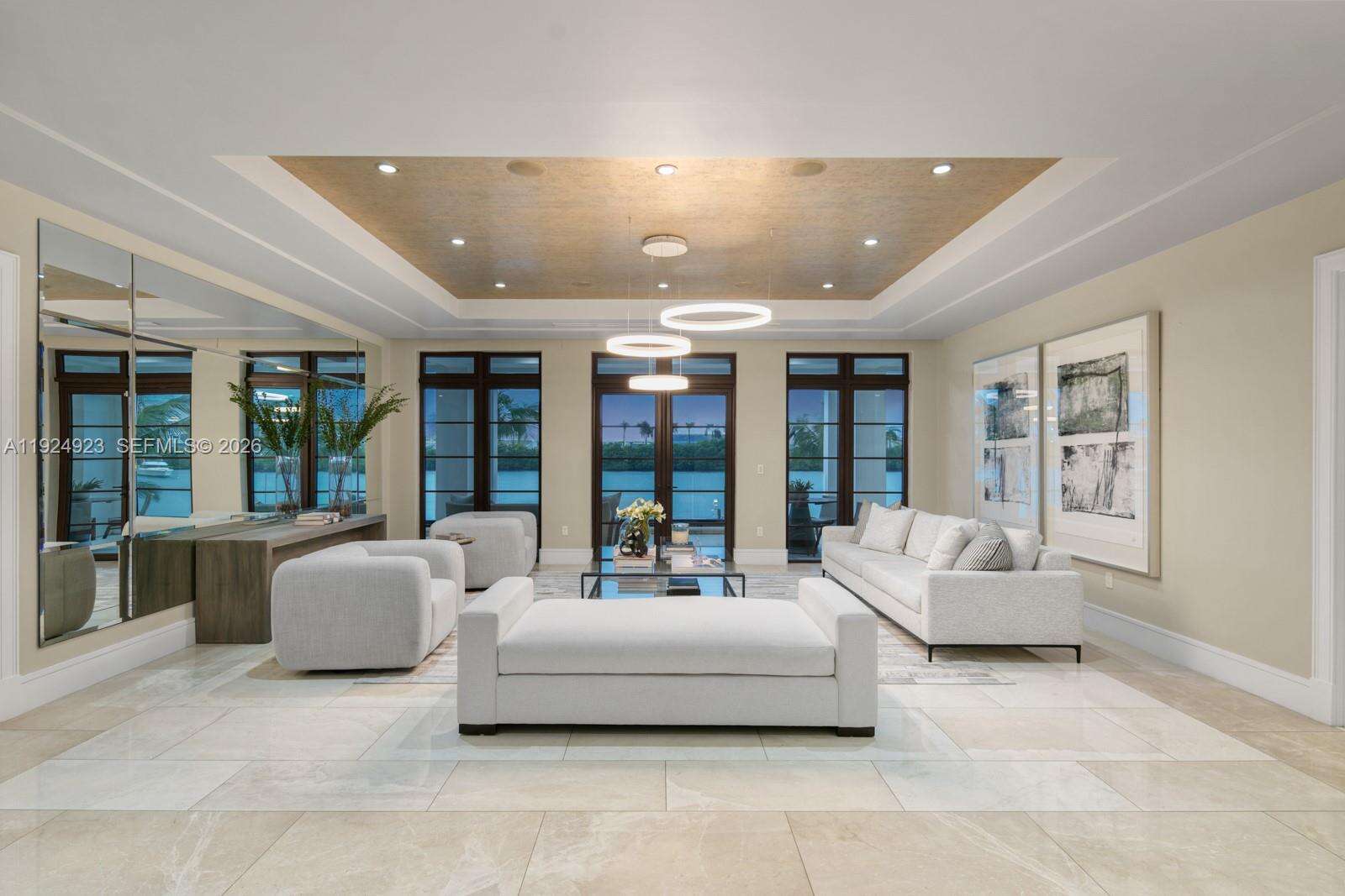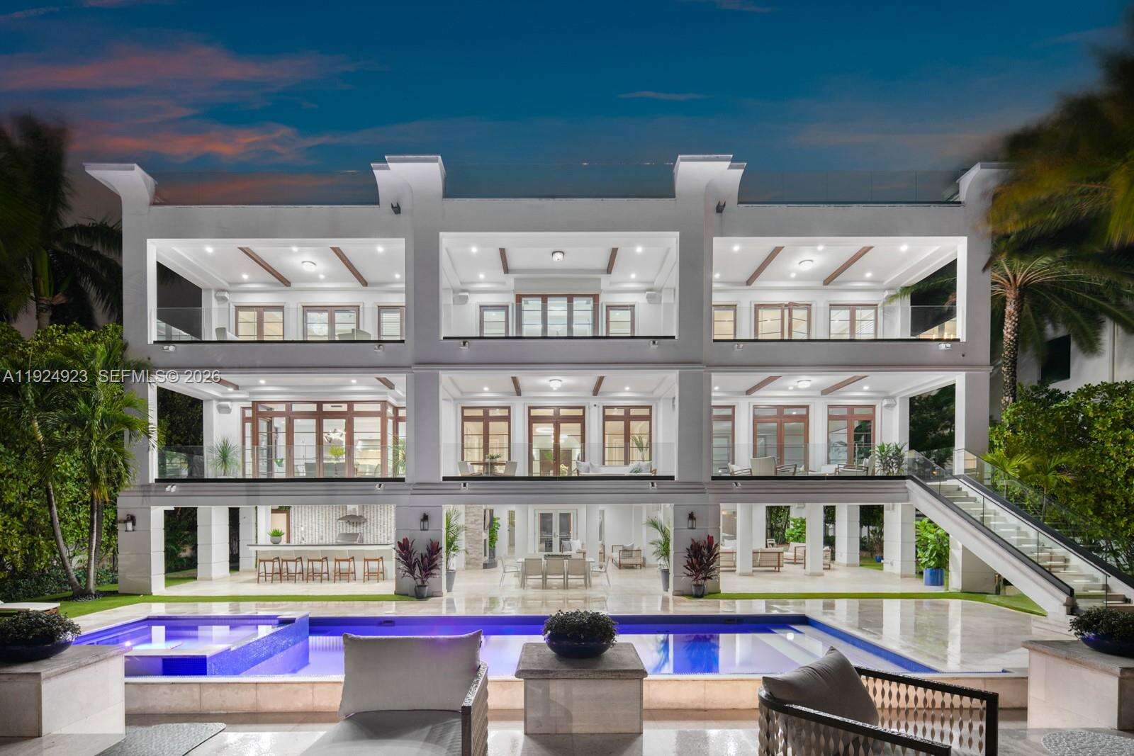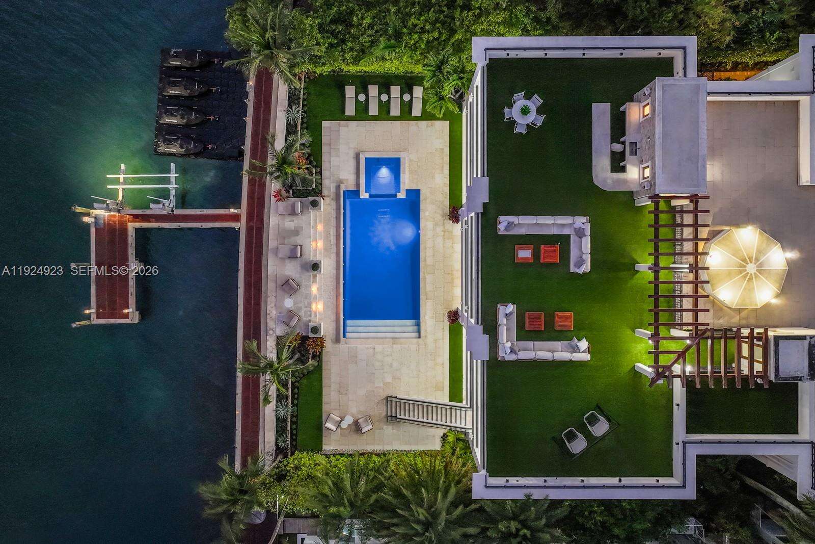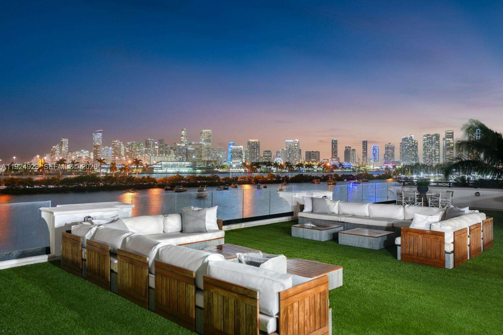 Experience luxury living in this exquisite 3-story waterfront estate, offering 100’ of prime water frontage on the prestigious, guard-gated Palm Island. Boasting 8 bedrooms, 9.5 baths, and a 4-car garage, this home offers ultimate comfort and style. Enjoy breathtaking views of the Miami skyline and beautiful sunsets from the expansive 5,000 SF rooftop terrace and multiple inviting living spaces. The ground level includes a spacious media room and game area while the outdoor space features a stunning pool, summer kitchen and a private dock that accommodates yachts up to 90' as well as a boat lift and floating jet ski dock. The home is complete with a private elevator and staff quarters. This is the epitome of elegance, exclusivity, and Miami’s vibrant waterfront lifestyle