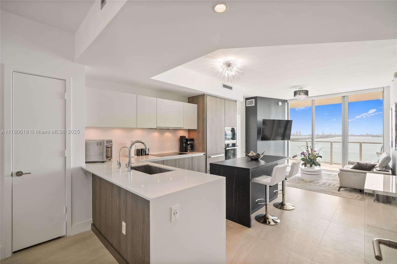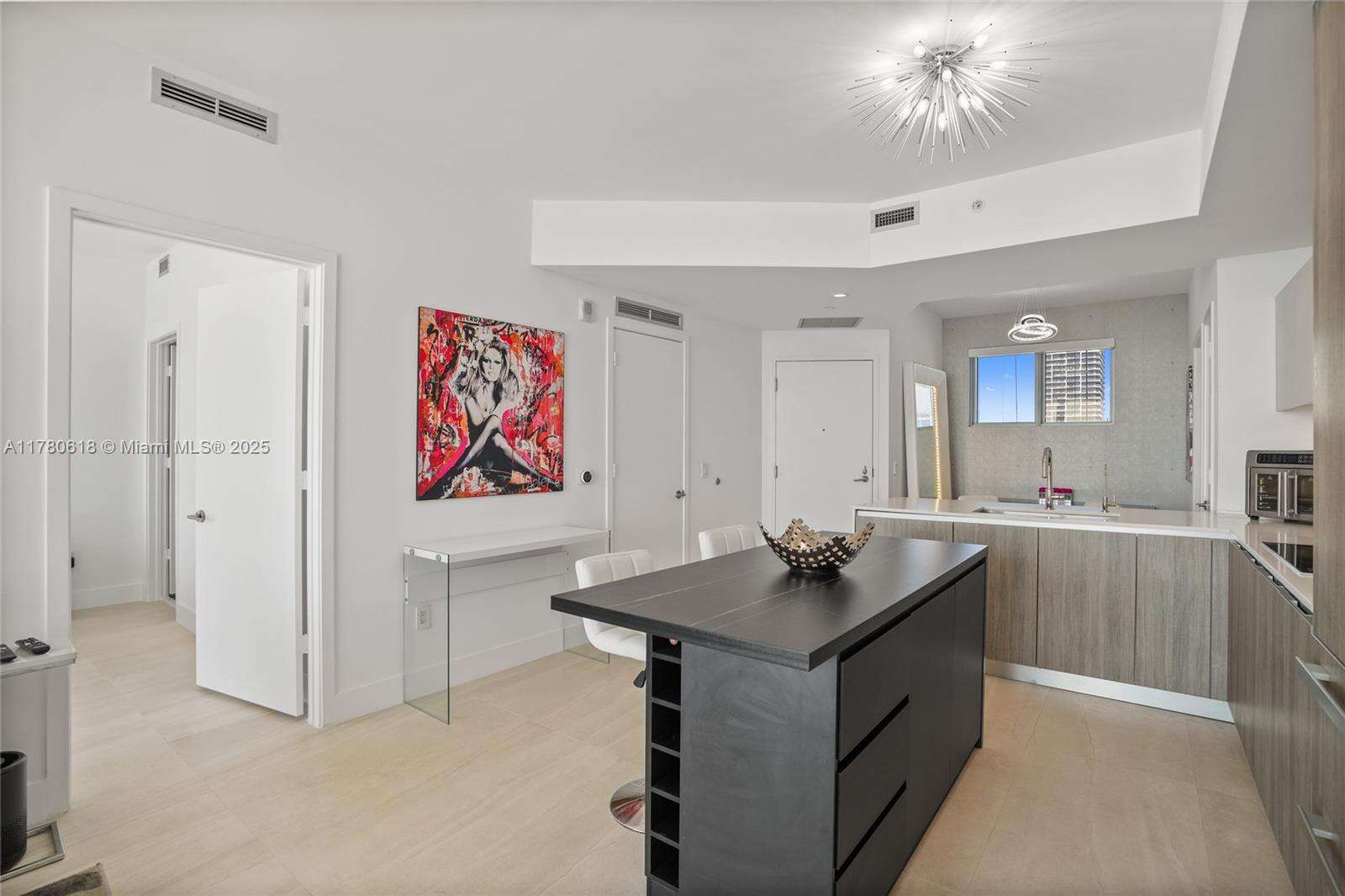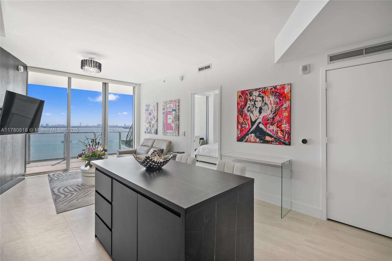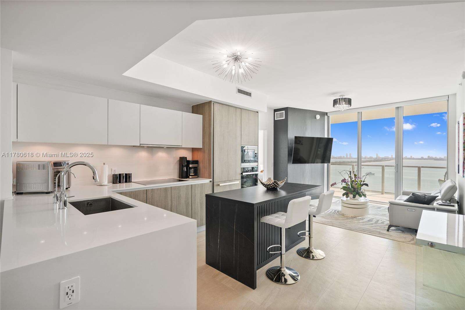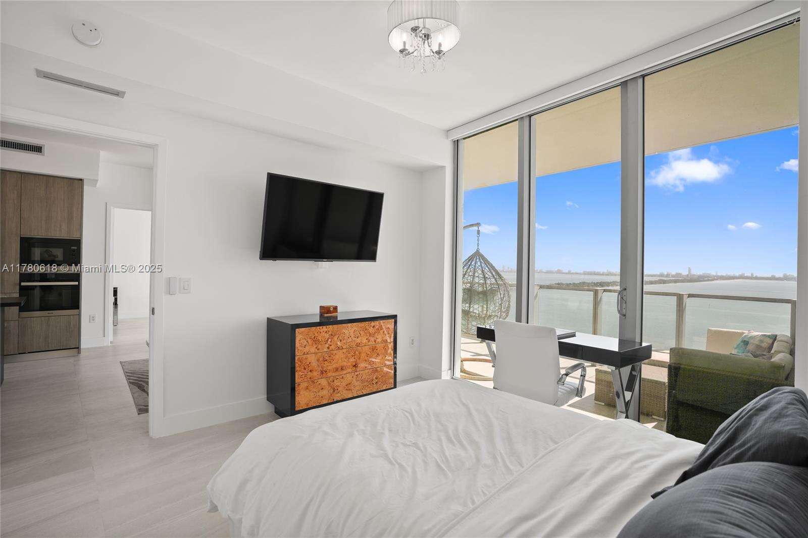 This stunning 2-bedroom, 3-bathroom condo with a den features luxury upgrades like a UV light system, 3M water filter, and Roberto Cavalli wallpaper. The master suite offers a custom closet, full-wall mirror, updated shower with new handles, and sleek floating vanities. Italian porcelain floors, a black kitchen island, and electric blackout shades add to the elegance. Designed by Thom Filicia, the condo includes private elevator access, top-tier appliances, and bay views. Amenities feature two pools, beach club, gym, spa, tennis courts, dog park, and 24-hour concierge. Spot #664 parking included. Located 10 minutes from the Design District, Midtown, and the American Airlines Arena, enjoy exclusive Miami events like sunset cruises and beachfront yoga.