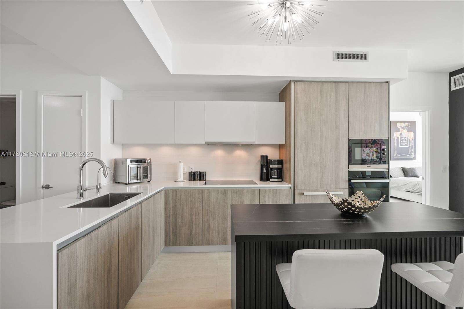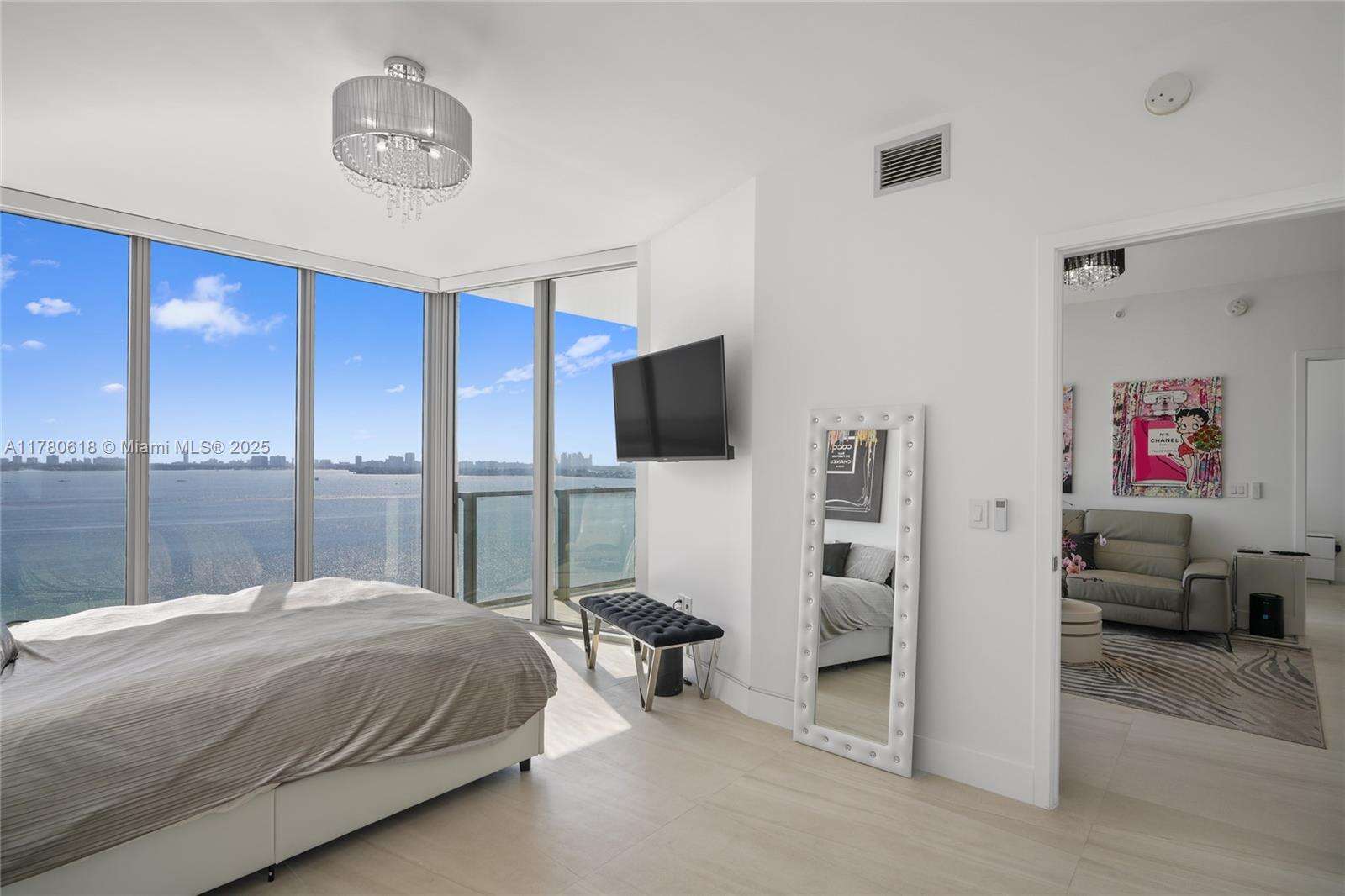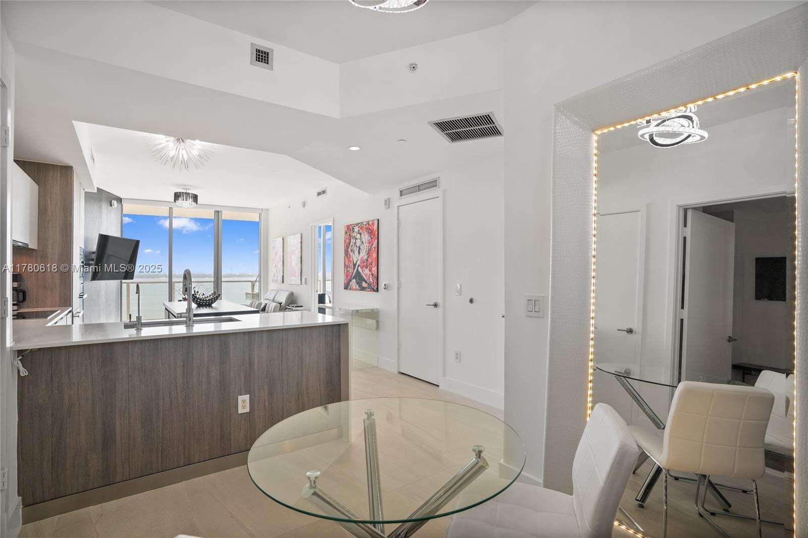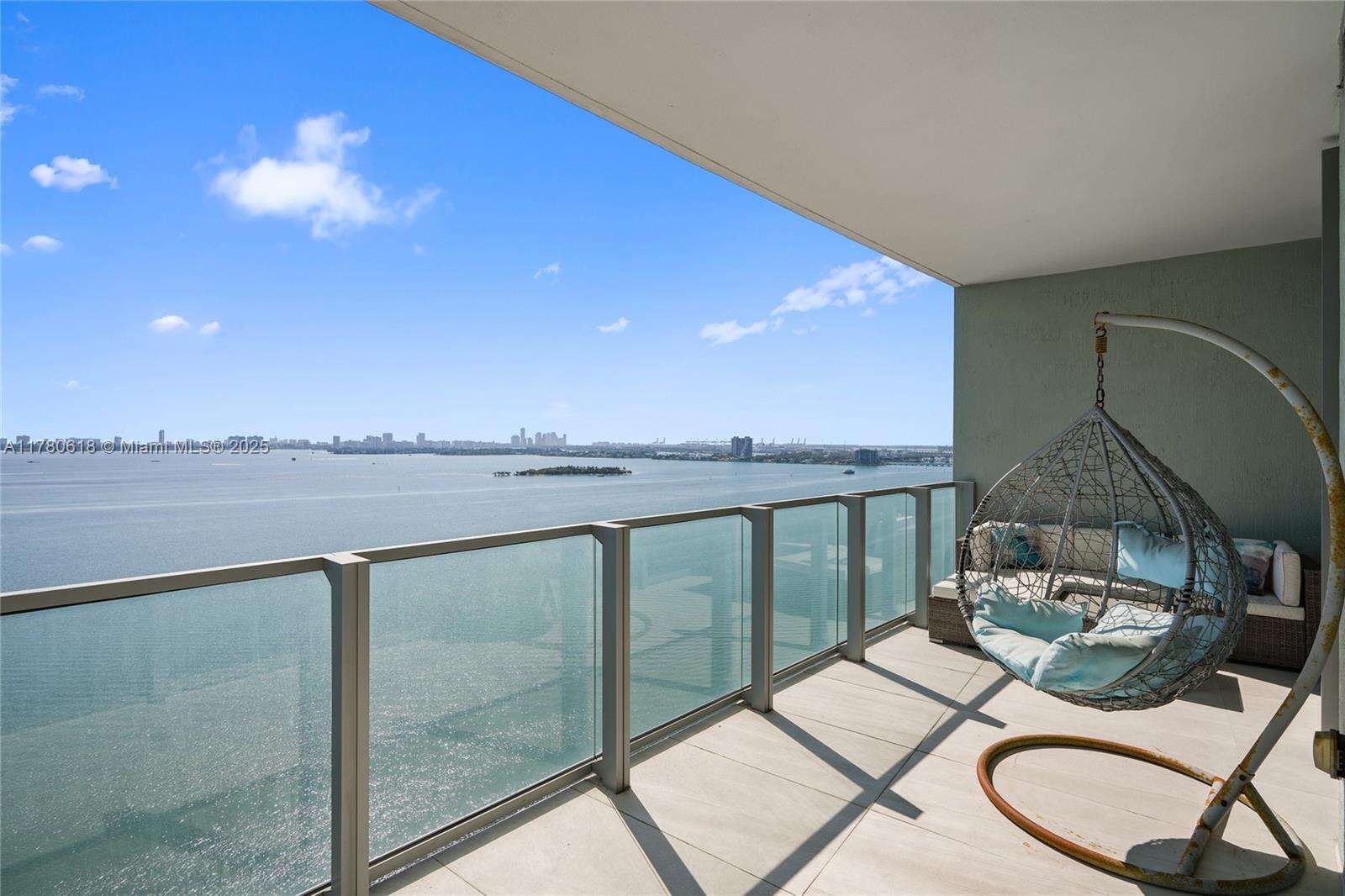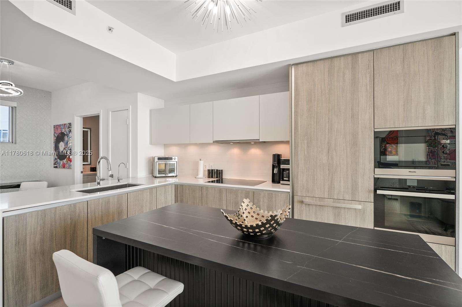 This stunning 2-bedroom, 3-bathroom condo with a den features luxury upgrades like a UV light system, 3M water filter, and Roberto Cavalli wallpaper. The master suite offers a custom closet, full-wall mirror, updated shower with new handles, and sleek floating vanities. Italian porcelain floors, a black kitchen island, and electric blackout shades add to the elegance. Designed by Thom Filicia, the condo includes private elevator access, top-tier appliances, and bay views. Amenities feature two pools, beach club, gym, spa, tennis courts, dog park, and 24-hour concierge. Spot #664 parking included. Located 10 minutes from the Design District, Midtown, and the American Airlines Arena, enjoy exclusive Miami events like sunset cruises and beachfront yoga.