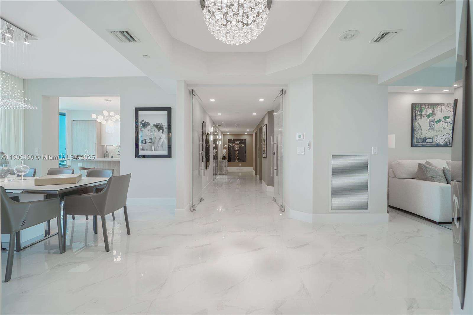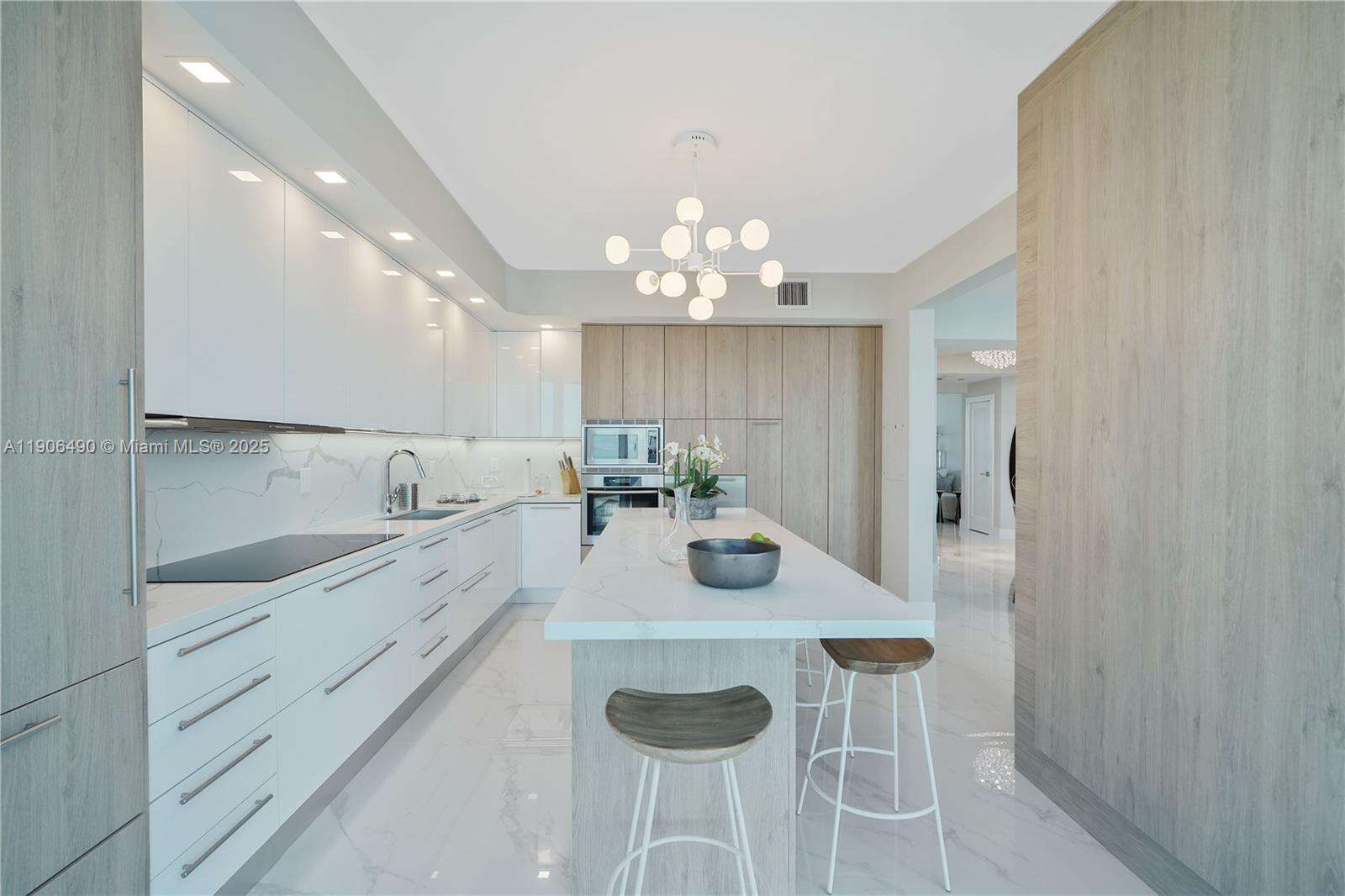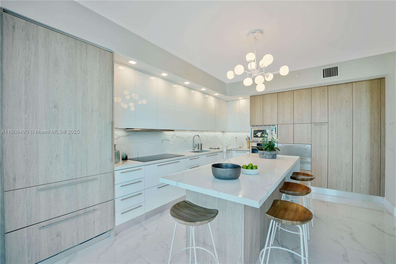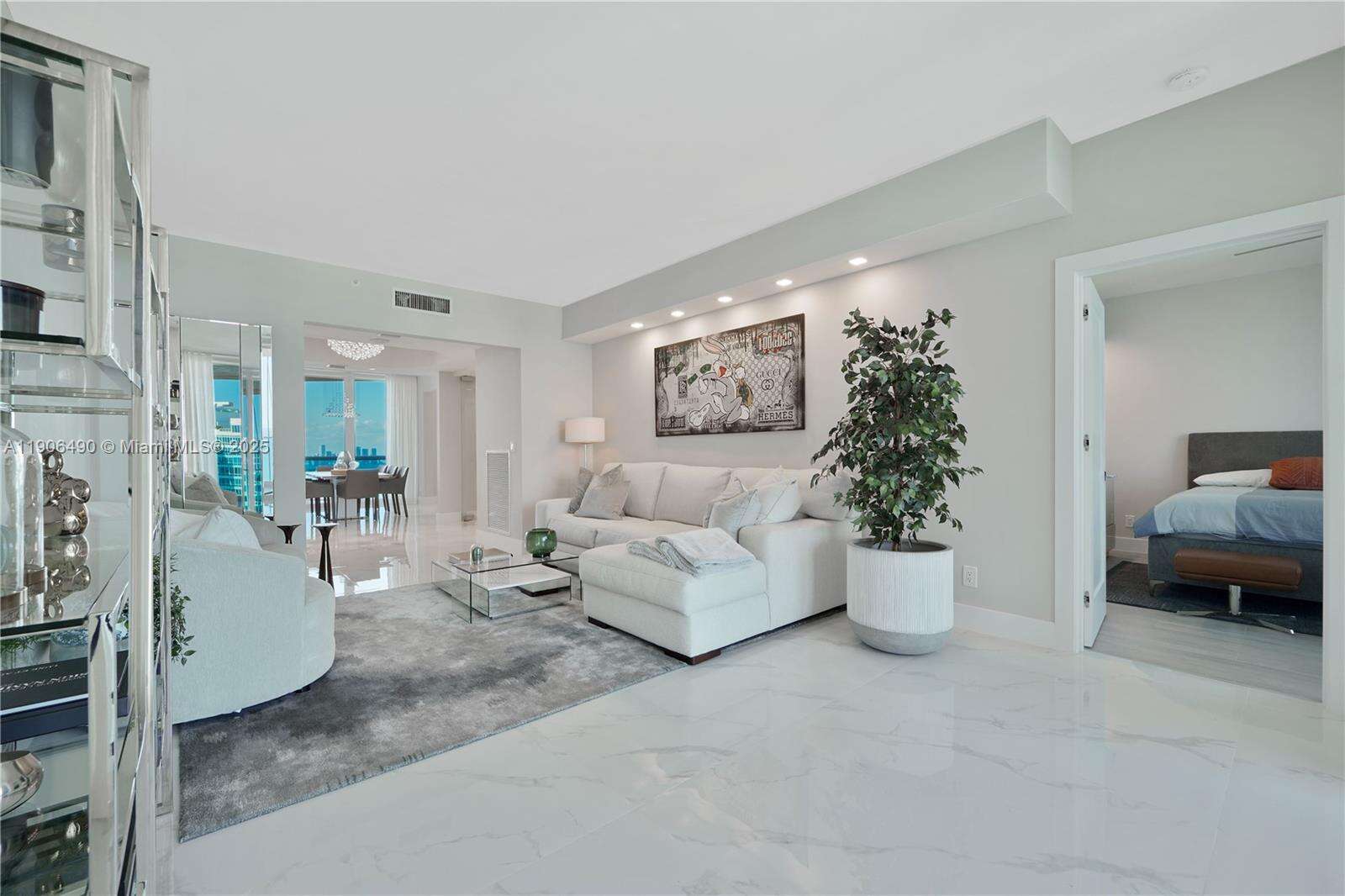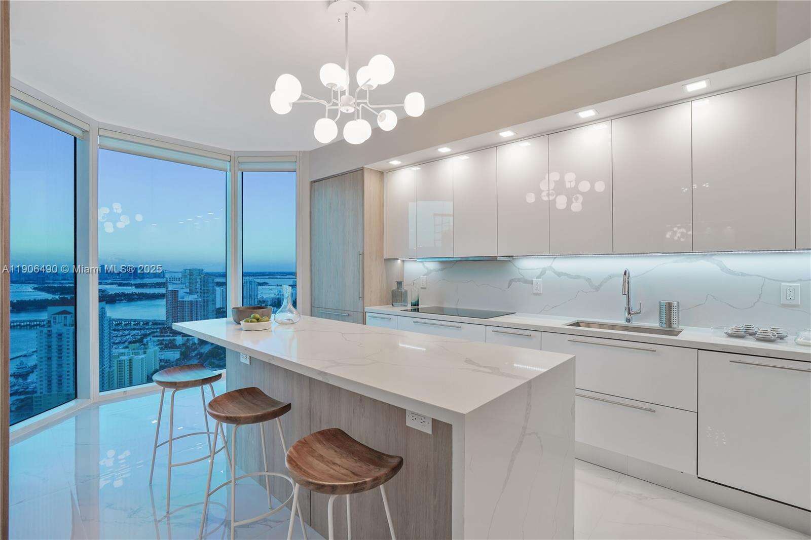 Incredible opportunity to own a completely renovated 3 bed/3 full bath residence on the 43rd floor with a private gallery entrance at the prestigious Portofino Tower in the world renowned South of Fifth neighborhood. Offering the pinnacle level of privacy, this residence is the only home on the 43rd floor of Portofino Tower 3. Spectacular flow-through 2,040 SqFt + private elevator foyer with private & spacious sunrise & sunset balconies, boasting breathtaking unobstructed panoramic views day & night of the Atlantic Ocean, Biscayne Bay, Miami skyline, South Beach & cruise ship channel. Unique opportunity to live in this mint condition home in the sky offering newly updated floors throughout, kitchen, bathrooms & lighting. A truly incredible & rare offering. See video in virtual tour link.