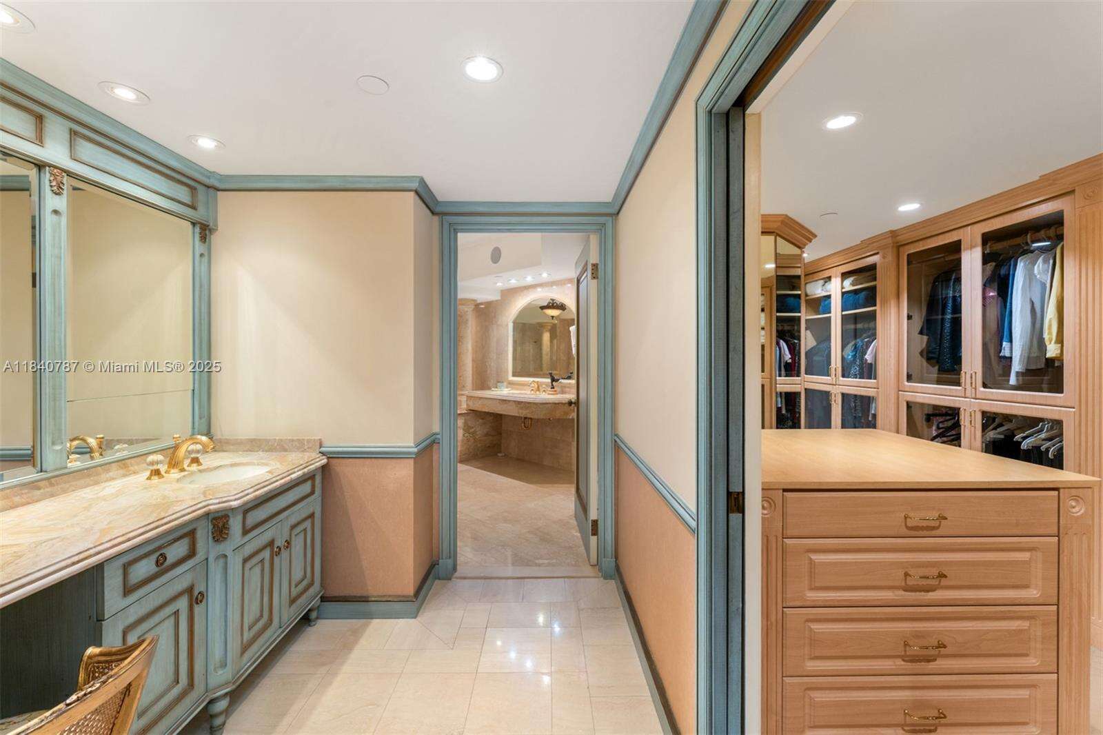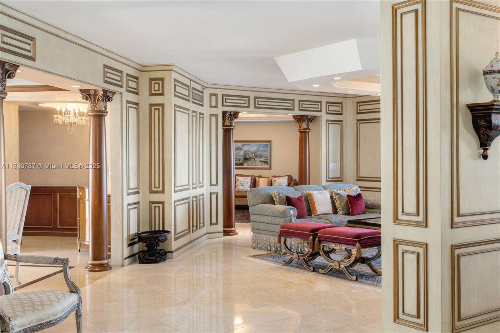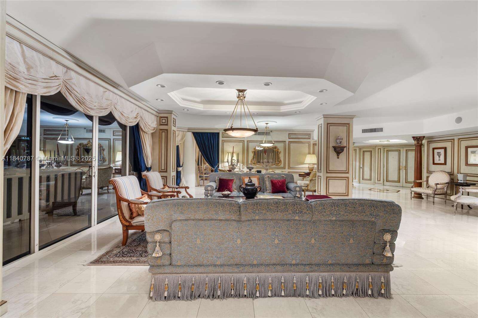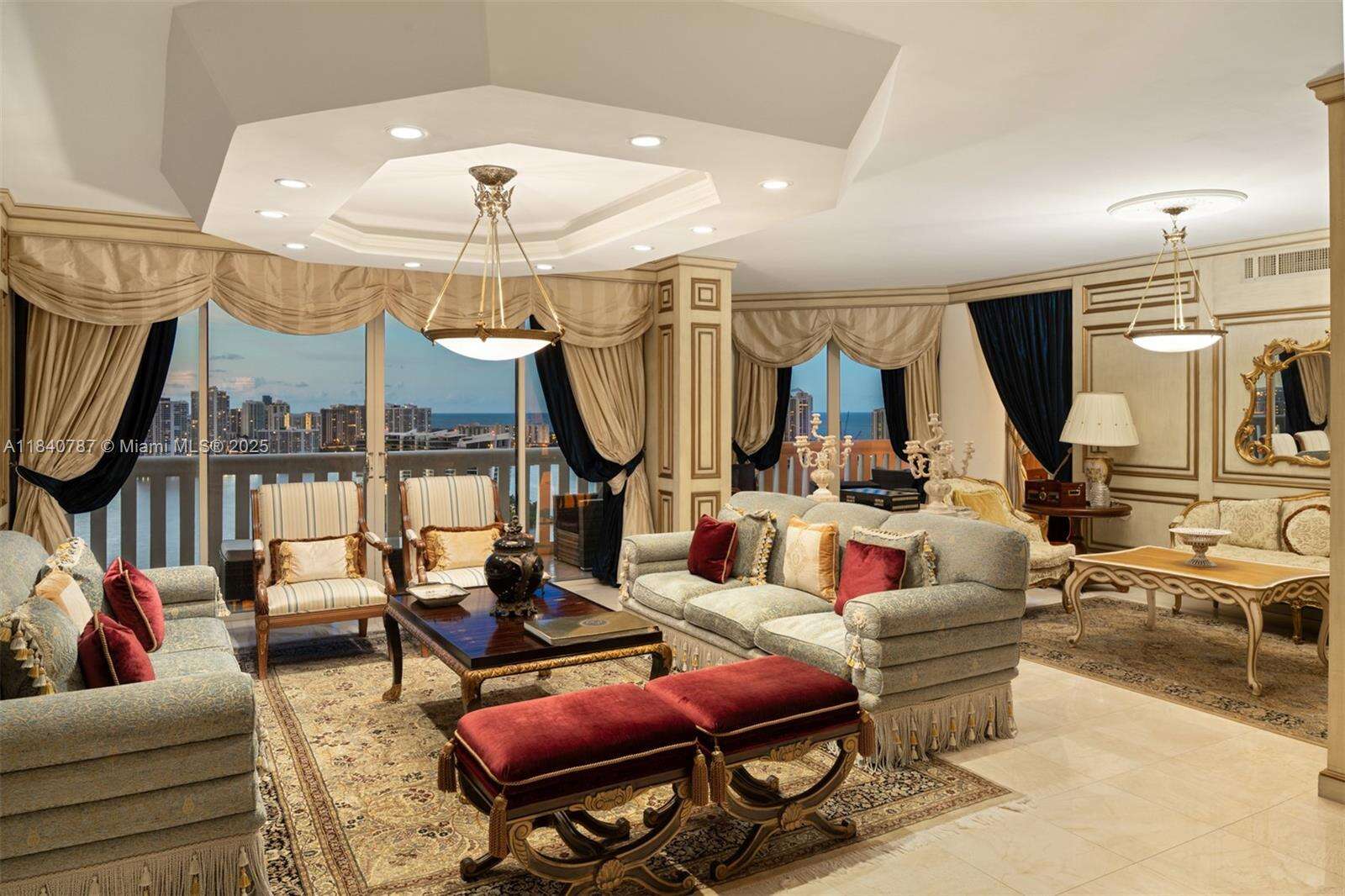 Residence 2902 at Williams Island. A fragment of Buckingham Palace rising above Miami — order, proportion, and tranquility. Everything here is handcrafted; nothing is generic or improvised. The entrance opens into a classical sequence of spaces: reception hall, formal dining room, music or reading lounge, private study, and an intimate kitchen designed for conversation. The wine cellar preserves memory and ritual. The primary suite, regal in scale, ensures silence and privacy; the remaining areas flow with balanced continuity, creating an atmosphere ideal for both living and entertaining. By day, the residence is bright and precise; by night, it becomes ceremonial and serene. A panoramic view of roughly 180° accompanies rather than competes — the focus remains on craftsmanship and the harmony of a grand home elevated in the sky. 2902 makes no display: it quietly asserts class in every detail and is ready to live in, flawlessly complete. Fully furnish price of $4,450,000