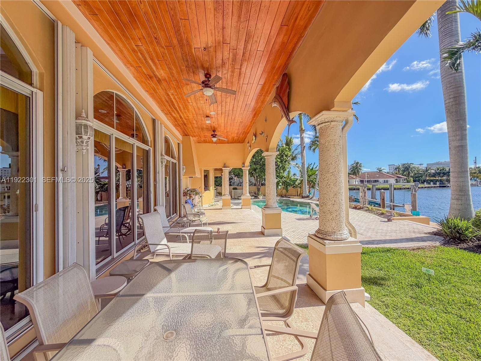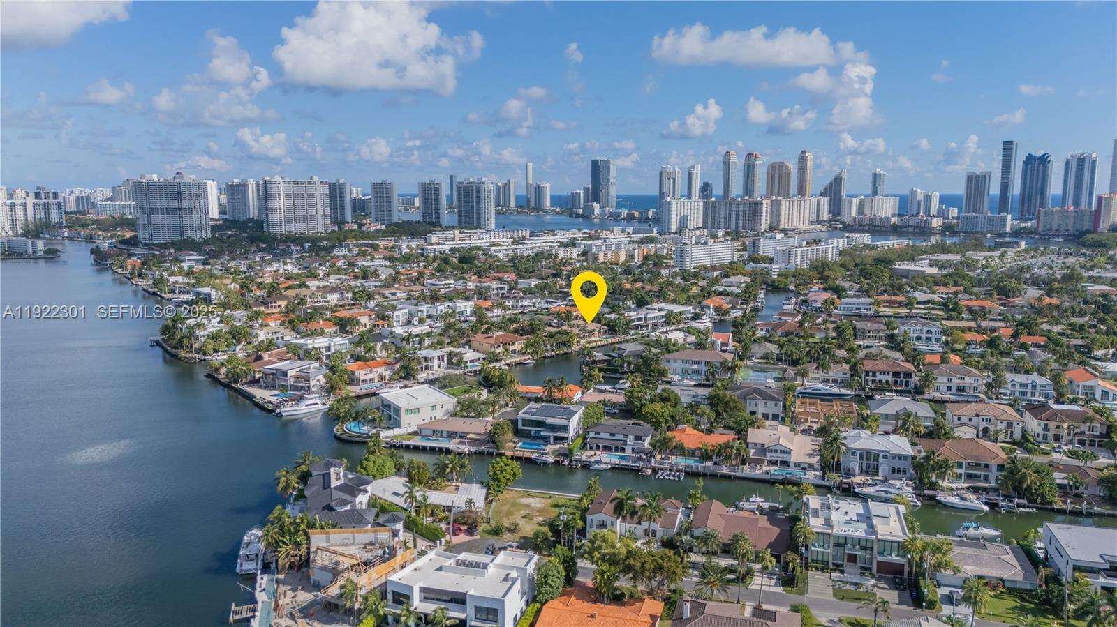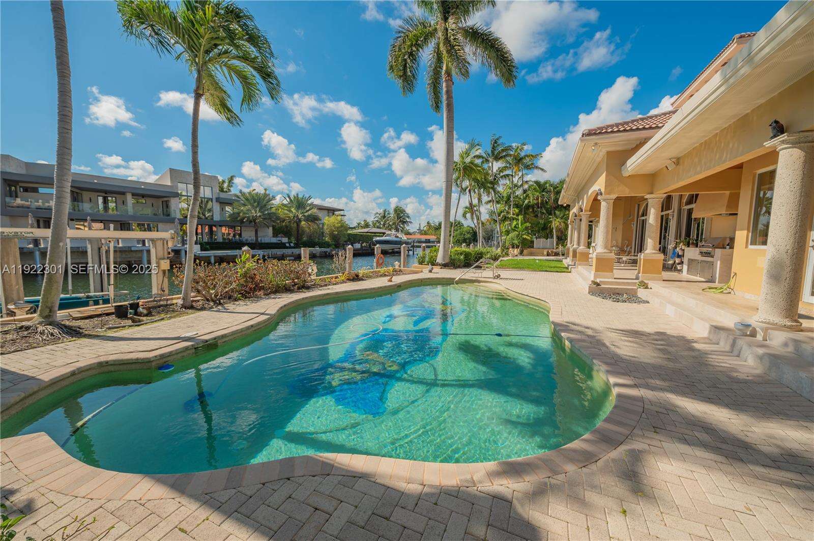 Live the coastal lifestyle in this expansive one-story home set on two beautiful waterfront lots, offering 160 ft of water frontage and a 140 ft dock. Relax by the pool, take in the South-facing views. No fixed bridges to Haulover Inlet. Thoughtfully designed with custom finishes, the home features high ceilings, 3+ bedrooms with potential to add more bedrooms, a spacious master retreat with two walk-in closets, an eat-in kitchen, wet bar, and formal dining. Sun-filled rooms open directly to the patio, pool, and water. Located in a prestigious 24-hour guard-gated community, you're just minutes to the beach, shopping, movies, dining, and Oleta State Park.