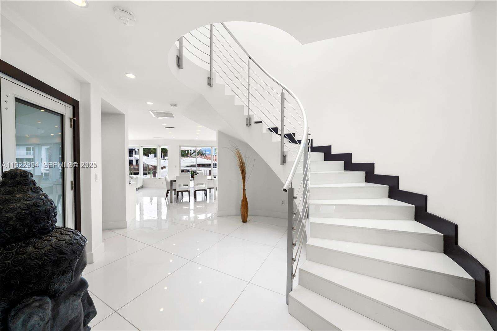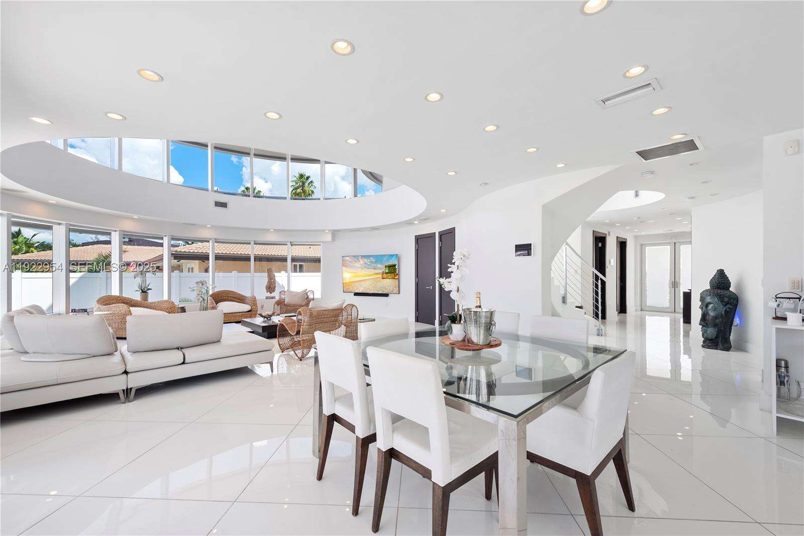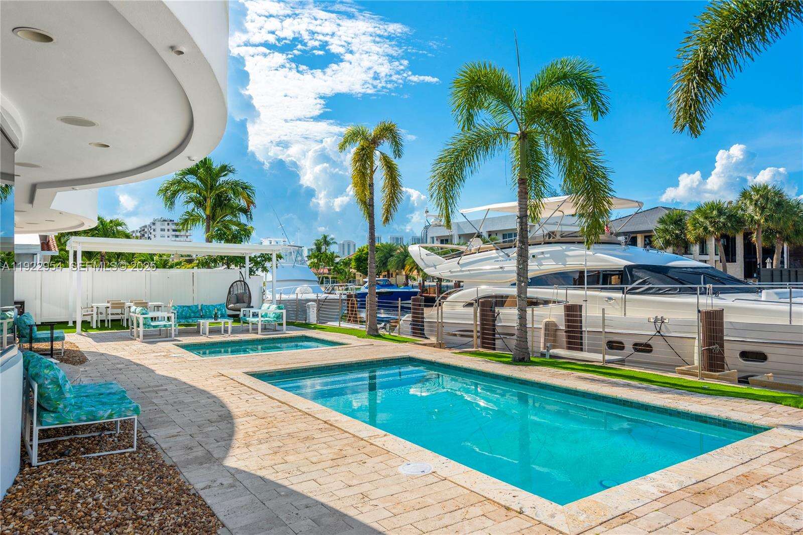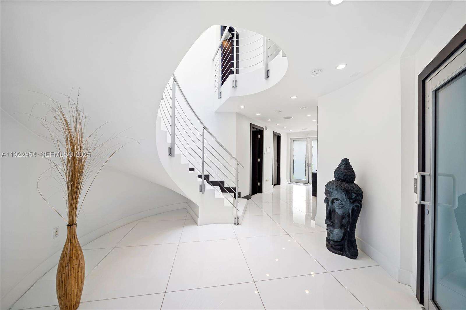 Best-Priced Modern Waterfront Residence in All of Miami Beach. A striking all-white concrete masterpiece with bold Iron Man / Tony Stark–inspired architecture, offering 80 feet of premier water frontage just a short walk to the beach. Located in the exclusive, guard-gated Eastern Shores community of Sunny Isles. This ultra-modern waterfront estate features a rare full concrete perimeter wall, private electric gate, dramatic 20-ft ceilings, and a stunning vaulted skylight that floods the home with natural light. Elegant design details include curved architectural staircases, wraparound terraces, and 36x36 white porcelain flooring throughout.The residence offers 6 bedrooms and 6.5 ensuite baths, including a luxurious primary suite with its own private terrace, jet spa tub, and dual walk-in closets. A fully integrated $180k Crestron Smart Home system, controlled by 3 iPads and smartphone-enabled, seamlessly manages intelligent color-changing lighting, 28 built-in speakers, climate, security, and more. Outdoor living is elevated with a waterfront pool and hot tub, outdoor brick oven, covered entertainment patio with ceiling fan, and a 2-car supercar garage. Perfectly situated minutes from the beach, shopping, dining, Aventura, Bal Harbour, Miami International Airport, and South Beach. A modern fortress of design and technology—unmatched at this price point