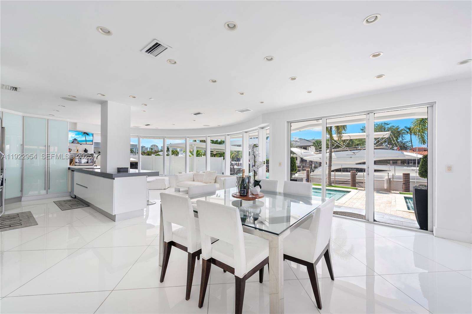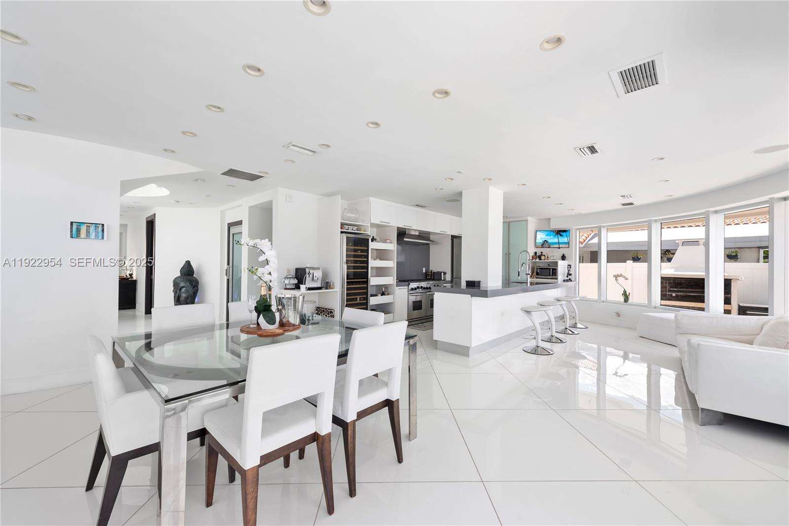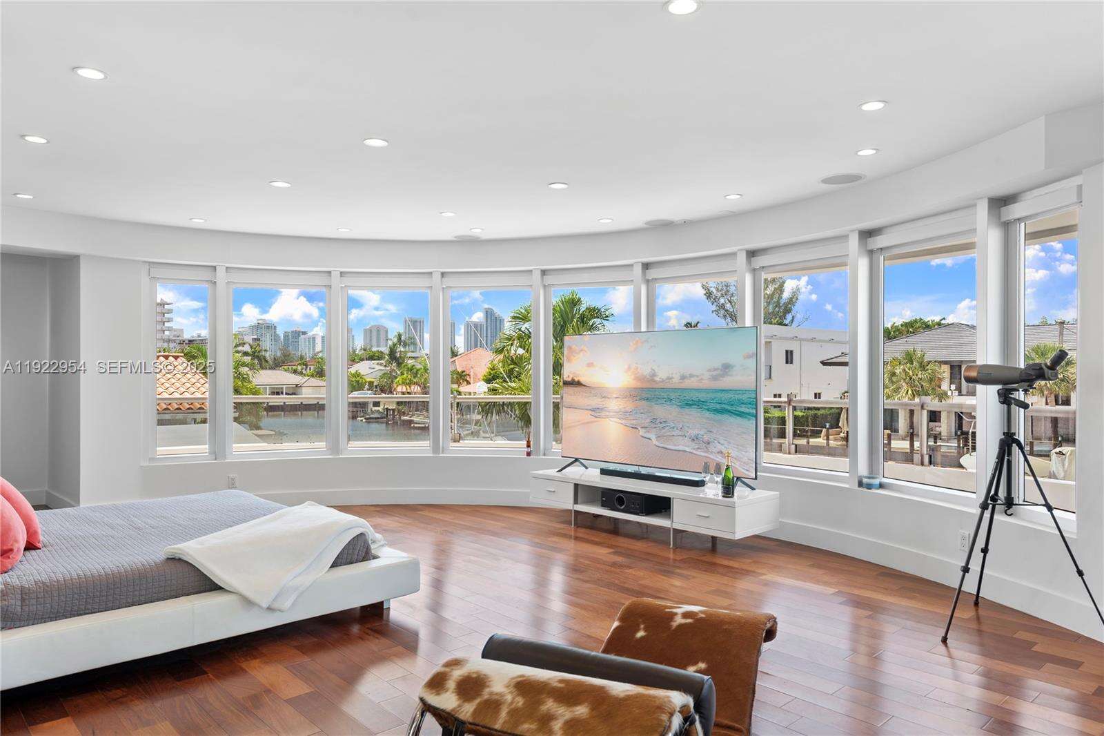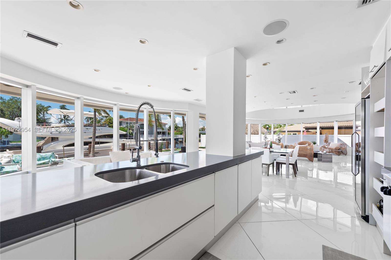 Best-Priced Modern Waterfront Residence in All of Miami Beach. A striking all-white concrete masterpiece with bold Iron Man / Tony Stark–inspired architecture, offering 80 feet of premier water frontage just a short walk to the beach. Located in the exclusive, guard-gated Eastern Shores community of Sunny Isles. This ultra-modern waterfront estate features a rare full concrete perimeter wall, private electric gate, dramatic 20-ft ceilings, and a stunning vaulted skylight that floods the home with natural light. Elegant design details include curved architectural staircases, wraparound terraces, and 36x36 white porcelain flooring throughout.The residence offers 6 bedrooms and 6.5 ensuite baths, including a luxurious primary suite with its own private terrace, jet spa tub, and dual walk-in closets. A fully integrated $180k Crestron Smart Home system, controlled by 3 iPads and smartphone-enabled, seamlessly manages intelligent color-changing lighting, 28 built-in speakers, climate, security, and more. Outdoor living is elevated with a waterfront pool and hot tub, outdoor brick oven, covered entertainment patio with ceiling fan, and a 2-car supercar garage. Perfectly situated minutes from the beach, shopping, dining, Aventura, Bal Harbour, Miami International Airport, and South Beach. A modern fortress of design and technology—unmatched at this price point