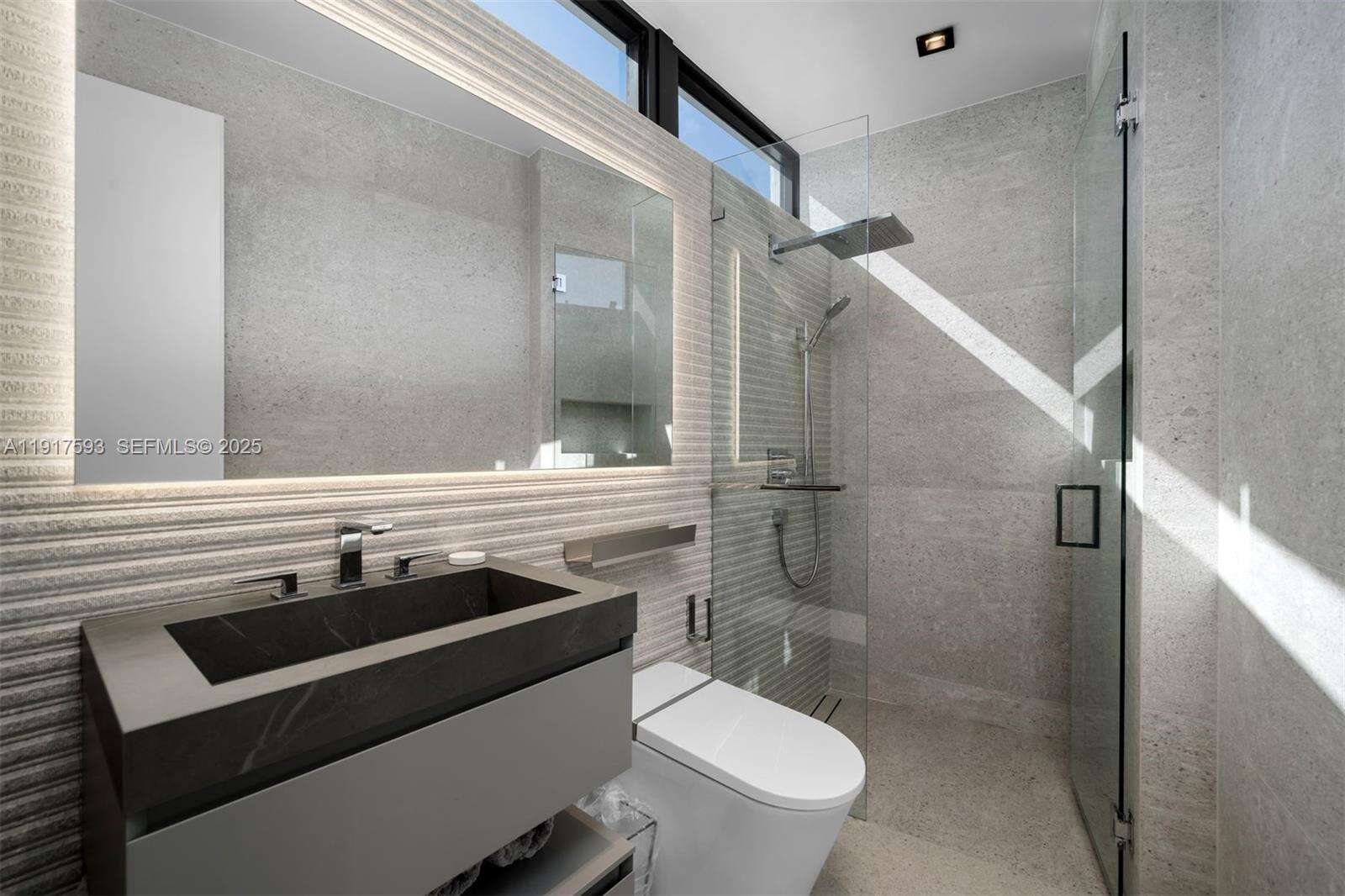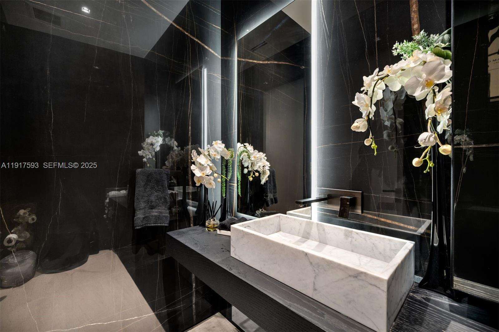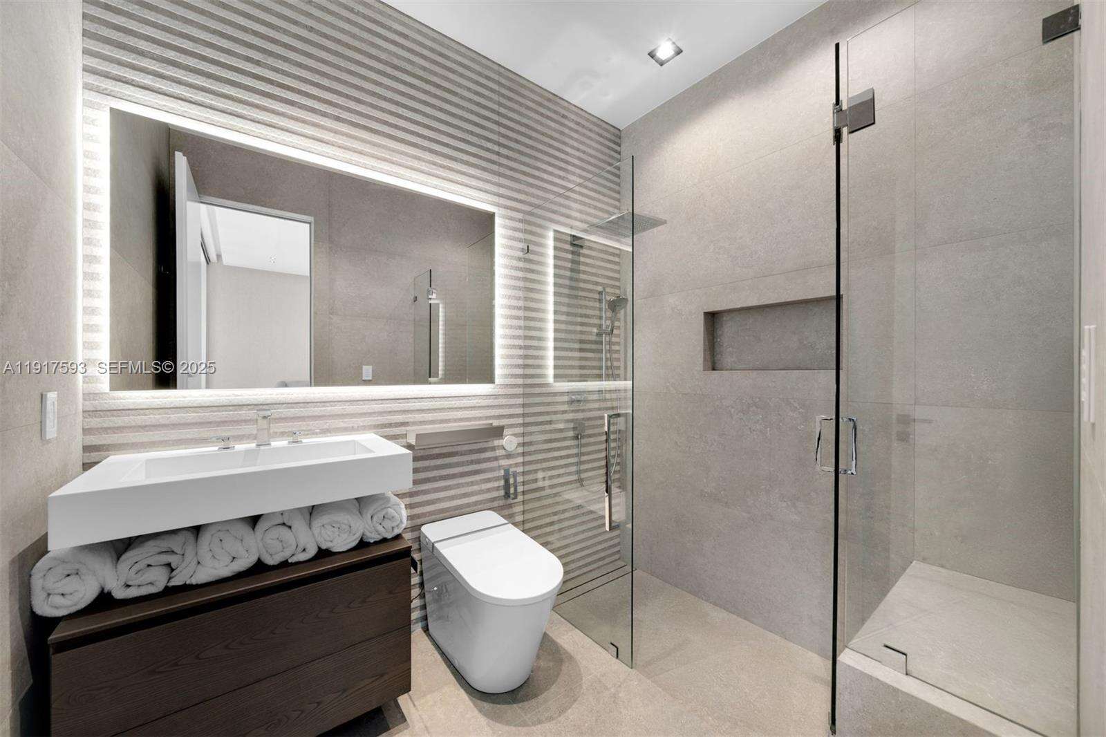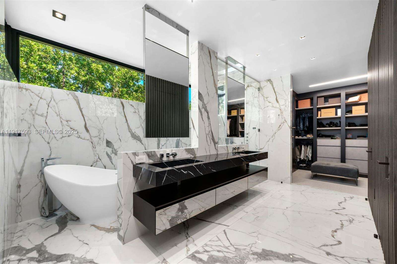 Completed in 2024, this newly built modern masterpiece in coveted Golden Beach offers exceptional craftsmanship, striking design, & a tranquil outdoor oasis created for waterfront living. Sitting on a 10,476 SF lot, this 6,773 total SF residence welcomes you with an oversized driveway & grand architectural entry framed by floating steps. Inside, features a Mia Cucina kitchen w/ Taj Mahal stone, limestone floors on the main level, warm wood upstairs, frameless doors, high end light fixtures, Cristallo stone bar, and Control 4 smart home system w/ Lutron lighting. The spacious primary suite showcases dual walk-in closets and large terrace capturing stunning sunsets. Elevator, pajama lounge & wine room complete the sophisticated interior. 45 feet of water frontage, private dock, Sub-Zero & Wolf summer kitchen, & outdoor shower create a true resort setting.