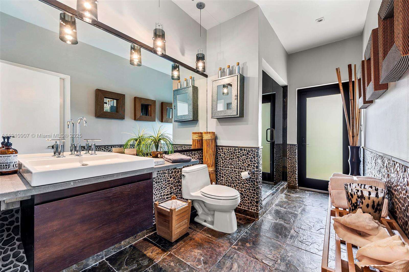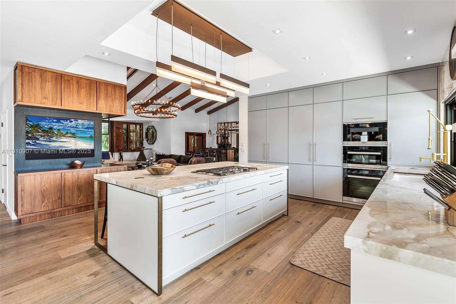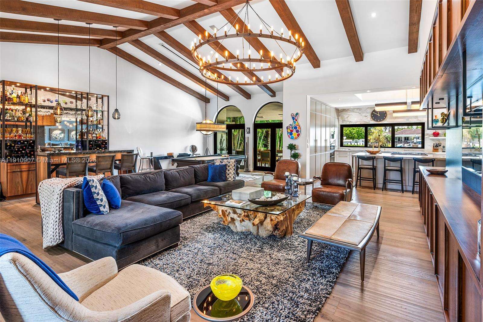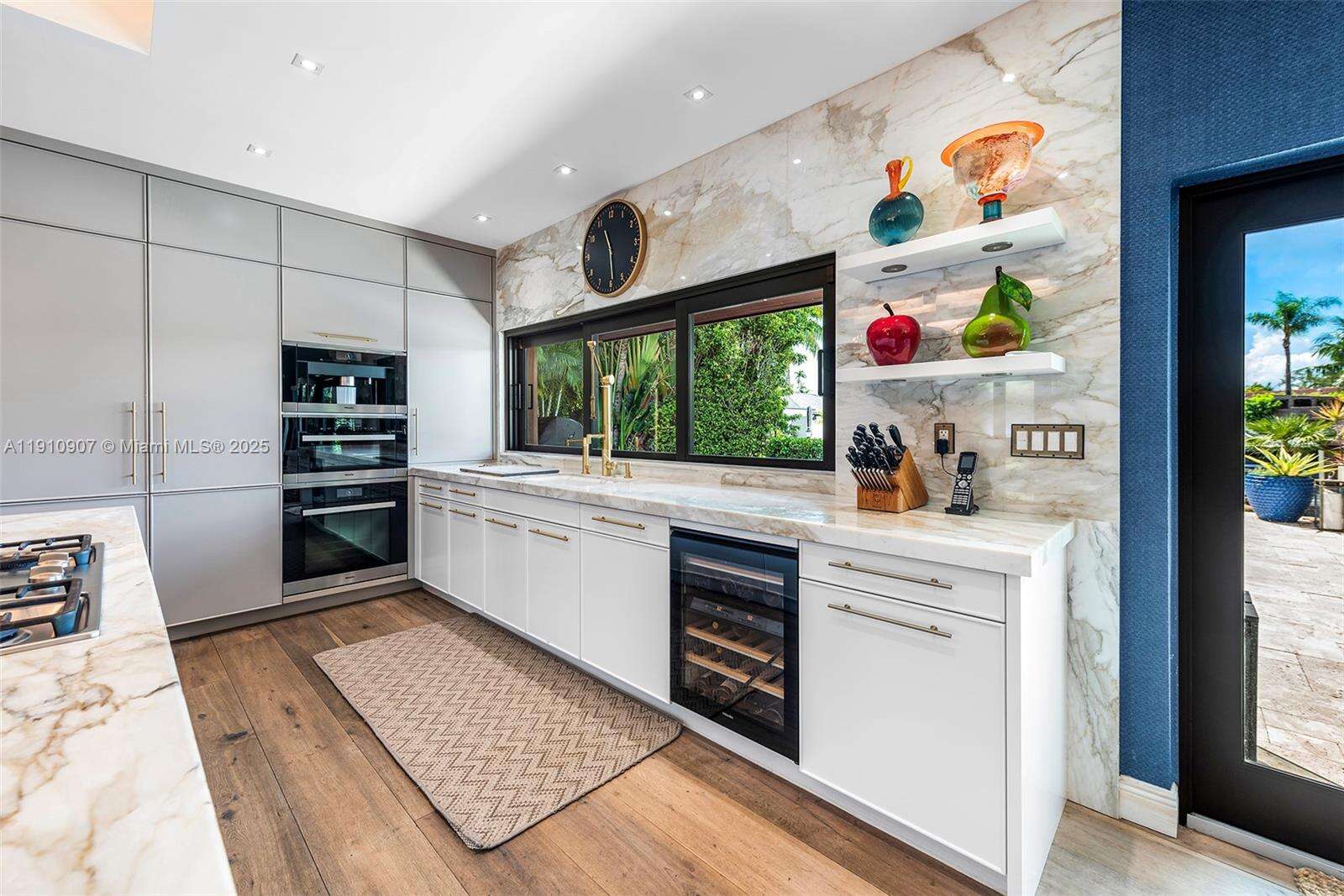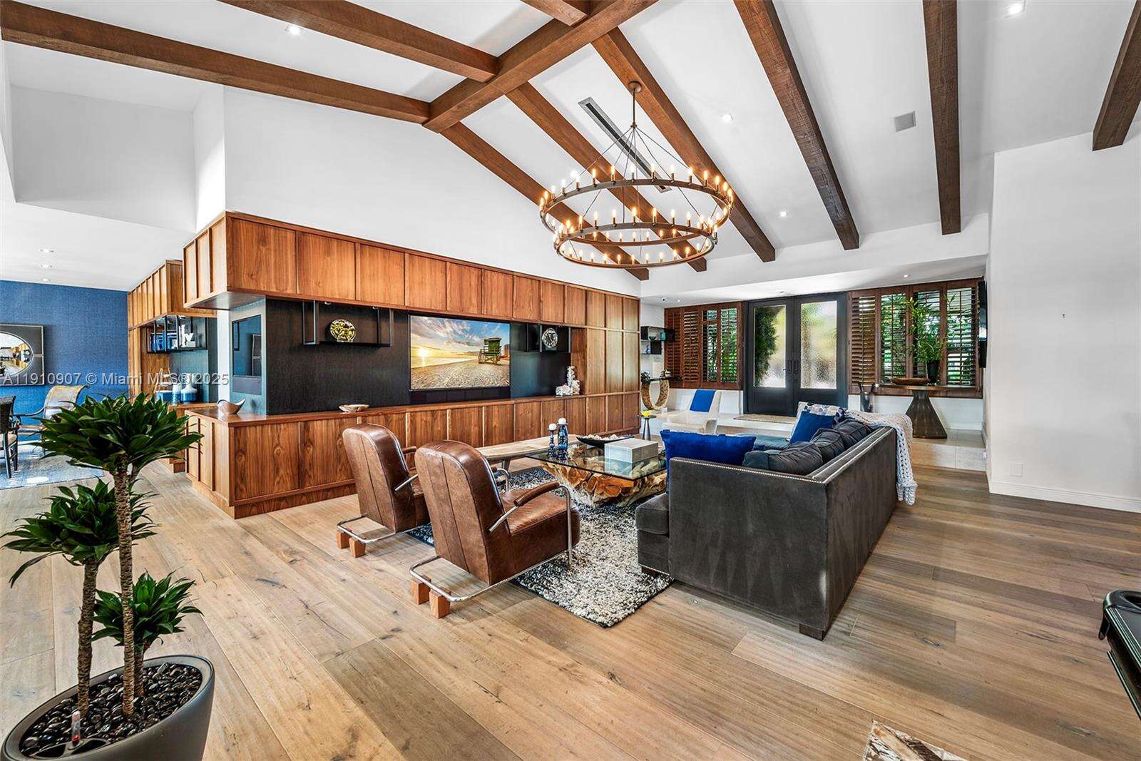 This stunning one-story custom-built home is a dream come true for yacht owners, offering 50ft of waterfront property. The home boasts high ceilings. Perfect for boat enthusiasts. Professionally decorated with the finest quality finishes throughout, including custom-built wall units, impact windows and doors, wood plank floors, and a newer flat tile roof. The home features a built-in bar, a huge great room, and a newer remodeled spacious eat-in kitchen with marble countertops and backsplash, a Miele gas stove, Miele oven, microwave, espresso, and wine cooler, built-in Subzero refrigerator and freezer, tall cabinets, and pull-out pantries. A must see opportunity.