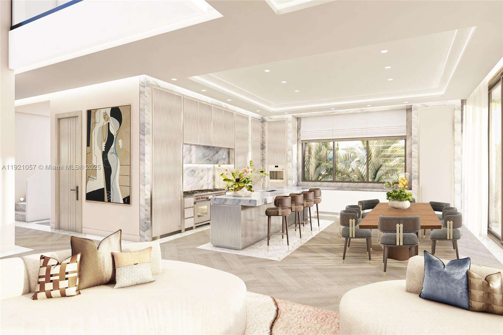 Enter this stunning waterfront masterpiece where luxury meets sophistication on guard gated Hibiscus Island. This brand new architectural marvel designed by Kobi Karp offers over 8,000 square feet of meticulously crafted living space curated by Argent Design blending art and architecture. Inspired by iconic sculptures, this estate pushes the boundaries of design, creating a home that's not just a place to live, but a living work of art. With soaring 11'6" ceilings and exquisite finishes throughout, this home will impress the most discerning buyer. Seven bedrooms and eight total bathrooms provide generous accommodations, while timber floors and a stone facade create an atmosphere of refined elegance. The spectacular southwest exposure frames downtown Miami's glittering skyline and delivers breathtaking sunset views daily. Your 90 feet of pristine water frontage becomes your personal paradise, enhanced by lush tropical landscaping by CLAD Landscape Architecture. Premium amenities include an elevator, full home generator, two-car garage & rooftop entertainment level. This 24 HR guard-gated community offers tennis courts, basketball, and children's playground, plus you're just minutes from the best shopping & dining in South Beach & Miami Design District.