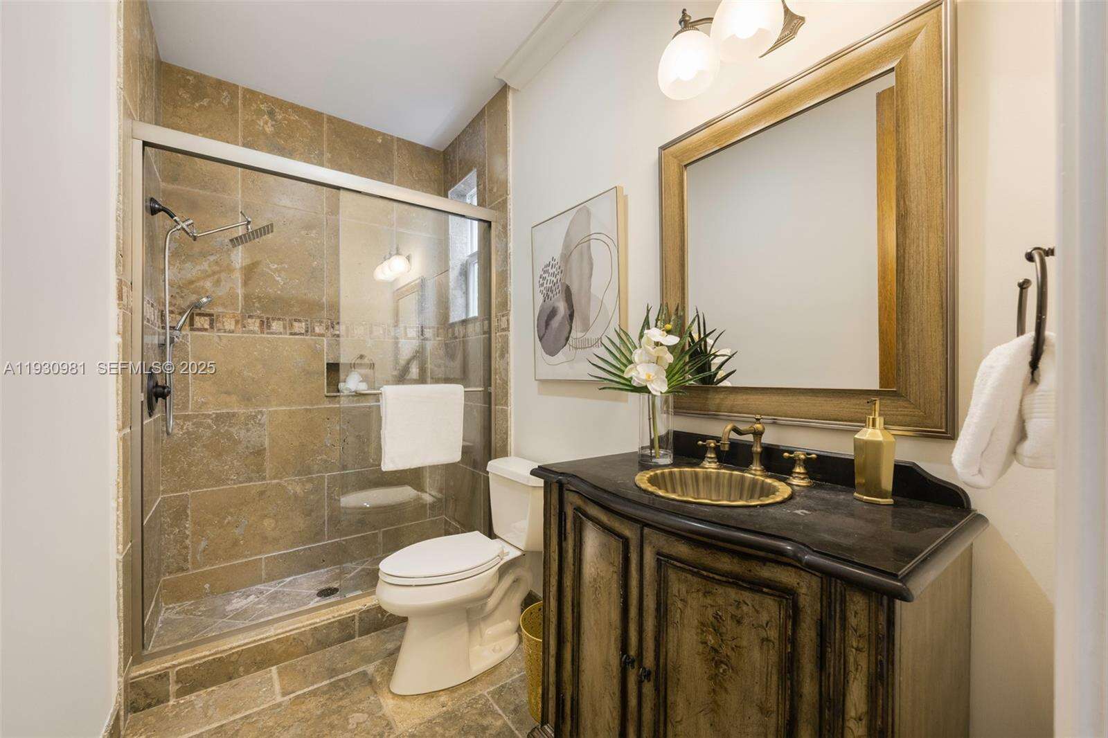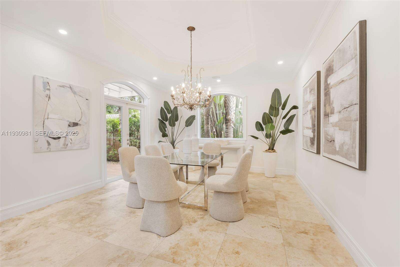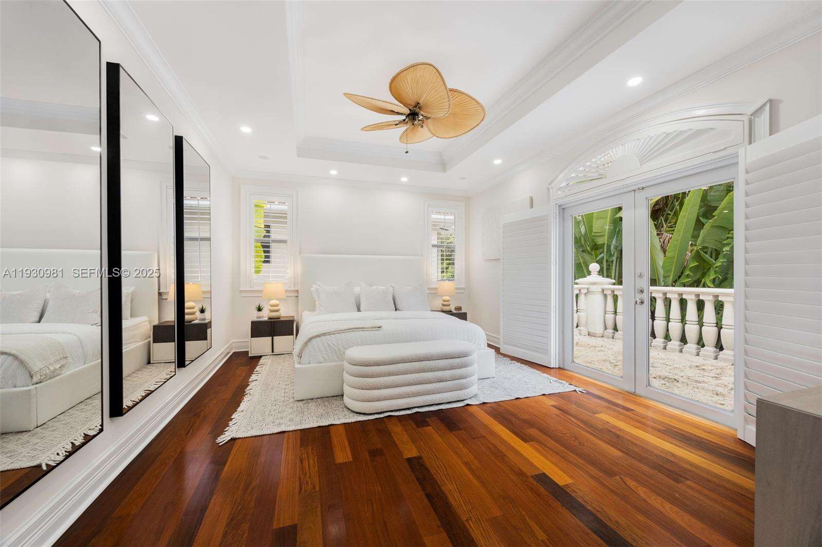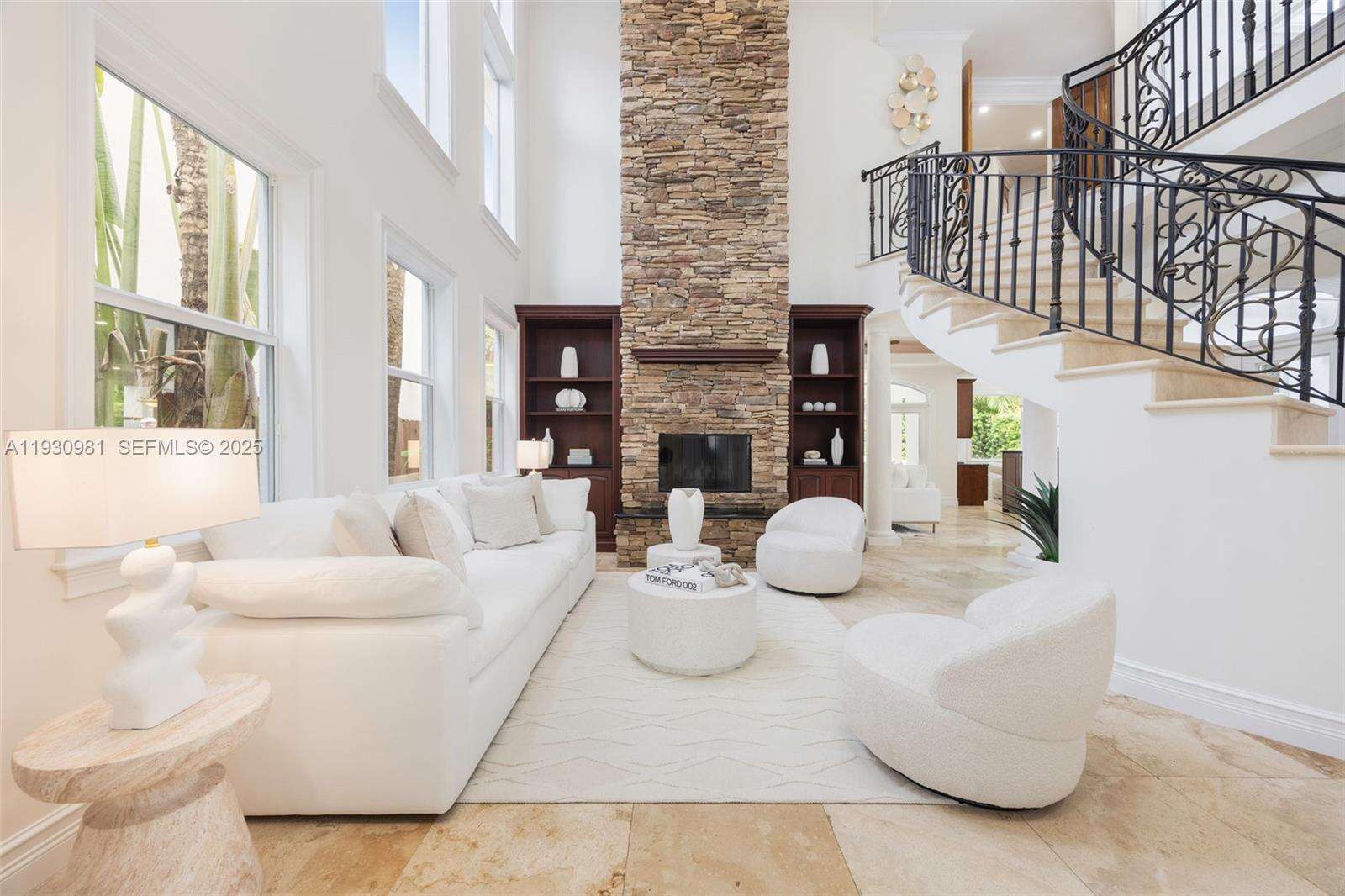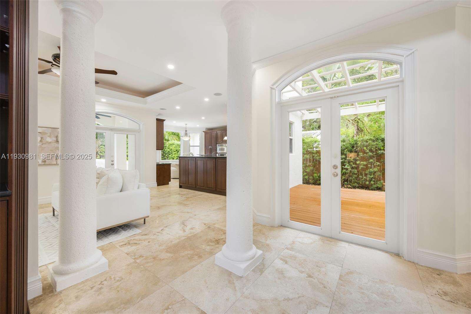 A gated Mediterranean-inspired retreat in South Coconut Grove, this two-story residence blends elegant design with seamless indoor-outdoor living. A dramatic central staircase anchors the open-plan main level, featuring a vaulted living room, formal dining, and a chef’s kitchen with access to private outdoor terraces. The lush backyard offers a pool with fountains, spa, summer kitchen, and covered patio. Upstairs, the expansive primary suite boasts dual walk-ins, a spa bath, and a grand private terrace. Designer cabinetry, volume ceilings, and a voluminous second-floor living area complete this timeless Grove haven.