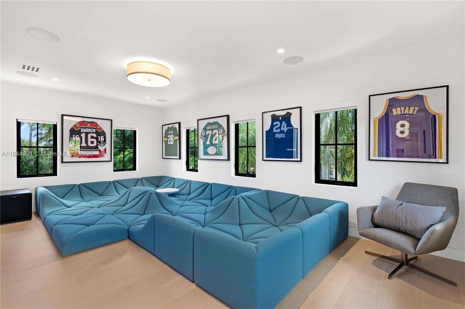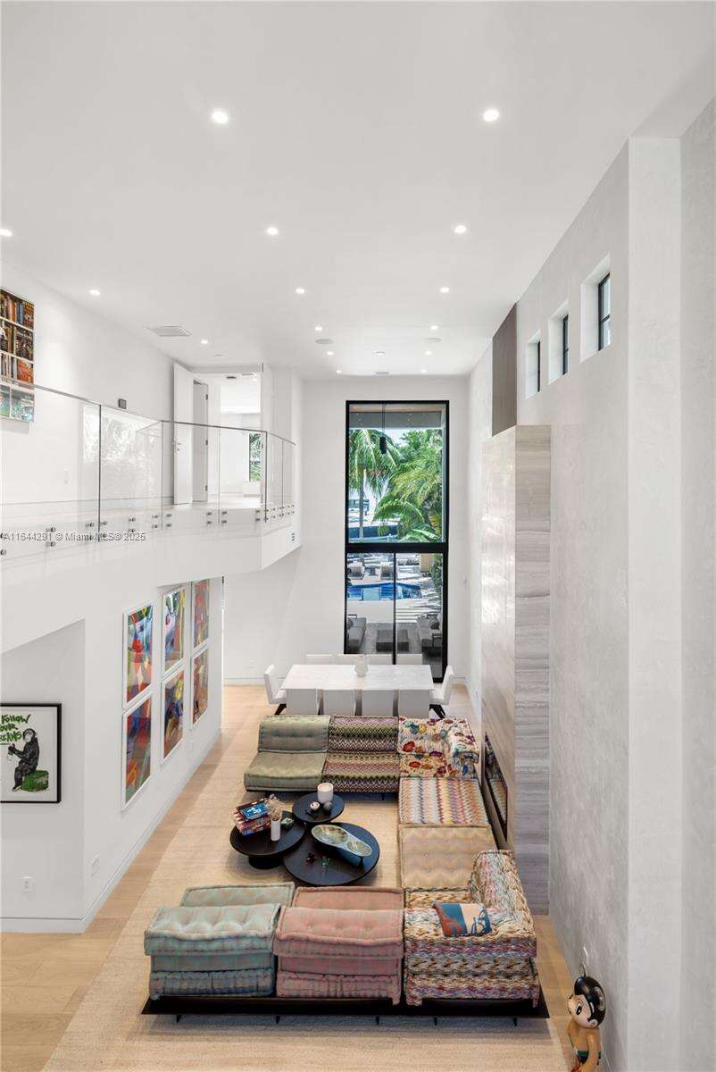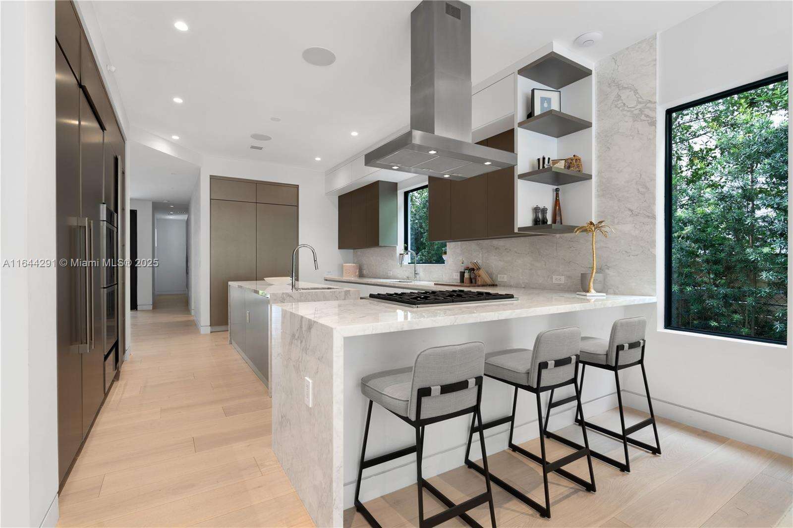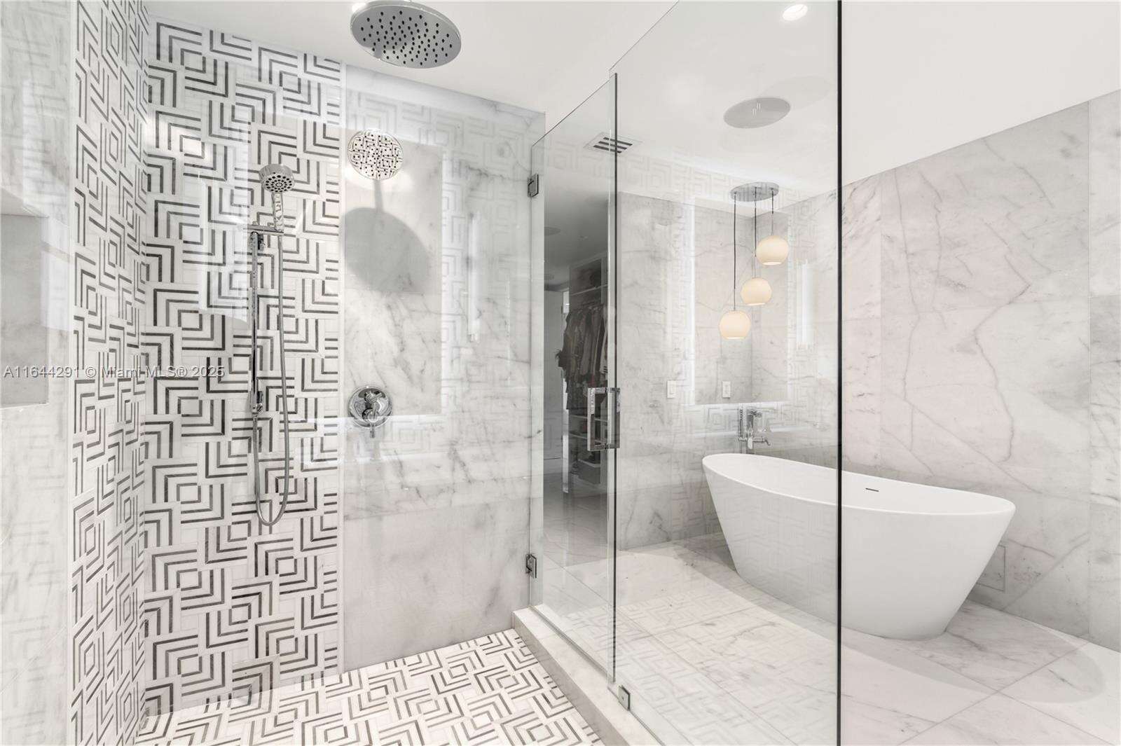 Dive into the tropical fully-renovated turnkey waterfront Modern Mediterranean villa boasts 6 beds/7 baths w/ white oak wood floors, arched doorways, floor to ceiling glass windows unveil natural light & water views. Gather by the fireplace & entertain in the living room w/ 20 ft high ceilings, a built-in bar and a kitchen with high end appliances, fridge & sink with marble countertops. Primary suite brand new custom master closets, outdoor balcony, views of the water, dual vanities & oversized soaking tub. Brand new floor to ceiling new glass doors blur the lines between interior & exterior spaces. 2 car garage. Auto-blinds offer privacy & light control as well. In the backyard there is an outdoor BBQ, pizza oven, pool & spa, sauna & cold plunge, covered terrace, new dock w/ shore power.