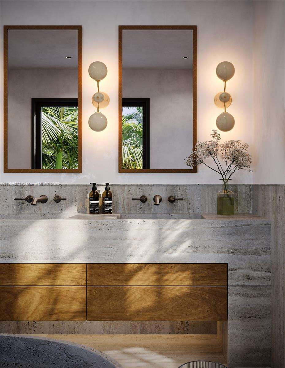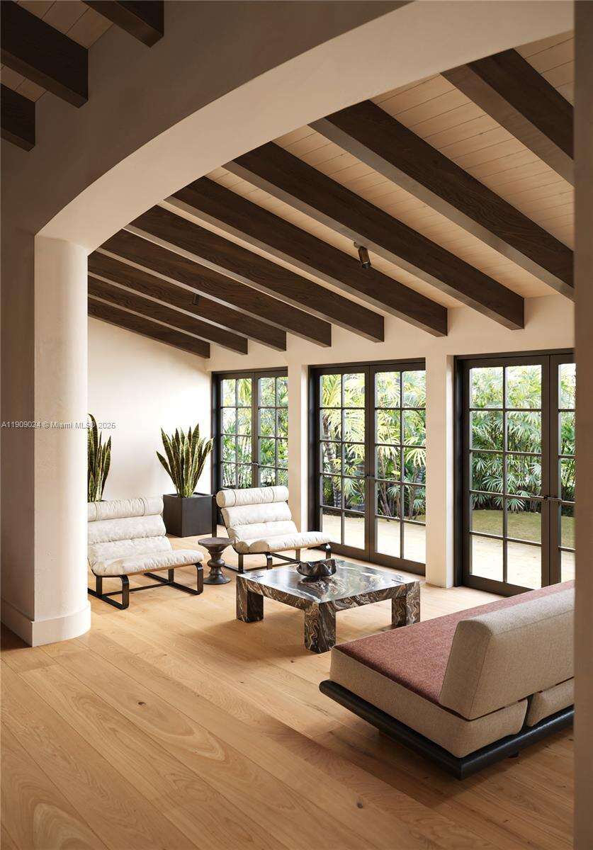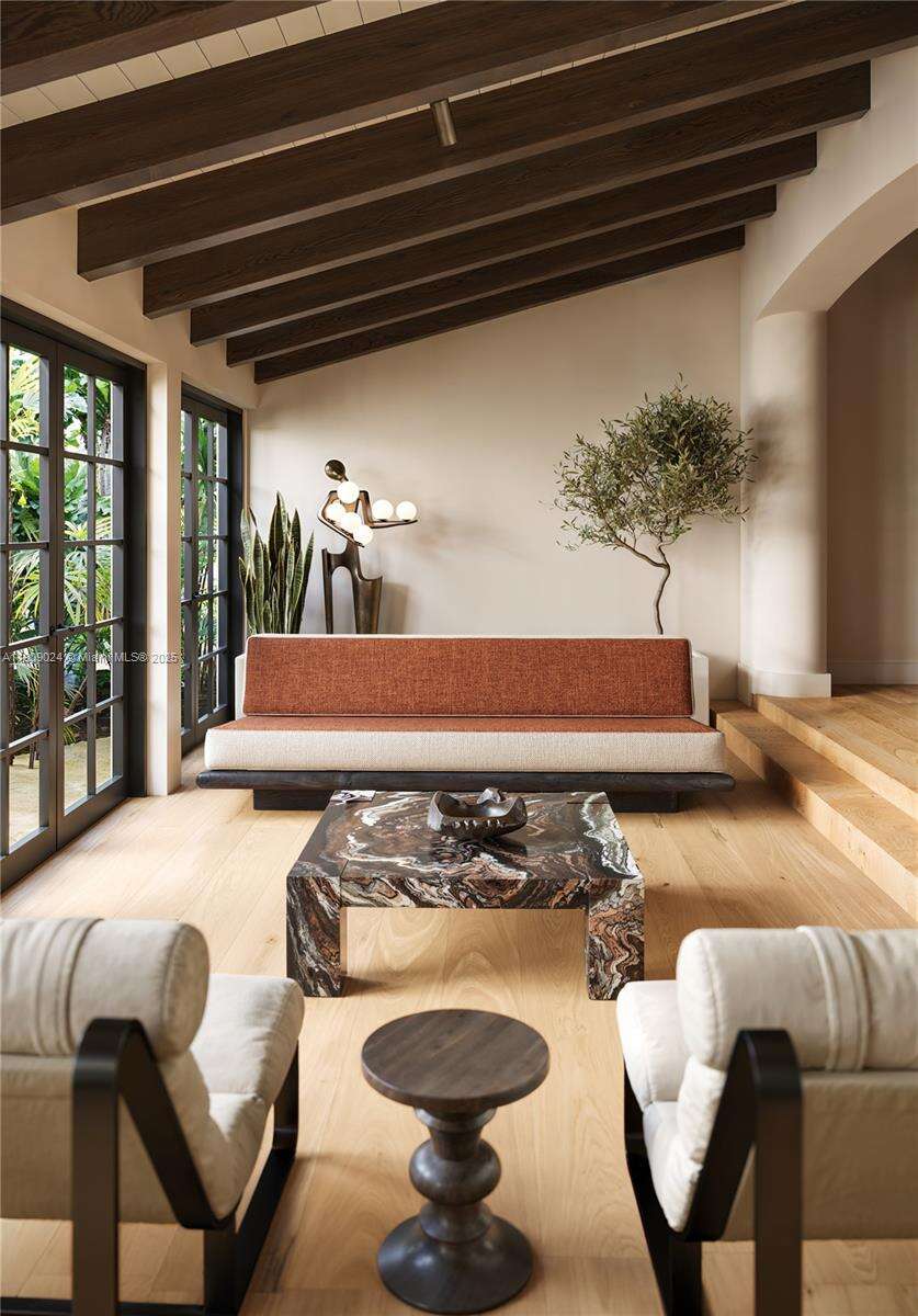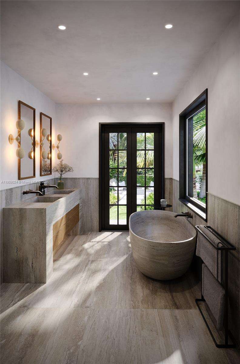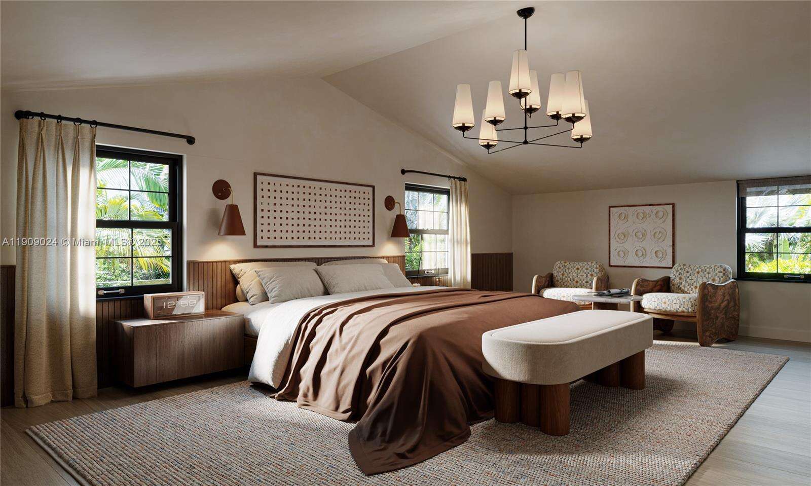 LOCATED ON PRESTIGIOUS NORTH BAY ROAD THIS CHARMING MEDITERRANEAN FAMILY VILLA IS WRAPPED IN LUSH GREENERY FOR TOTAL PRIVACY & SECURITY! Gated Entry into this Beautiful Family Home with Pool. Timeless Architecture reimagined with Modern Elegance on Iconic. Developed by Flagg with Carolwood & re-designed by BuiltIN studio/Gary Eisner, this approximate 4,000 square foot house sits on a 10,000 sqft estate, for resort style living. Main house offers 4BD/5BA, detached pool house with sauna and cold plunge, powder room, and outdoor shower. Soaring vaulted ceilings and new wood flooring throughout interiors anchored by an original limestone fireplace. White oak kitchen with SubZero appliances and Waterworks fixtures, travertine-accented baths, custom millwork, custom steel windows and doors.