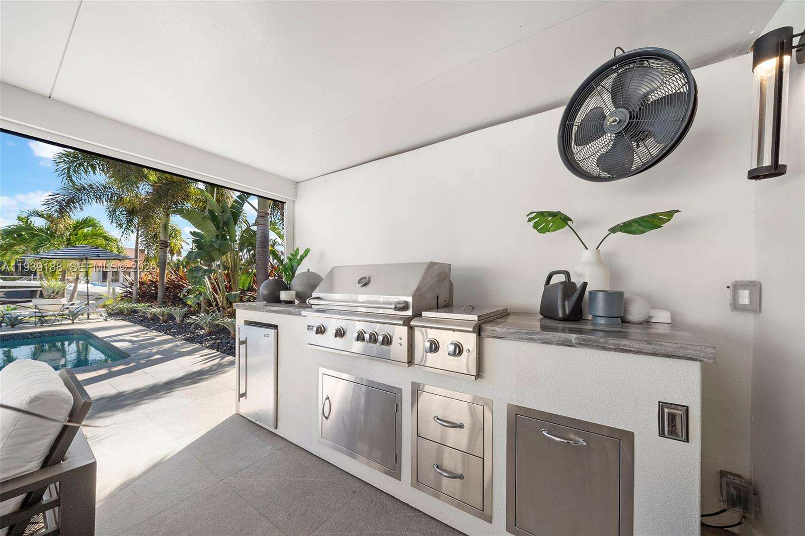Stunning one-story turn-key waterfront home in the gated community of Golden Isles with ocean access and no fixed bridge. This move-in-ready property features 3 bedrooms, 3 bathrooms, large den / possible 4th bedroom and two-car garage, spacious living and dining areas with porcelain floors throughout. Enjoy stunning water views down the T-canal with beautiful sunrise views. Lushly landscaped backyard surrounds the summer kitchen, patio deck and heated/chilled pool, a perfect setting for year-round outdoor entertaining. Ideal for boating and yachting enthusiasts, the deep-water dock offers wide canal access and excellent depth for your vessel and water toys. The dock has a Tide Slide System to accommodate yachts up to 84 feet. Some of the upgrades include new roof (2017), new A/C systems (2024), Impact Windows and Doors, Motorized blinds, natural gas to property for the summer kitchen and the new whole home generator. Golden Isles is located between Miami and Fort Lauderdale, just minutes to world-class shopping at Aventura Mall and Bal Harbour Shops, as well as convenient access to both International and Private Airports. A rare opportunity to own a turn-key waterfront home offering luxury, comfort, and the ultimate South Florida waterfront lifestyle.